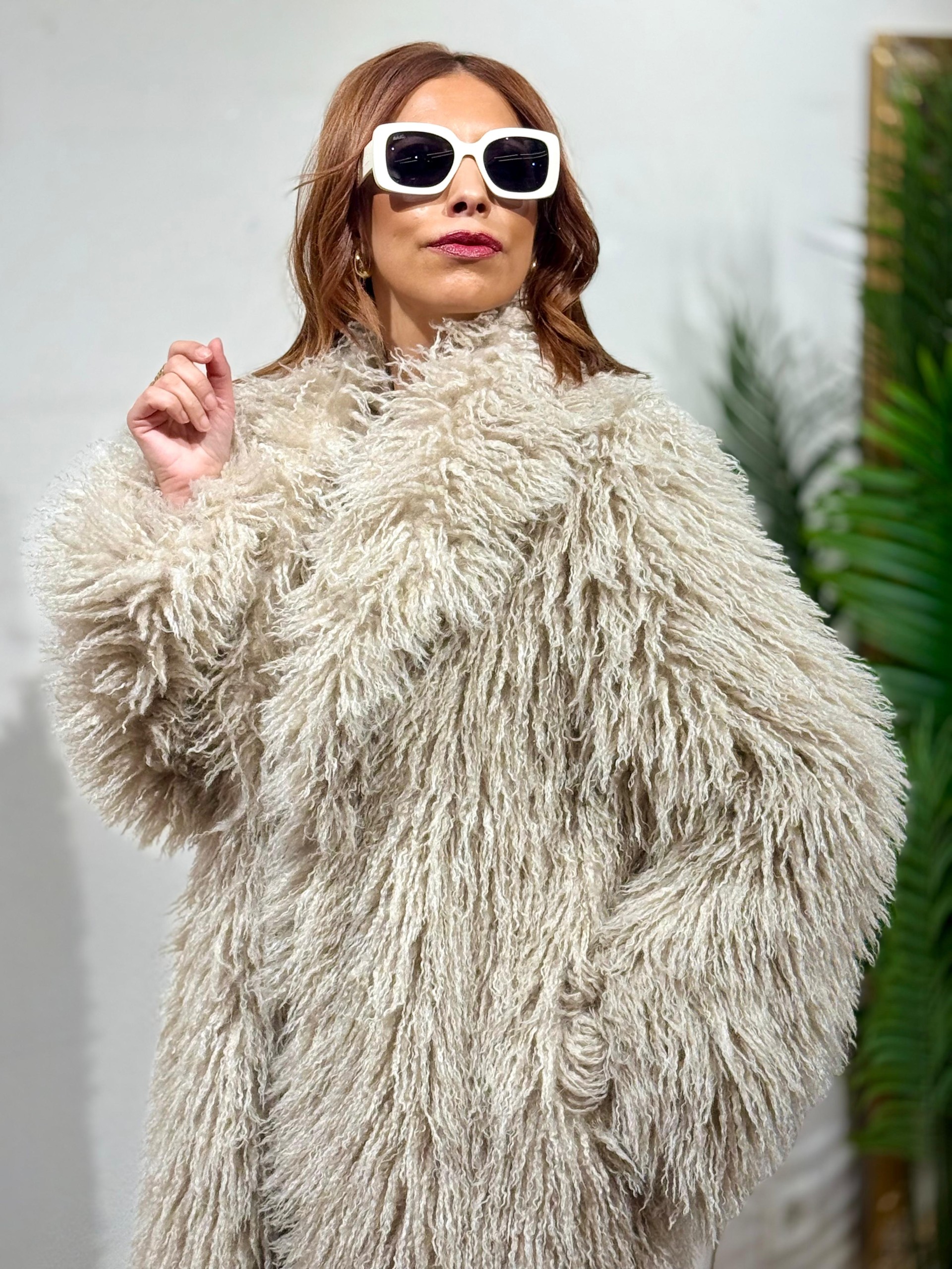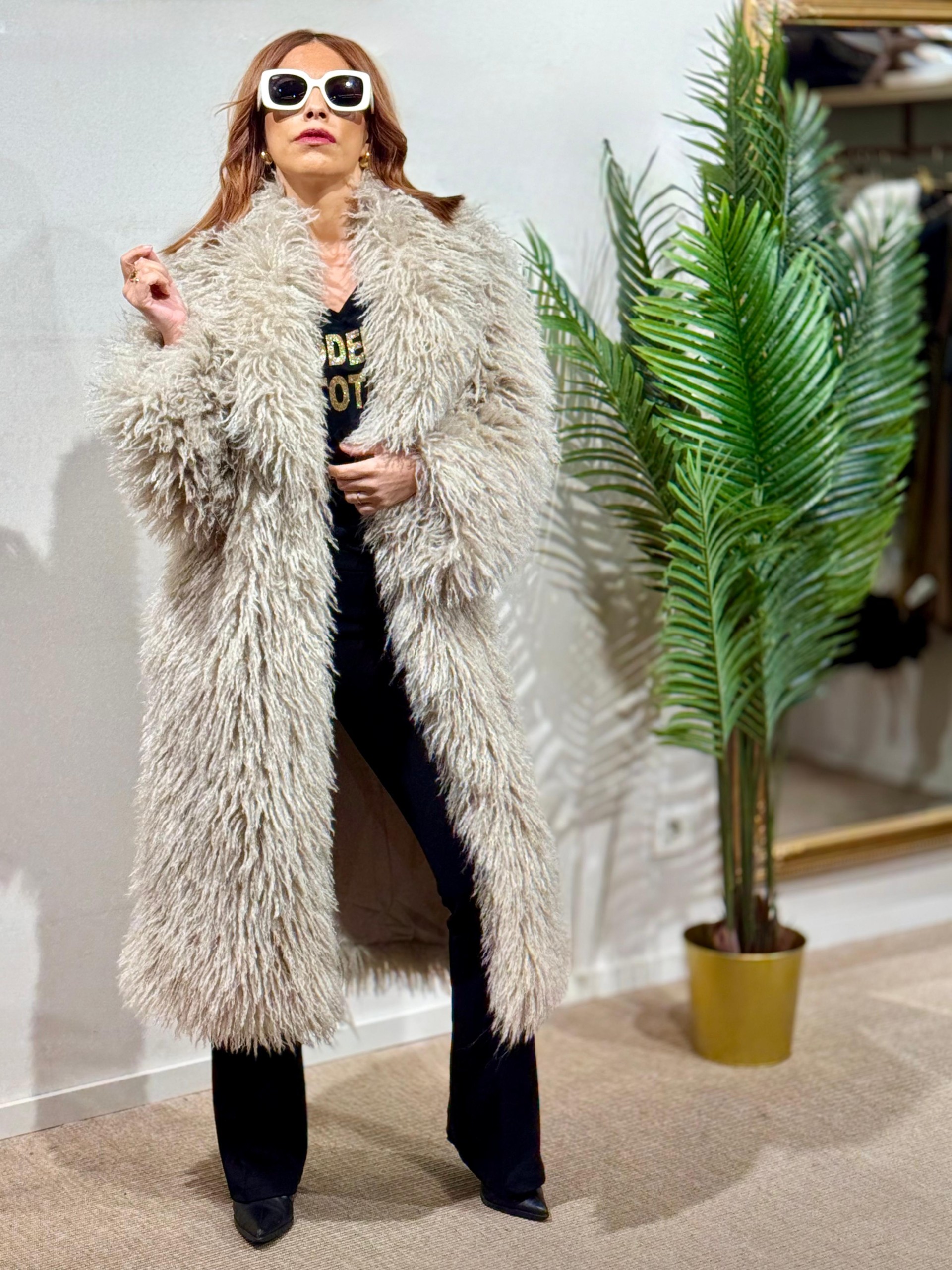 Abrigo pelo rizado largo beige. Lleva forro interior y bolsillos. Cierre central y solapas.