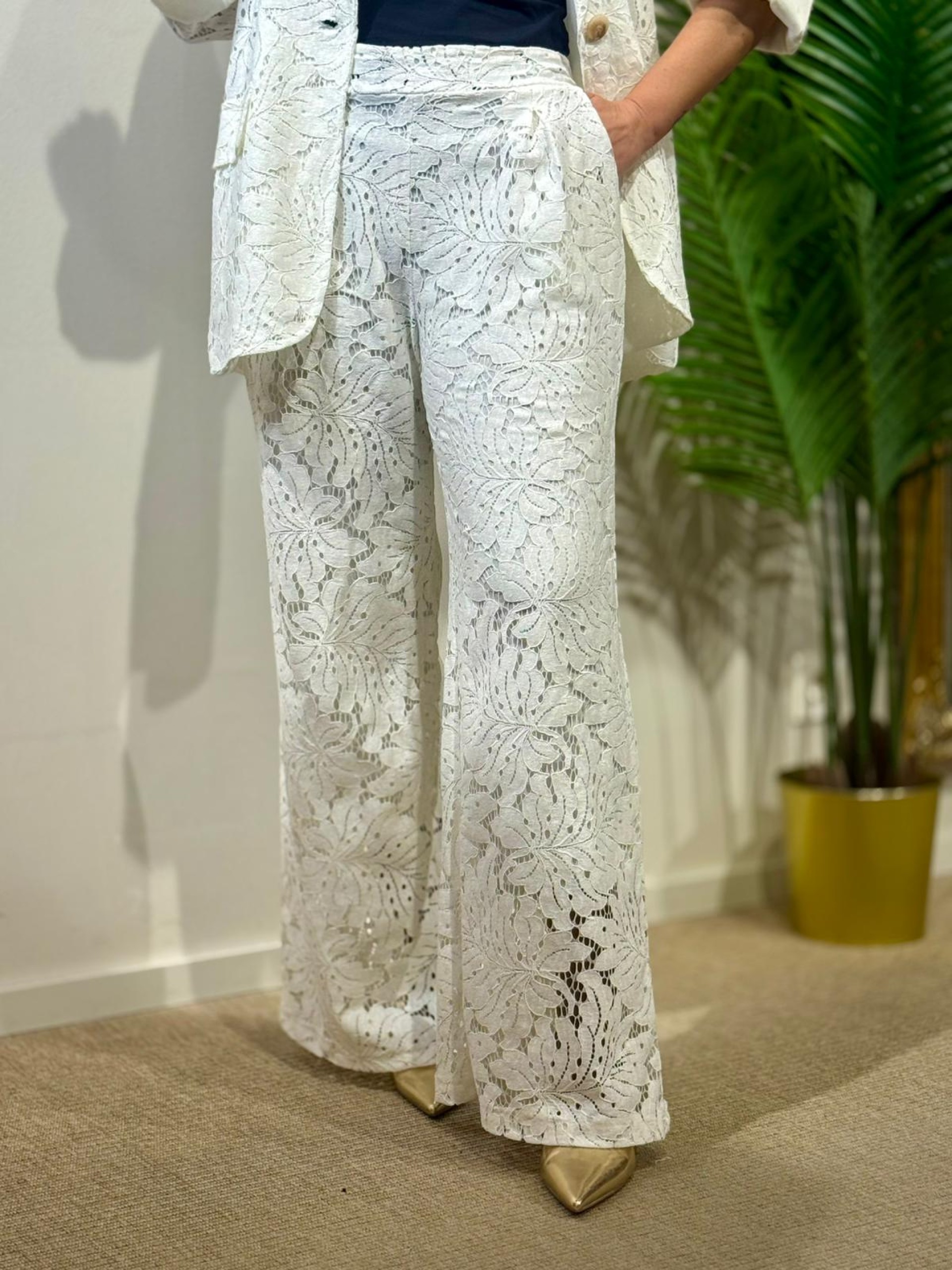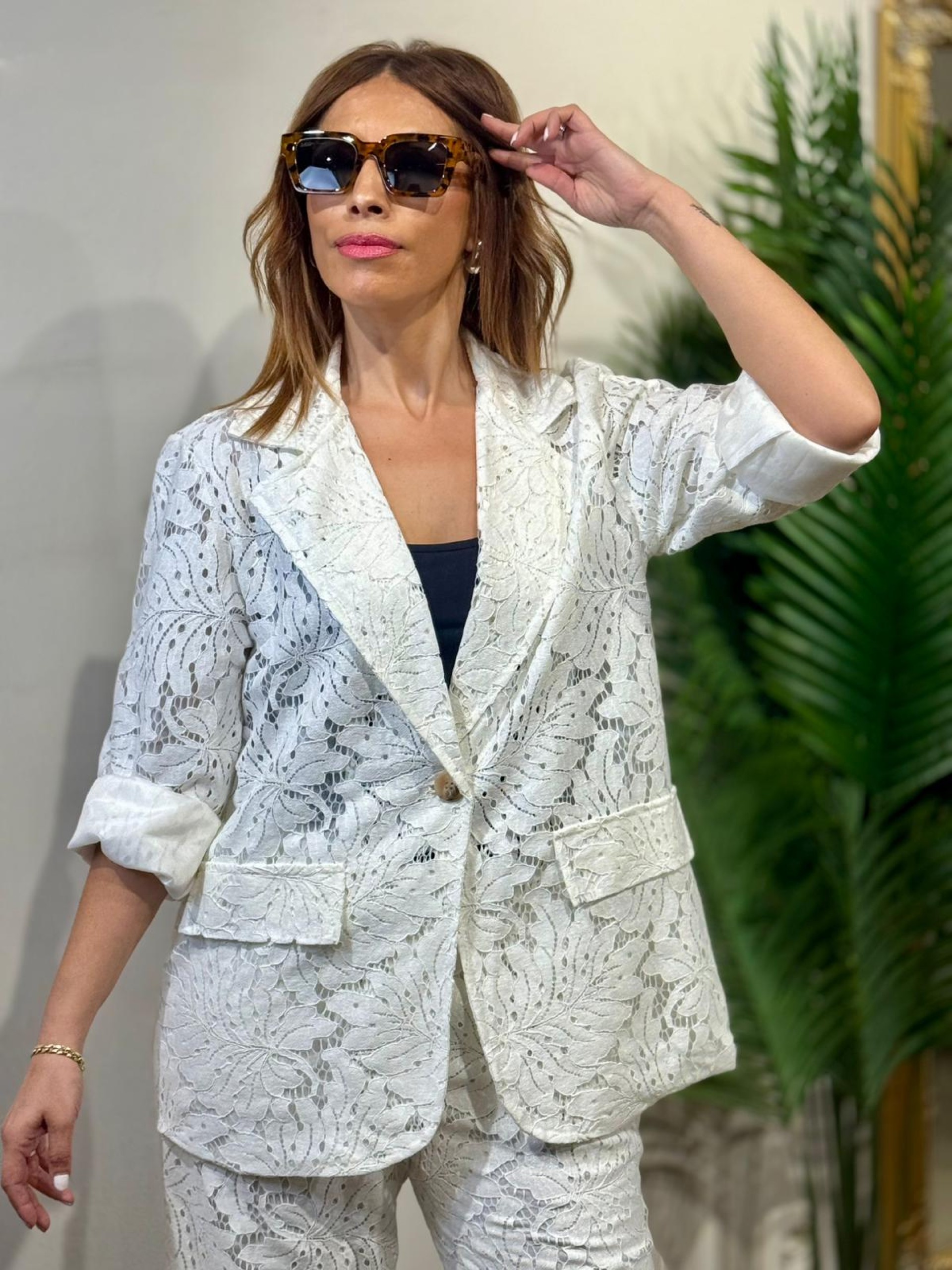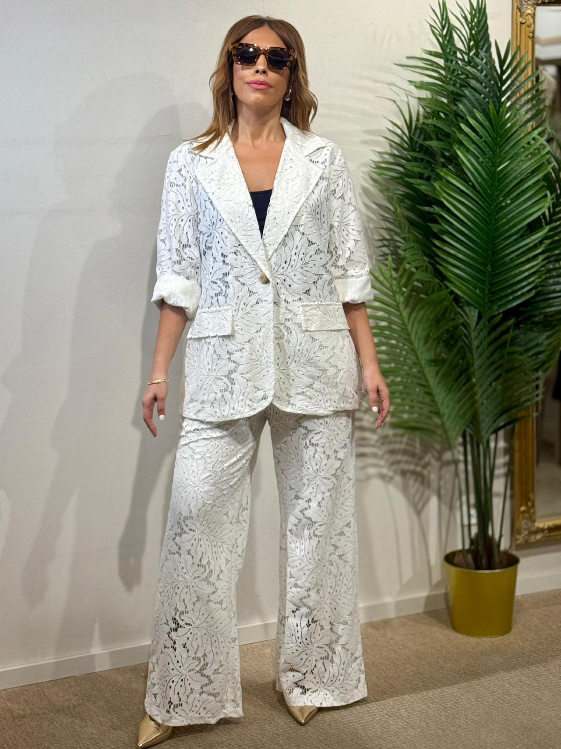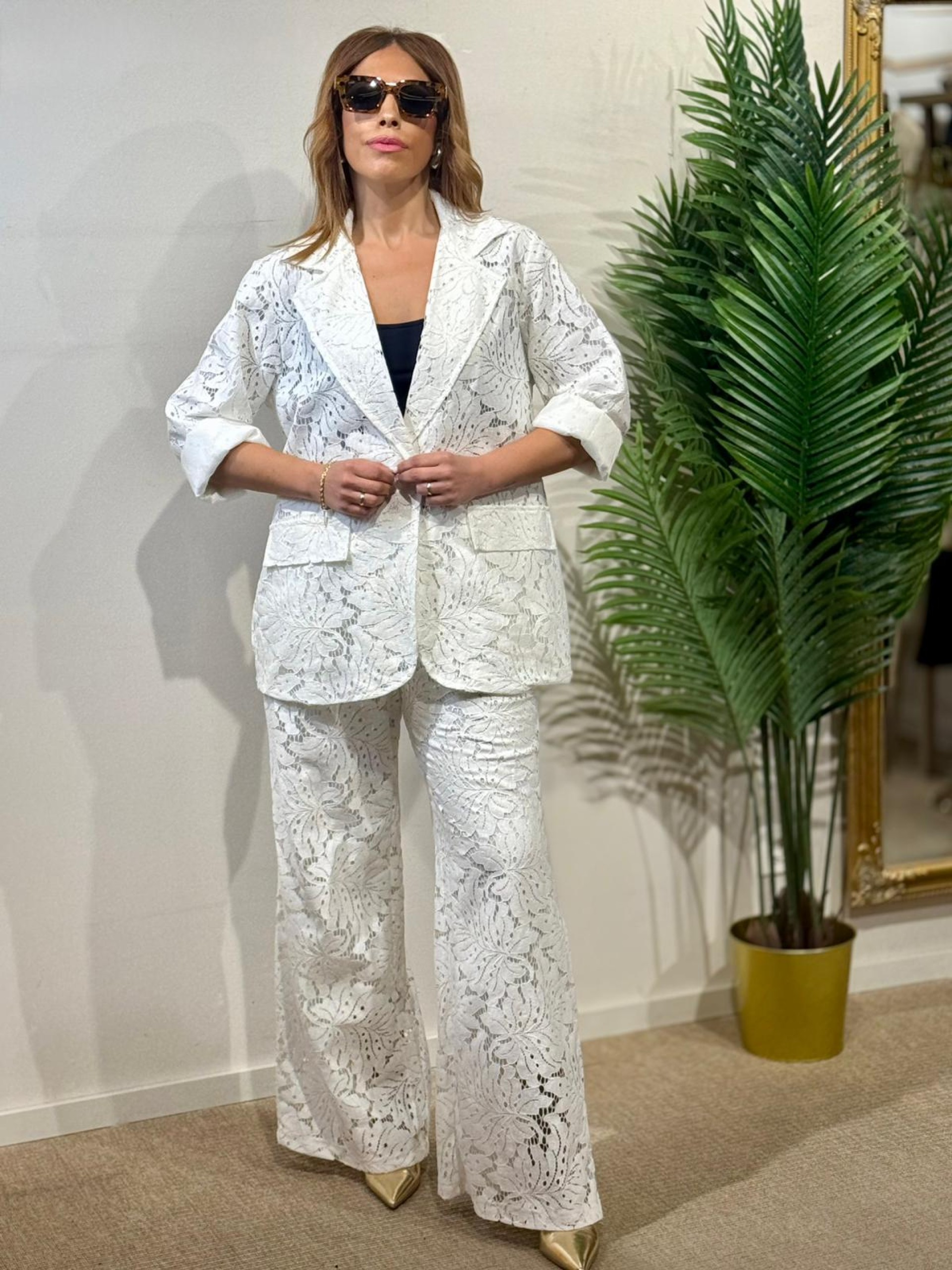 Conjunto chaqueta y pantalón encaje blanco. Chaqueta corte recto y over con botonadura central. Pantalones engomado en cintura de pata ancha y bolsillos laterales.