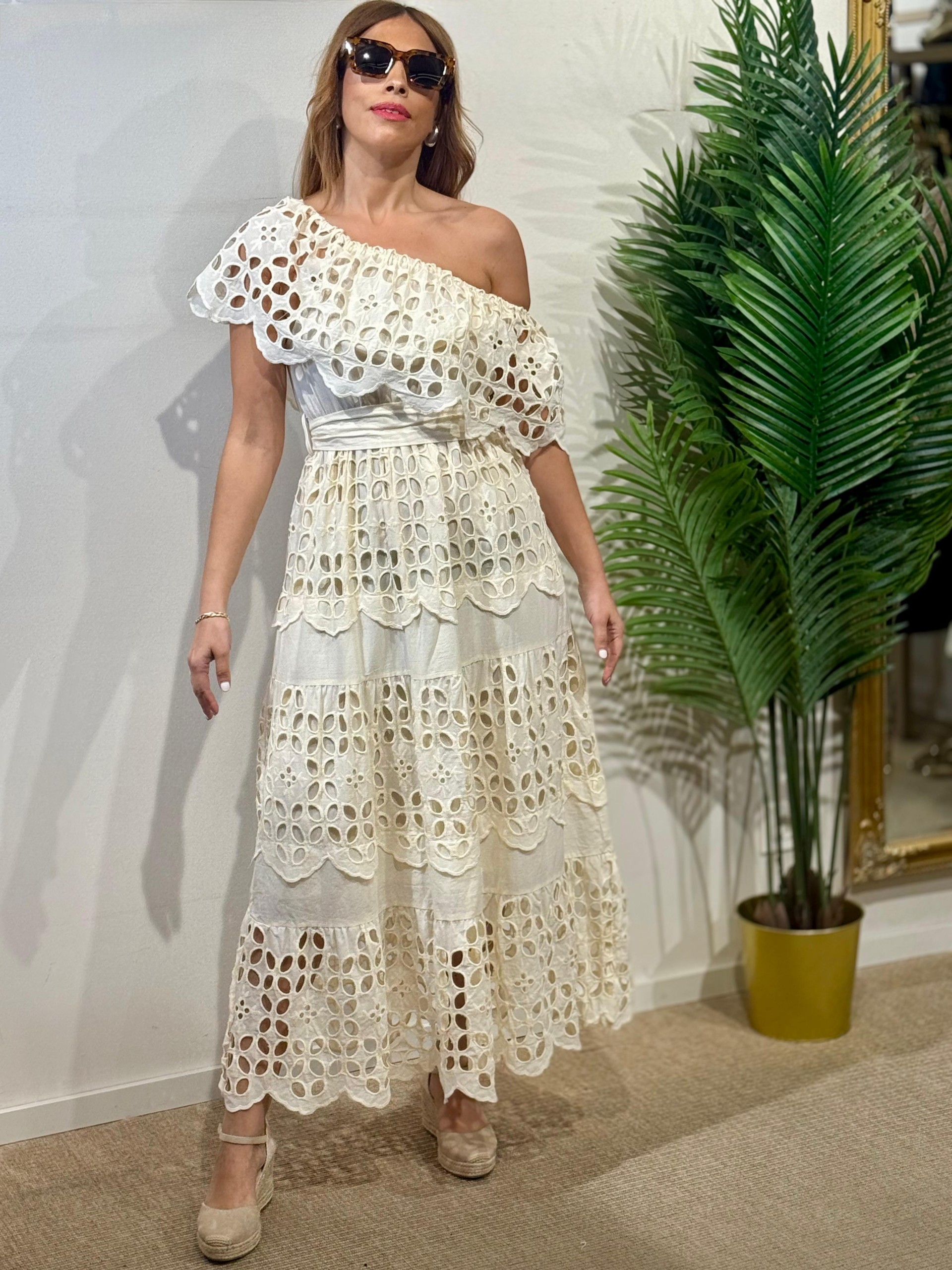 Vestido troquelado volante vainilla.