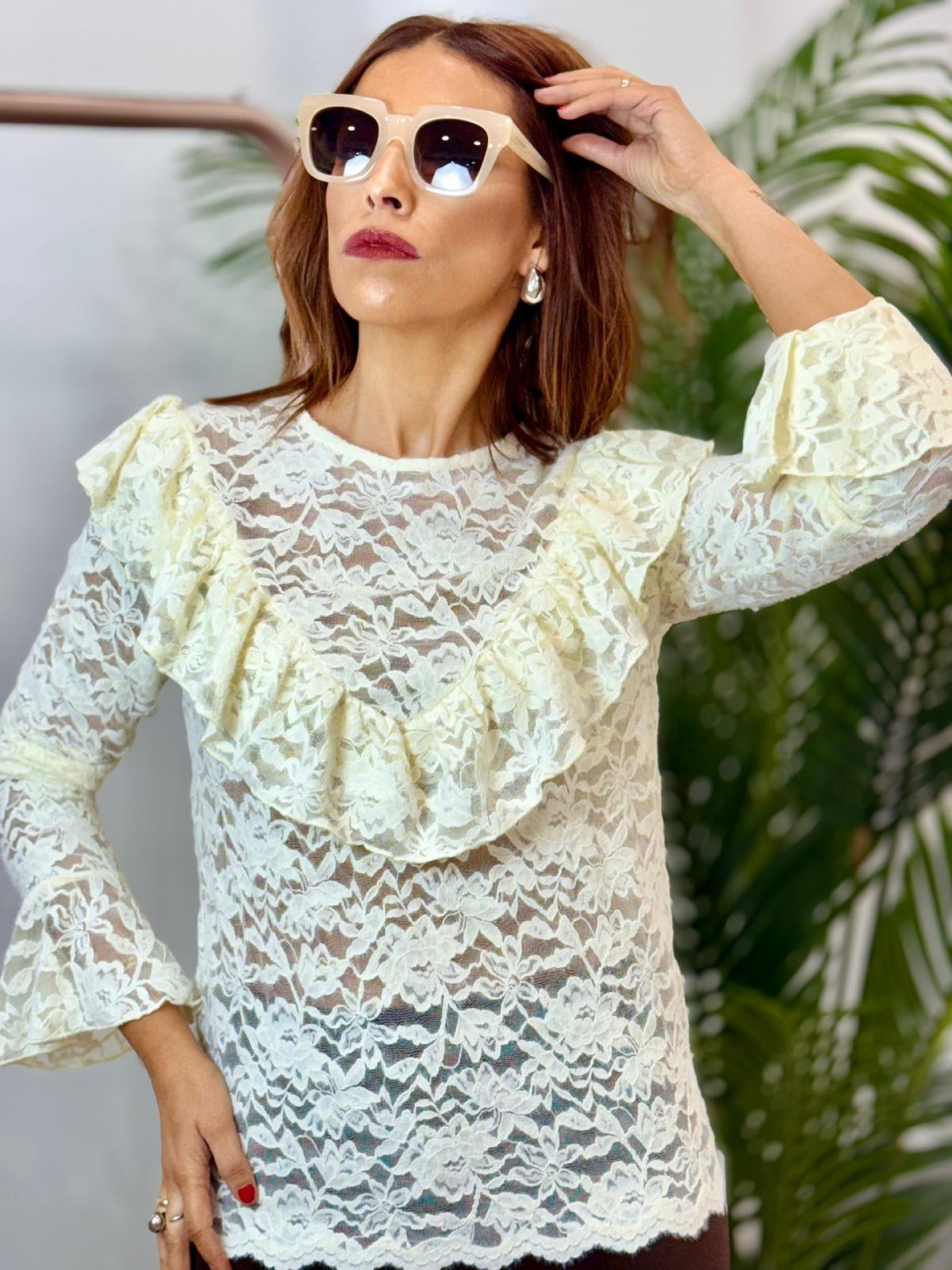 Blusa volantes croché cruda. Lleva Volantes en escote y puños.