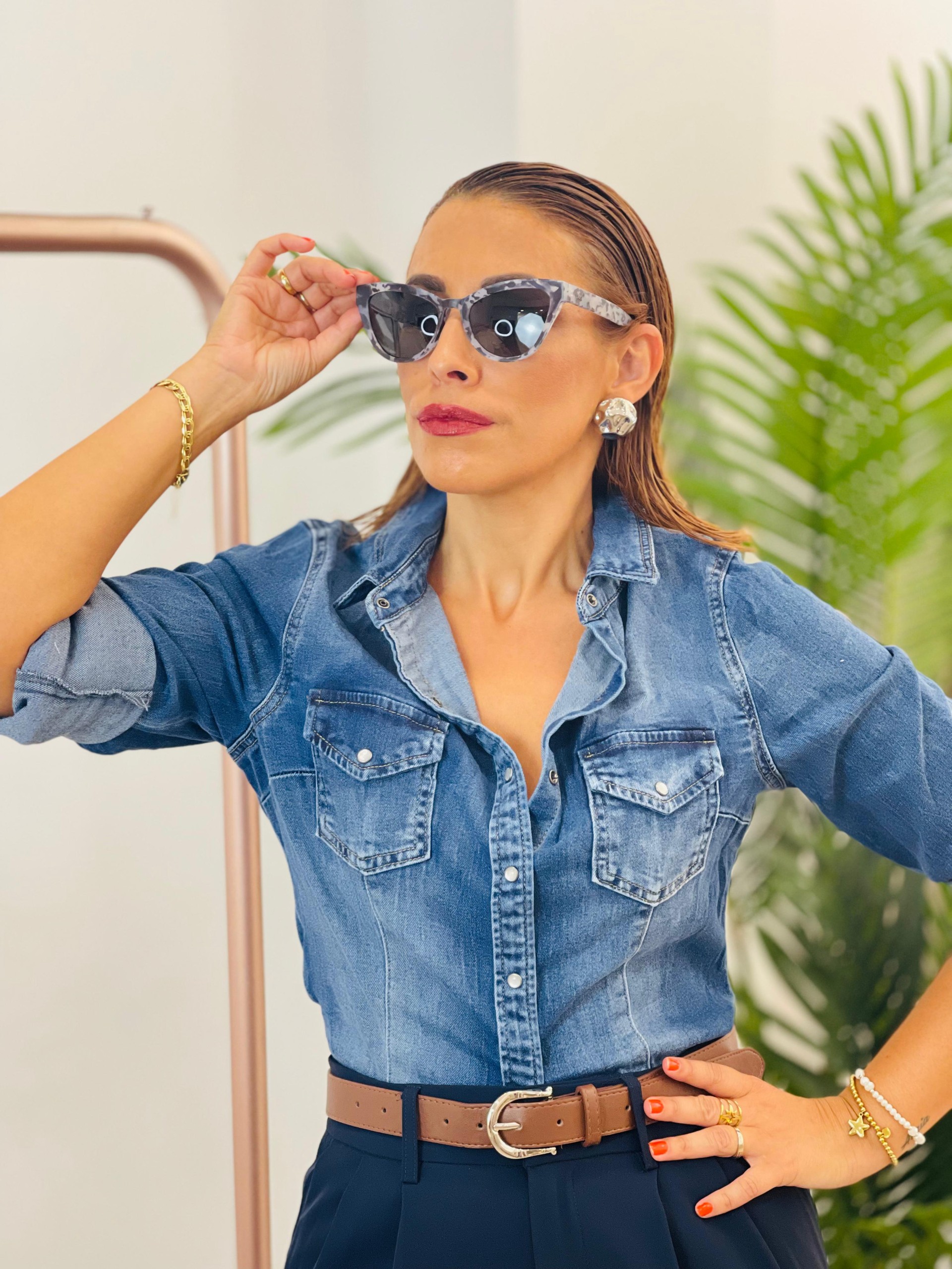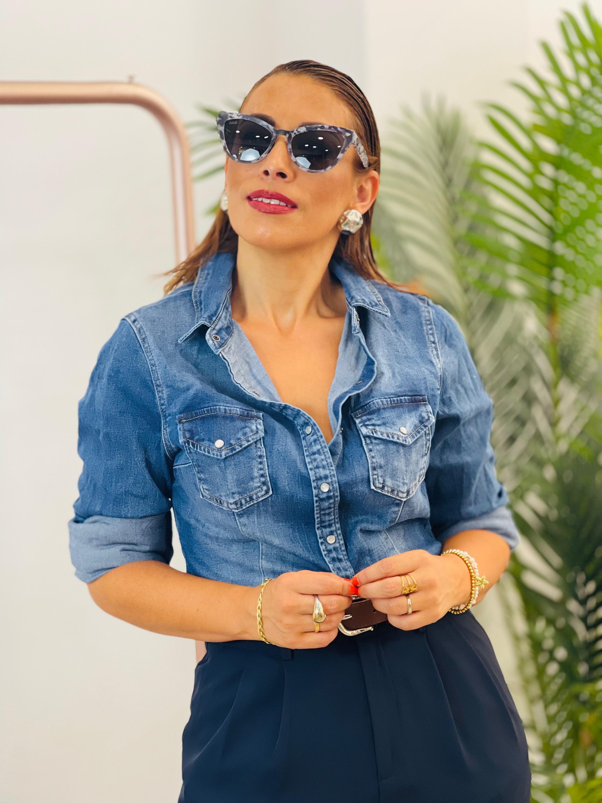 Camisa vaquera efecto desgastado. Corte entallado con bolsillos y botonadura central. Tejido denim que contiene elastan.