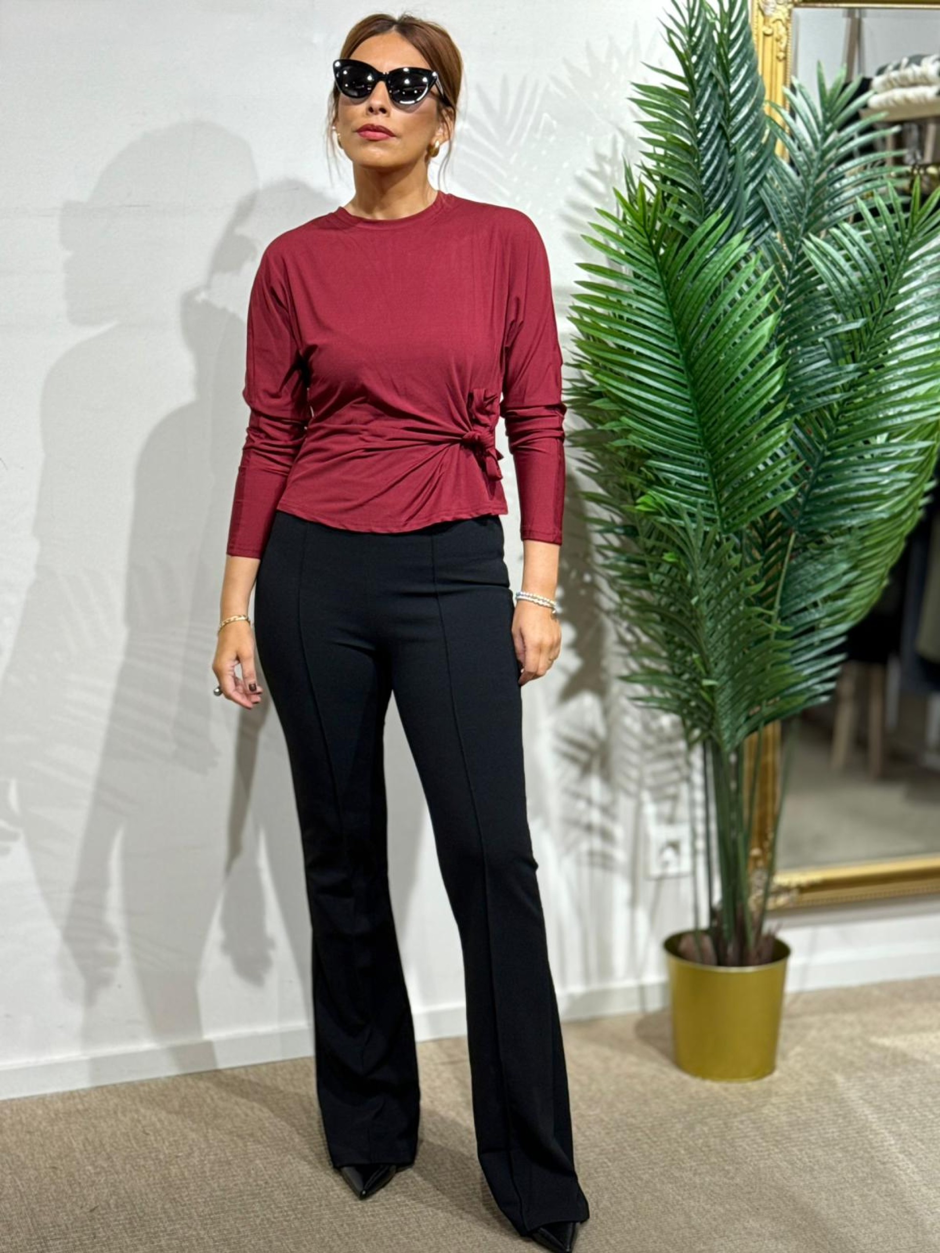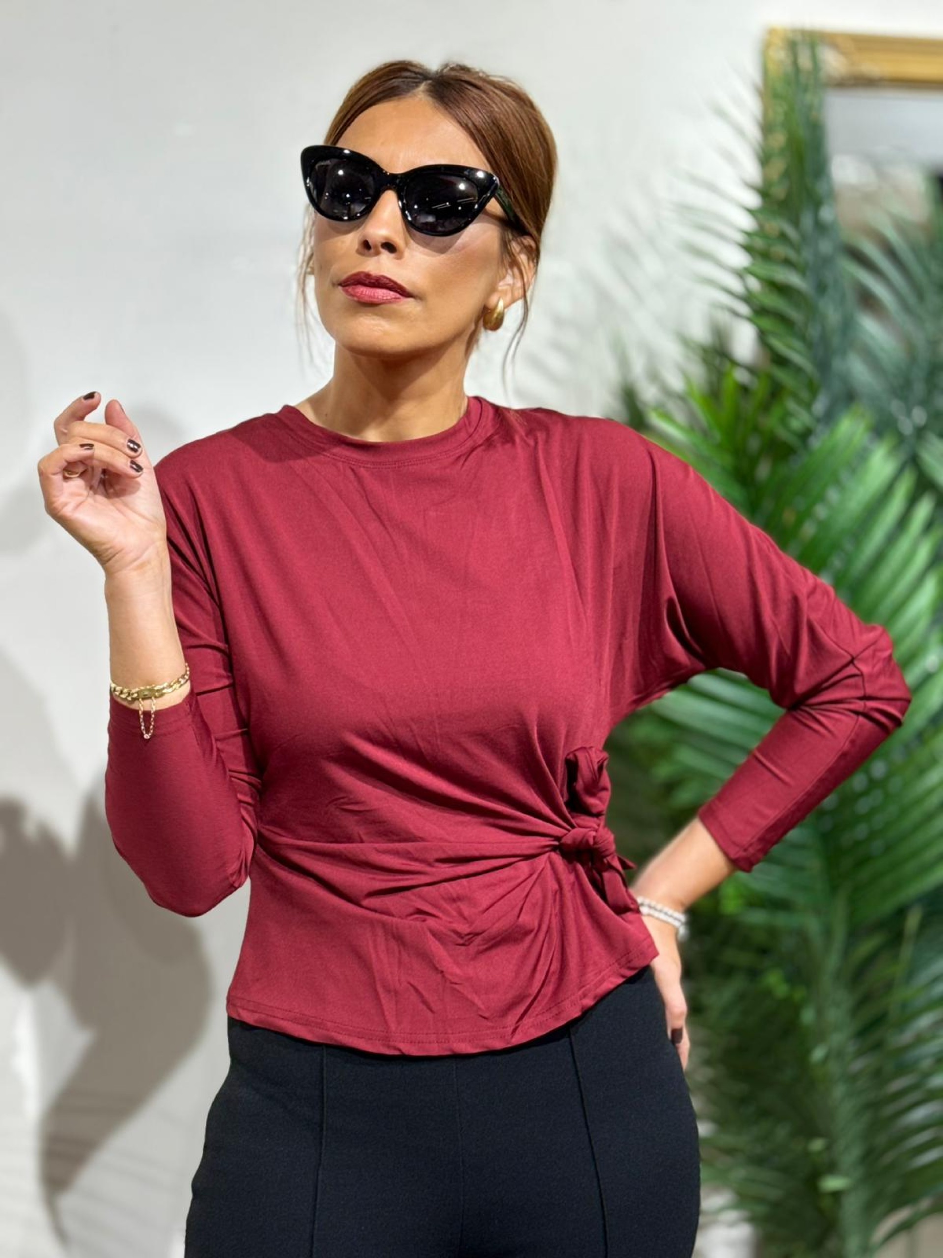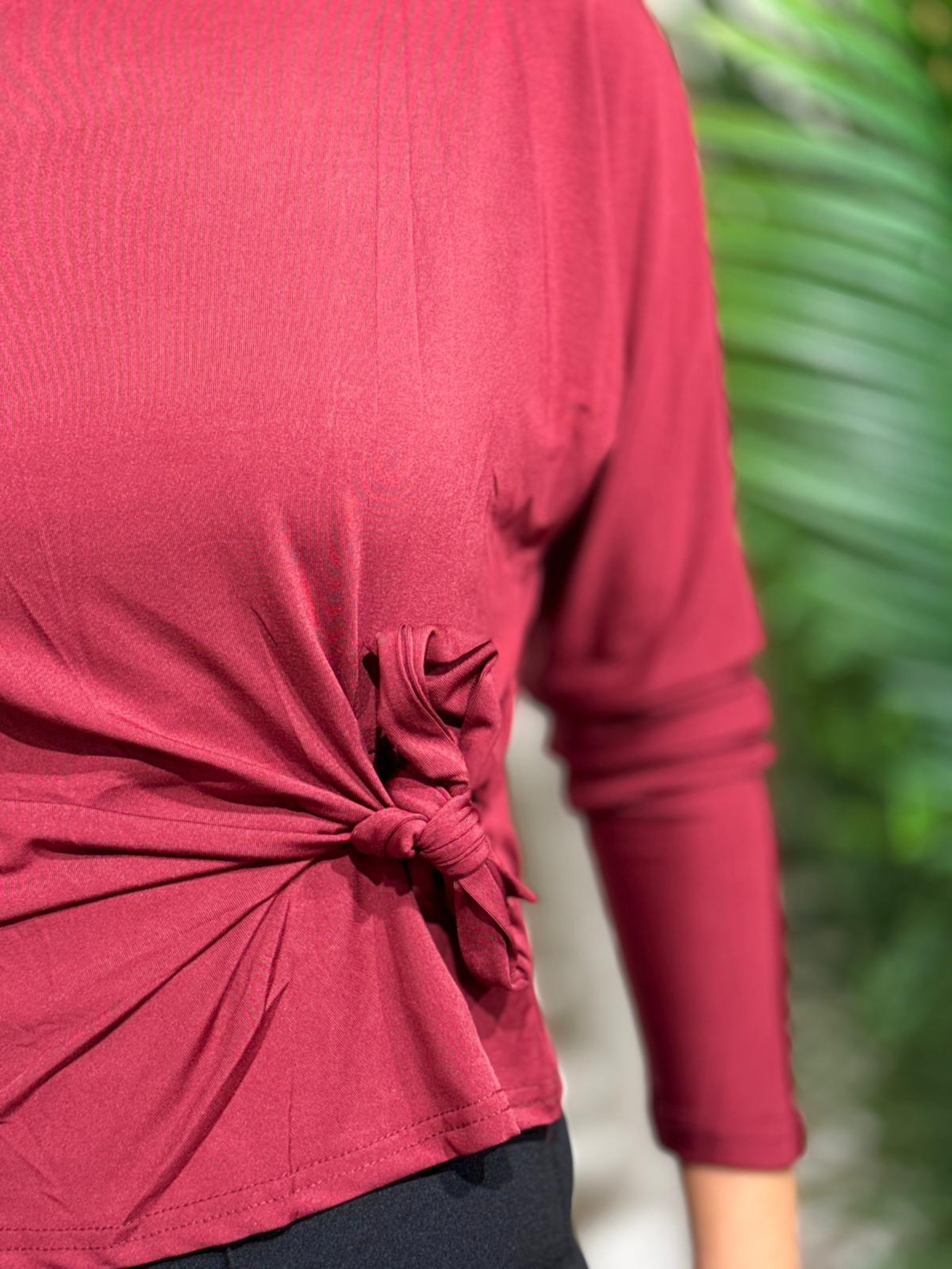 Camiseta drapeada lazo granate. Manga larga con ligero efecto murciélago ajustada en puños. Contiene elastan.