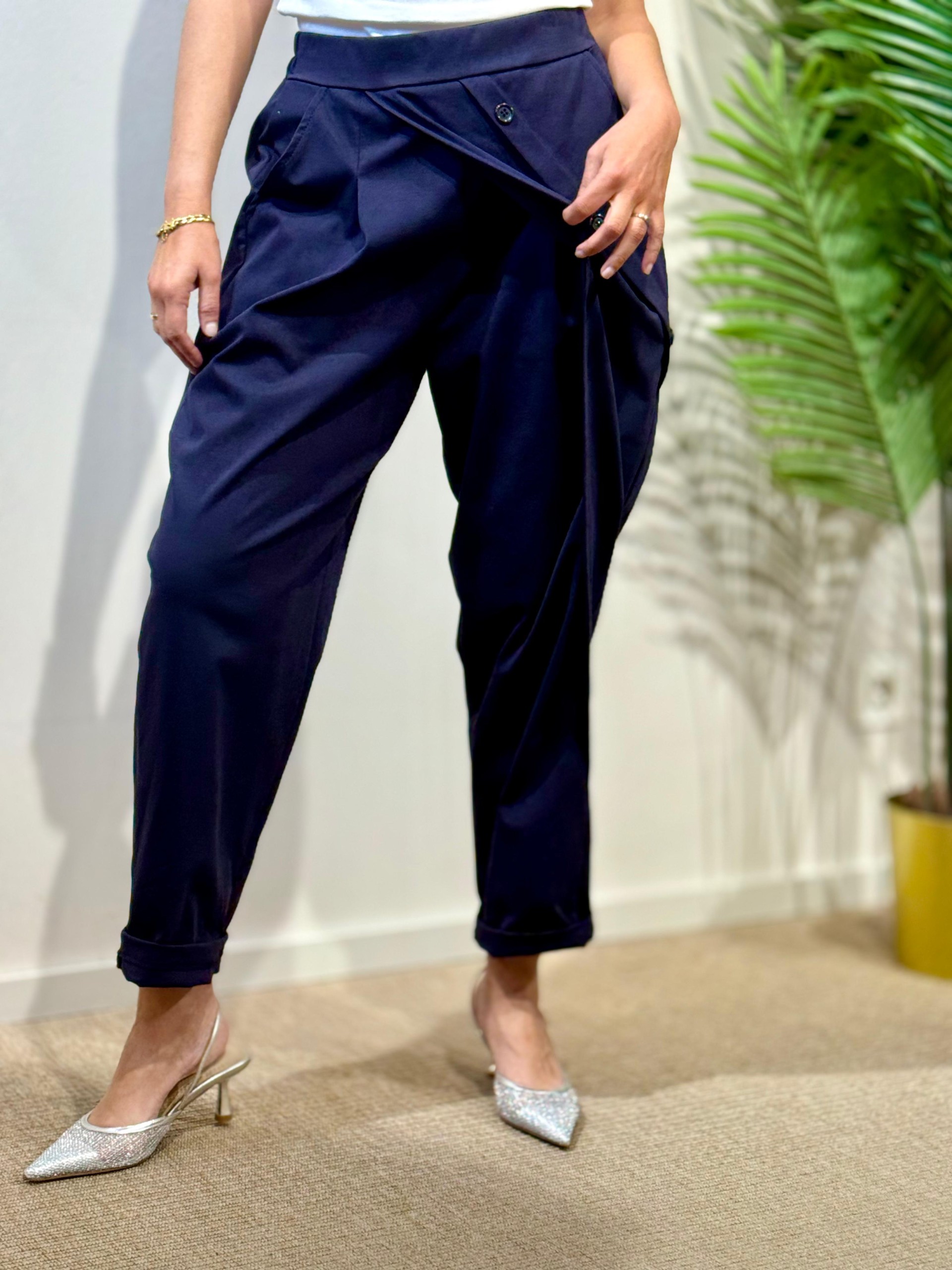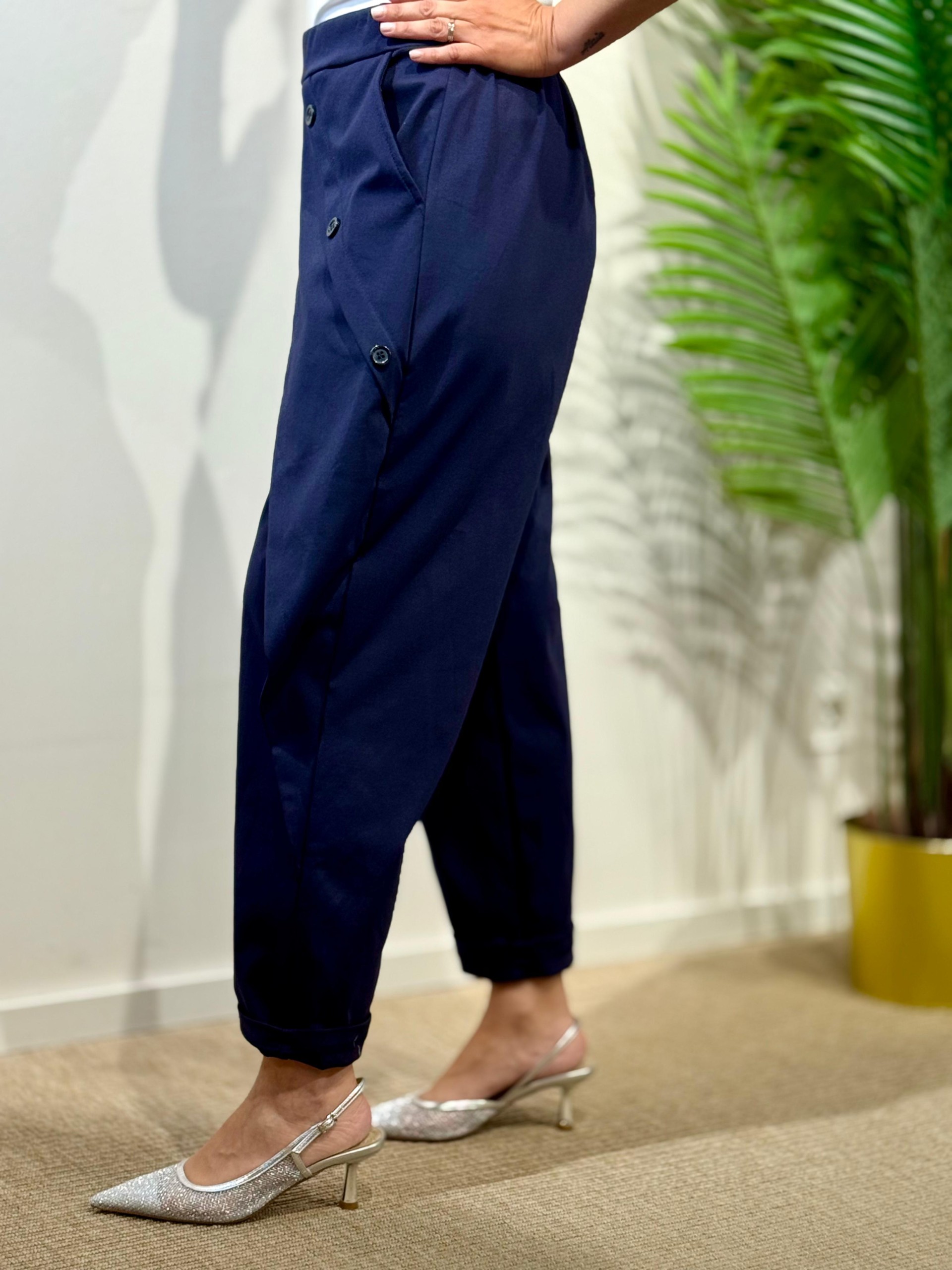 Pantalón Baggie Botones Azul marino. Engomado en cintura y Lleva Bolsillos laterales.