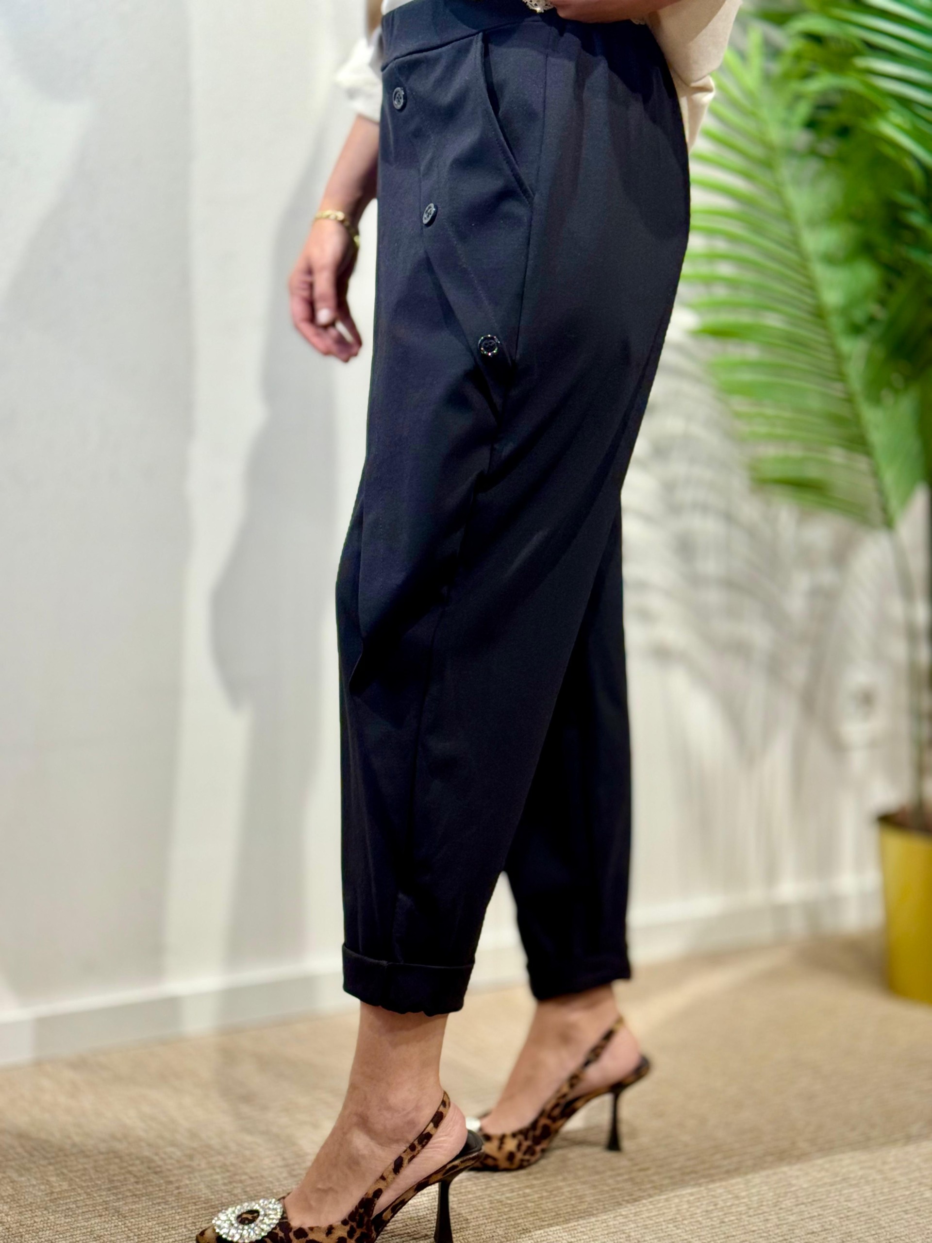 Pantalón Baggie Botones Negro. Engomado en cintura y Lleva Bolsillos laterales.