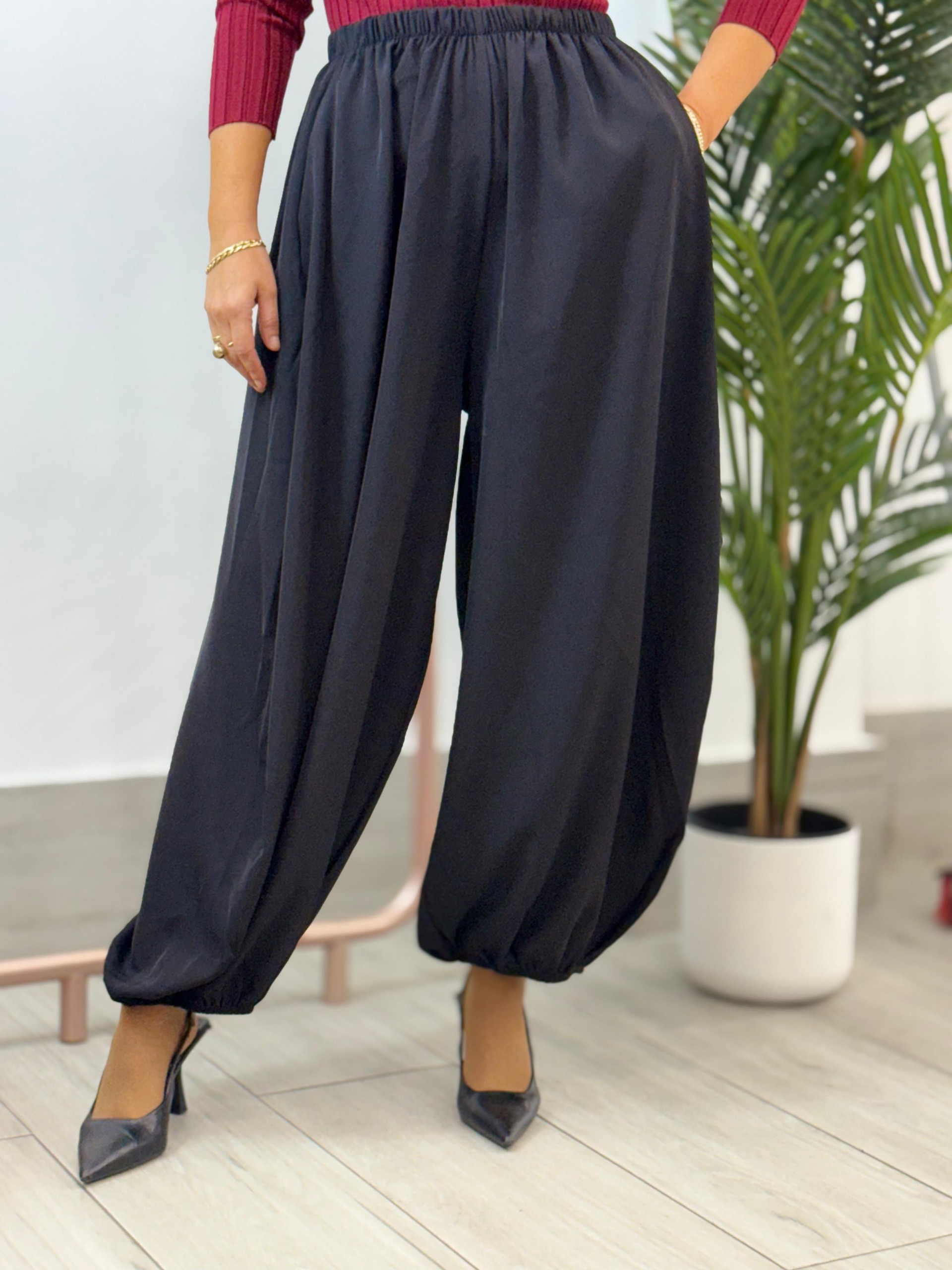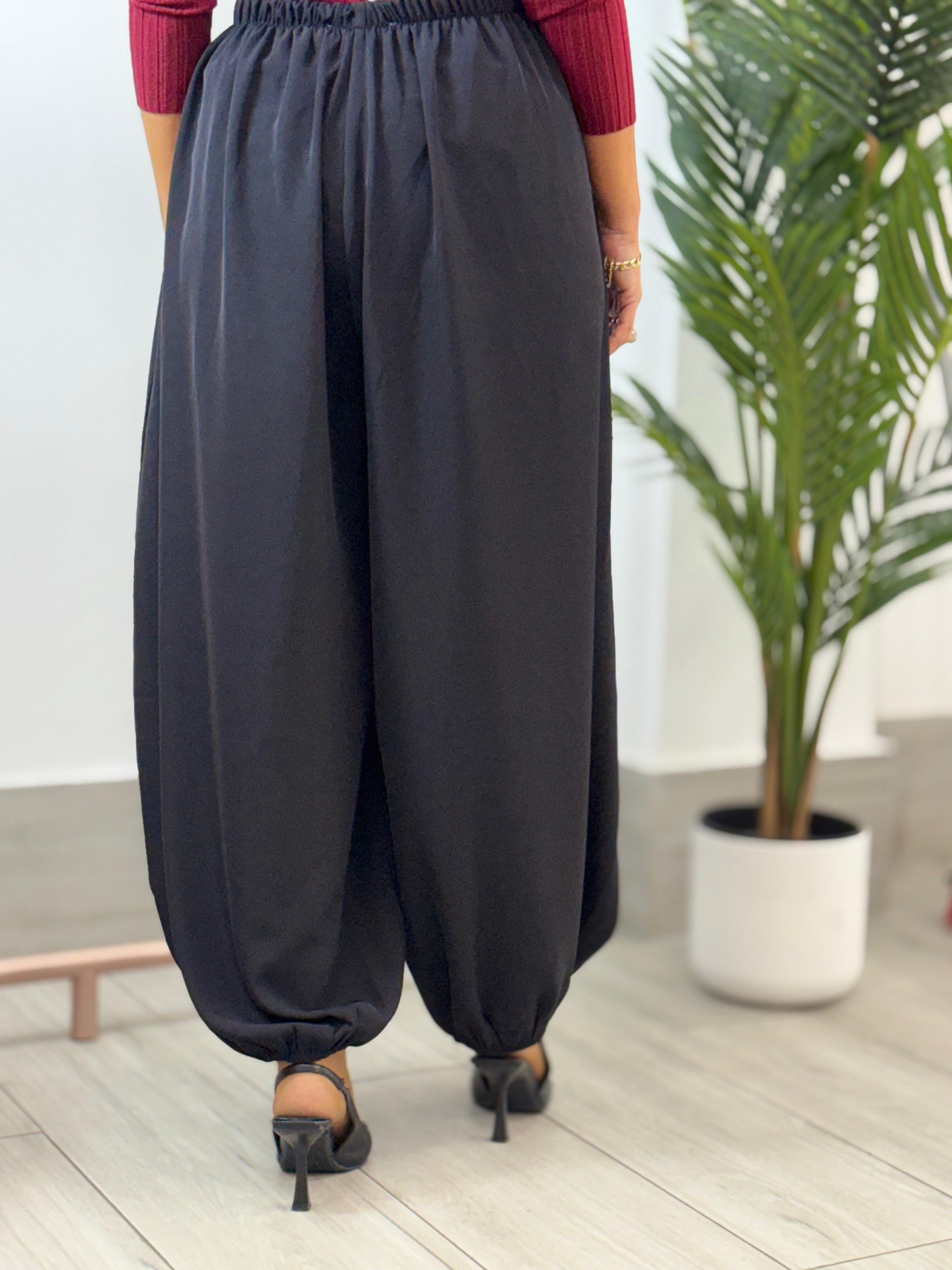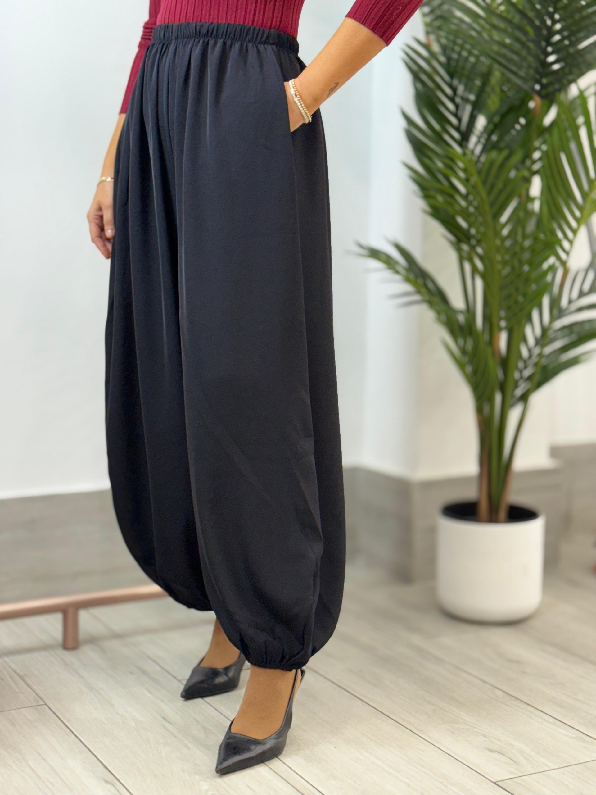 Pantalón bombacho negro. Engomado en bajo y cintura. Lleva bolsillos.