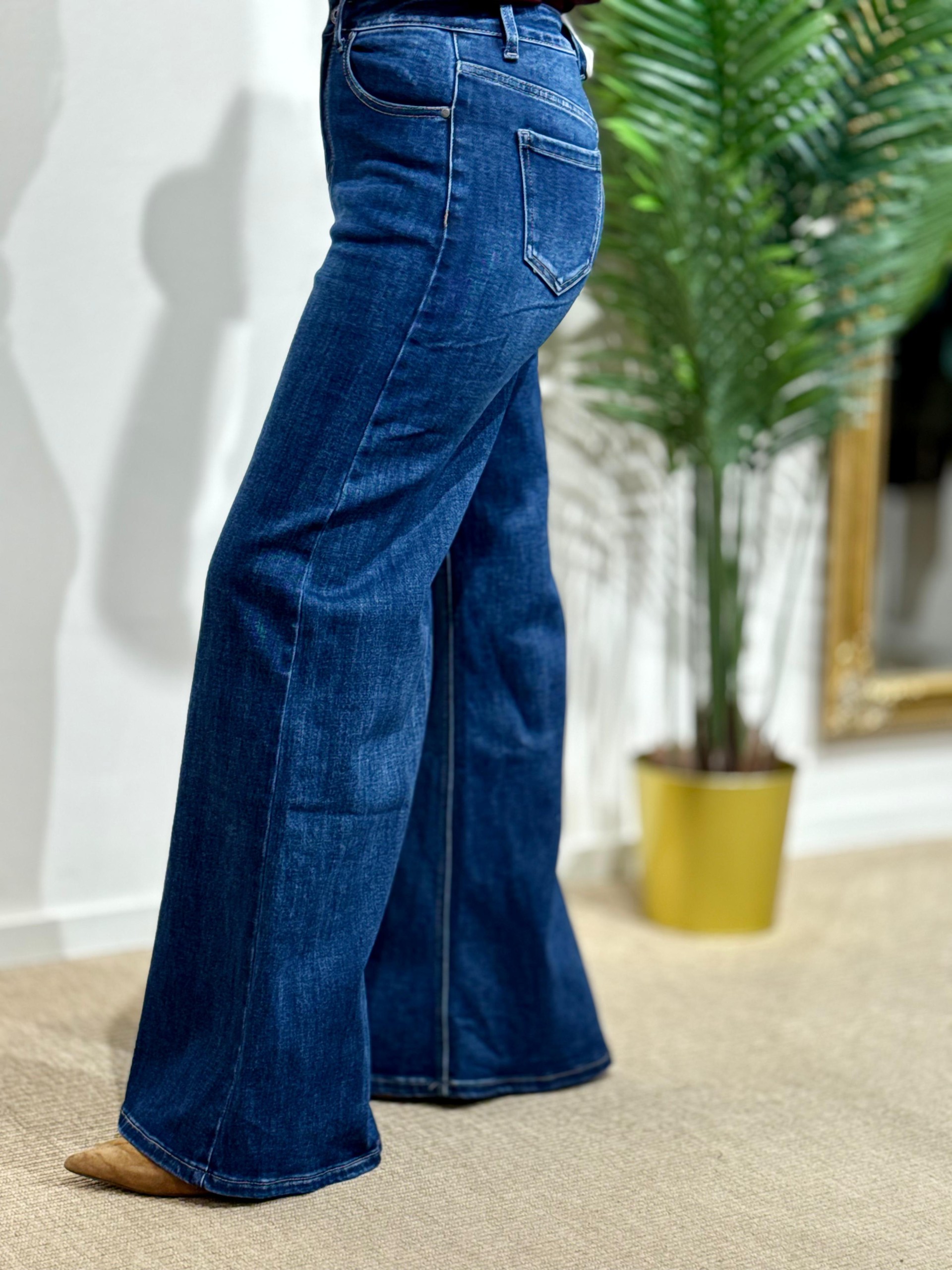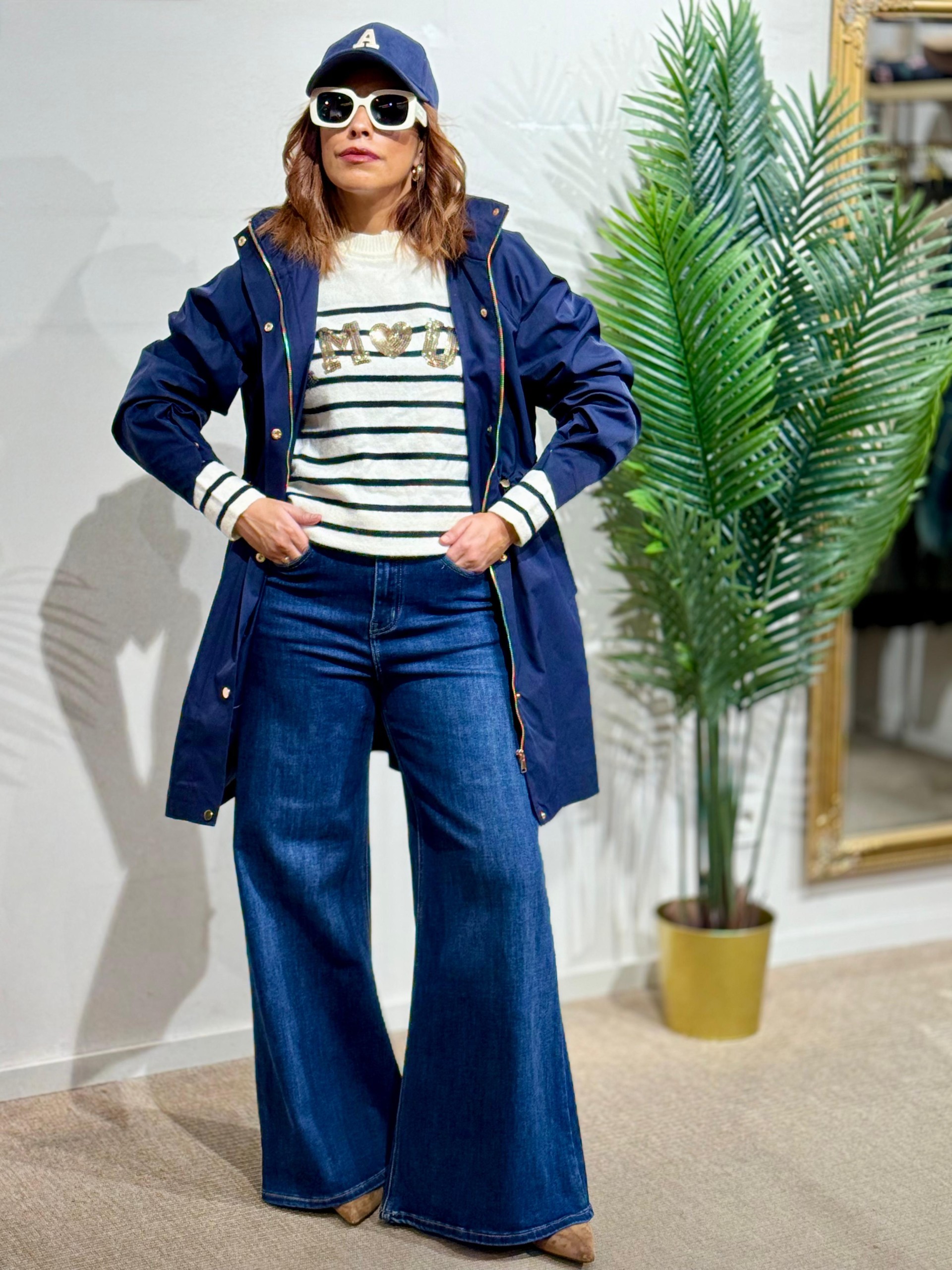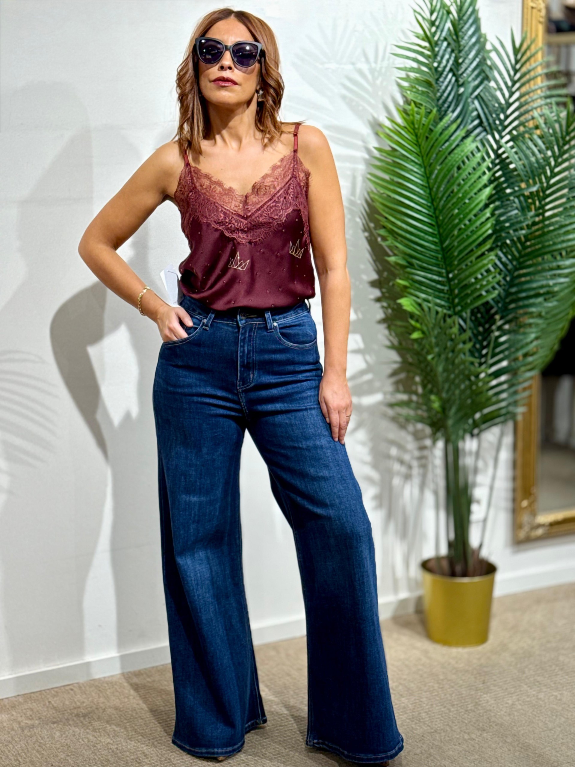 Pantalón denim oscuro elefante. 5 bolsillos con elástico.