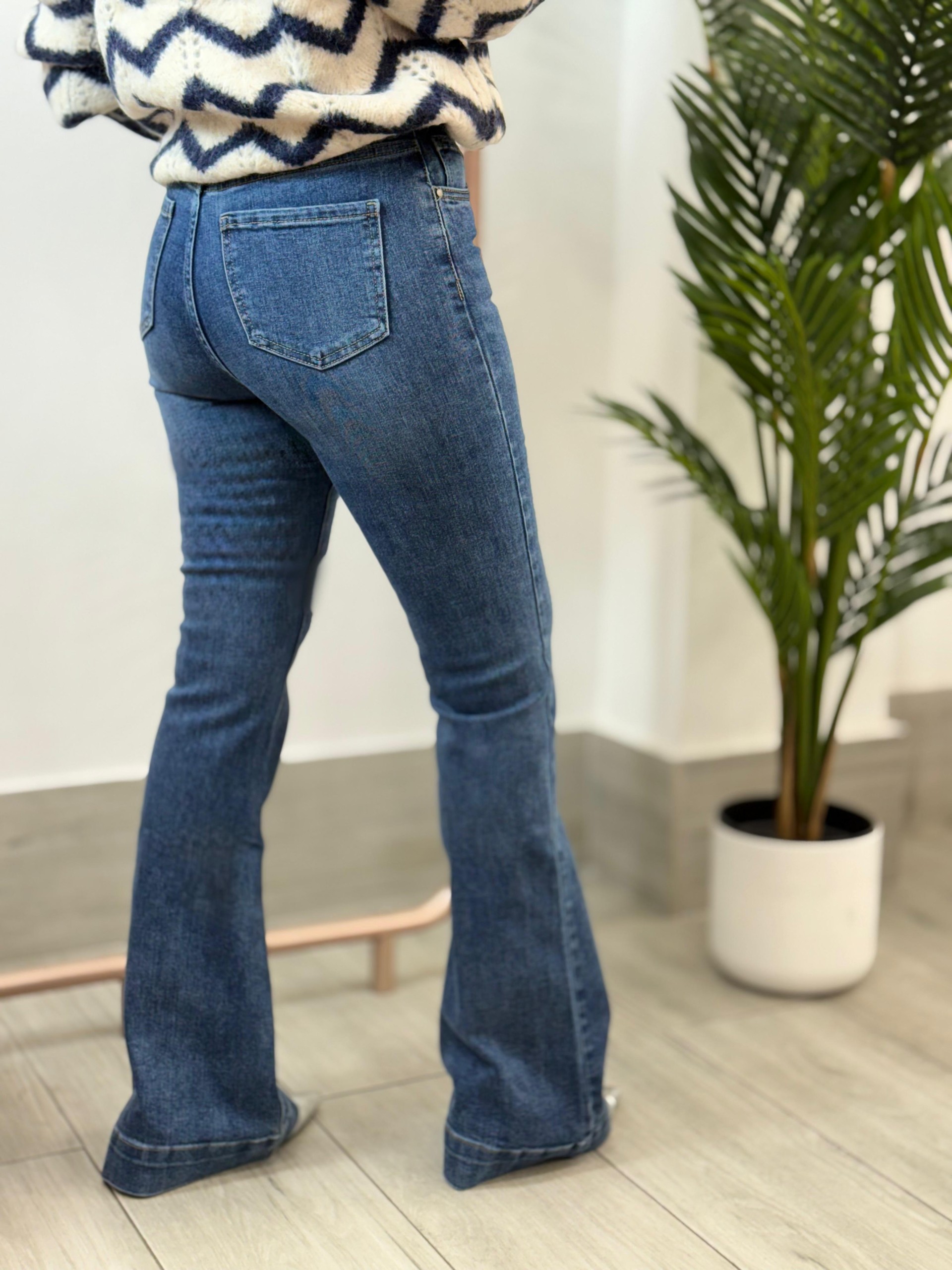 Pantalón flare vaquero largo. 5 bolsillos. Tiro muy alto.