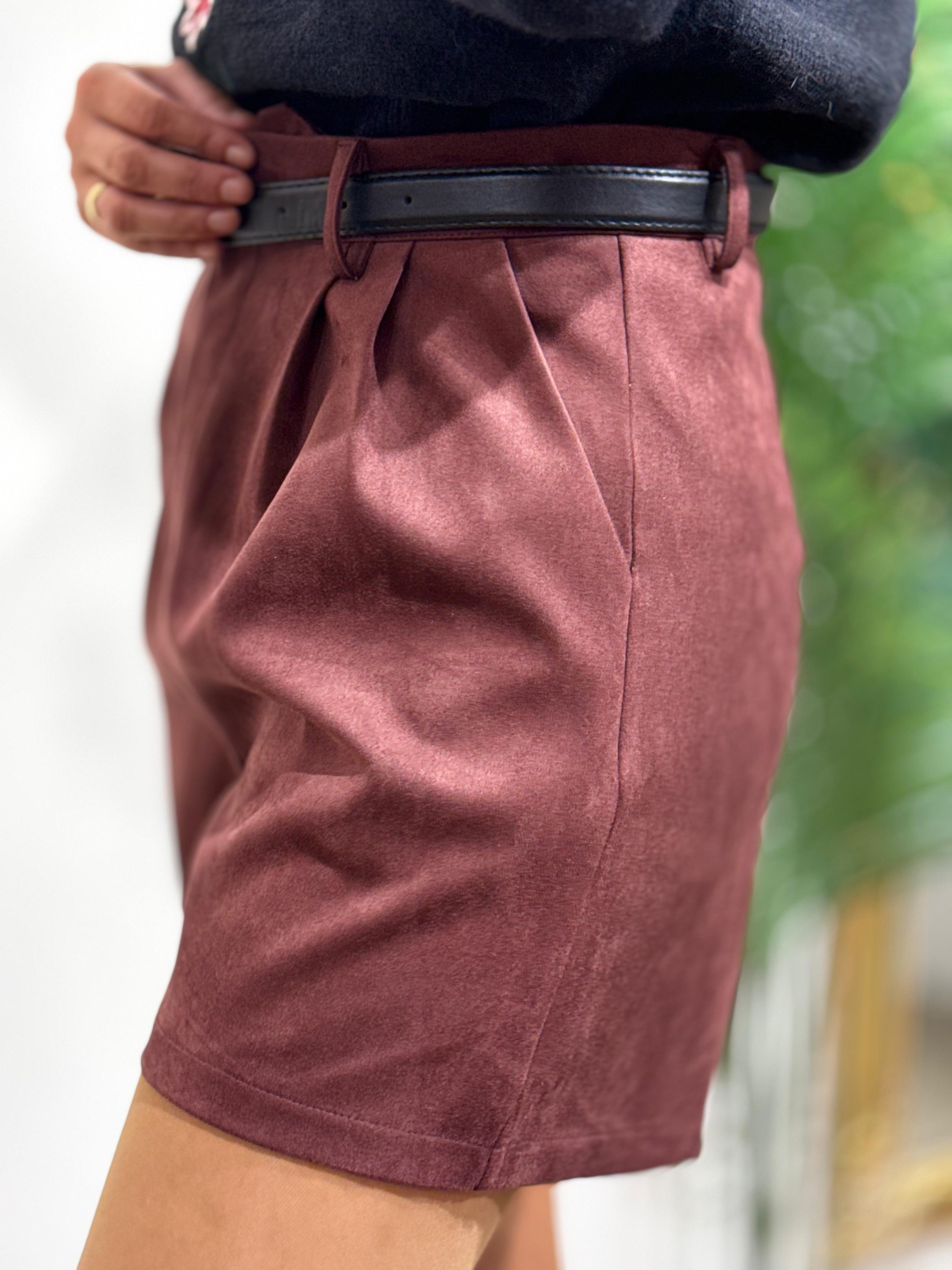 Short ante cinturón burdeos. Contiene pinzas y bolsillos laterales. Incluye cinturón.