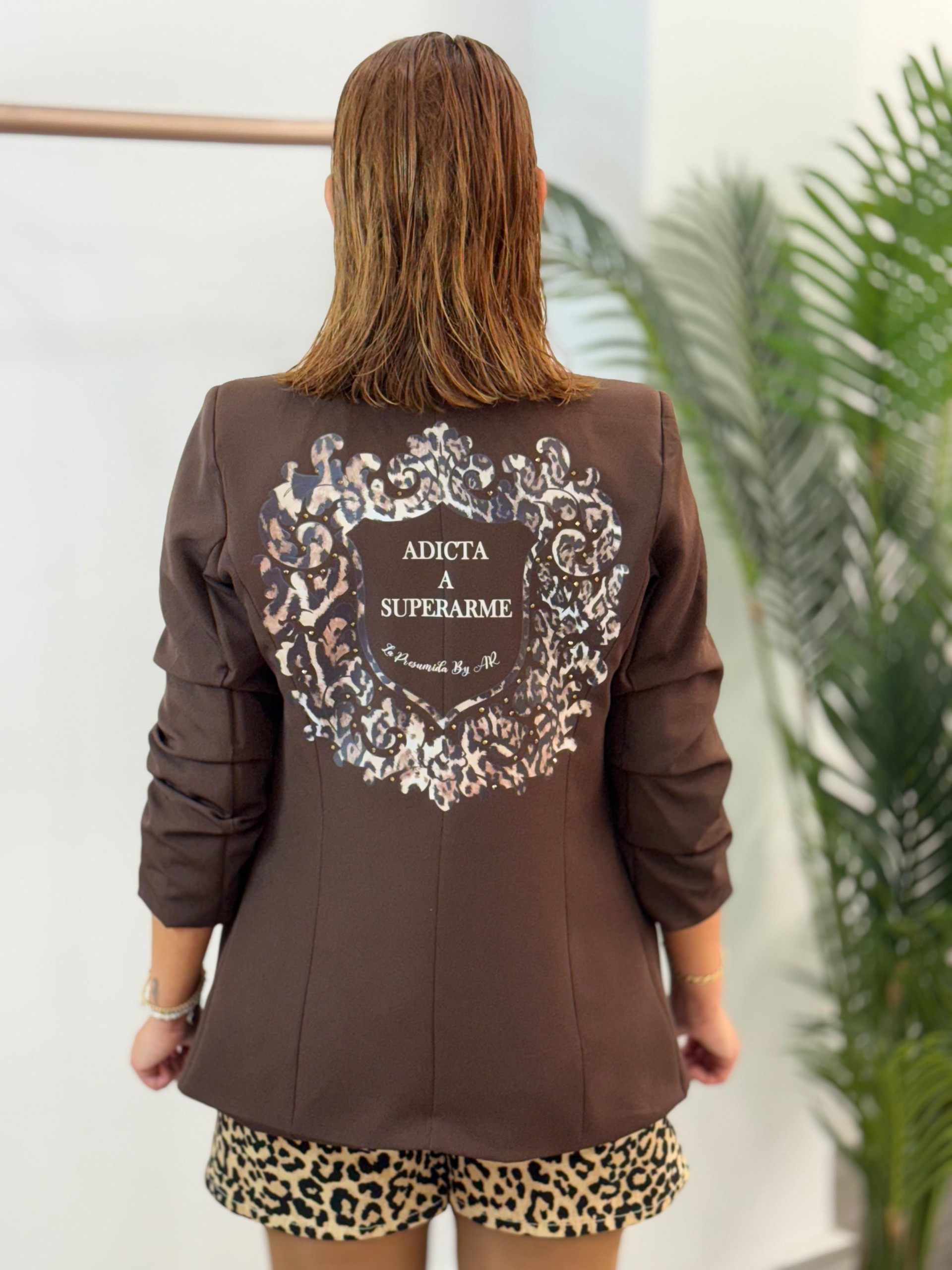 Blazer “Adicta a superarme” chocolate. Corte entallado y manga fruncida. Contiene hombreras y forro interior. Mensaje en espalda ñ “Adicta a superarme” con pedrería icrustrada