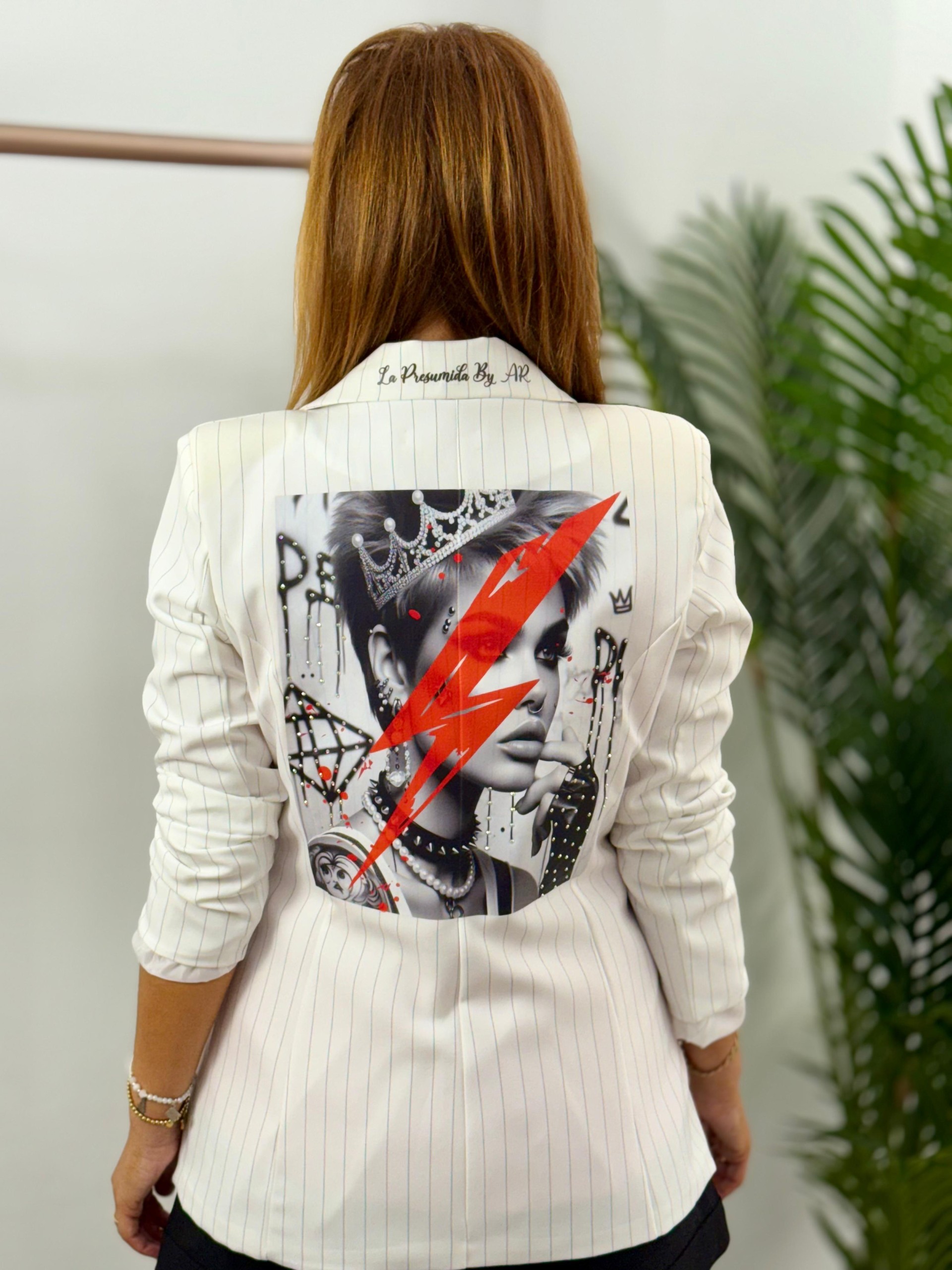 Blazer raya diplomática diseño LP Blanca. Corte entallado y doble botonadura. Contiene hombreras y forro interior. Estampación en espalda con strass y diseño estrellas en hombros.