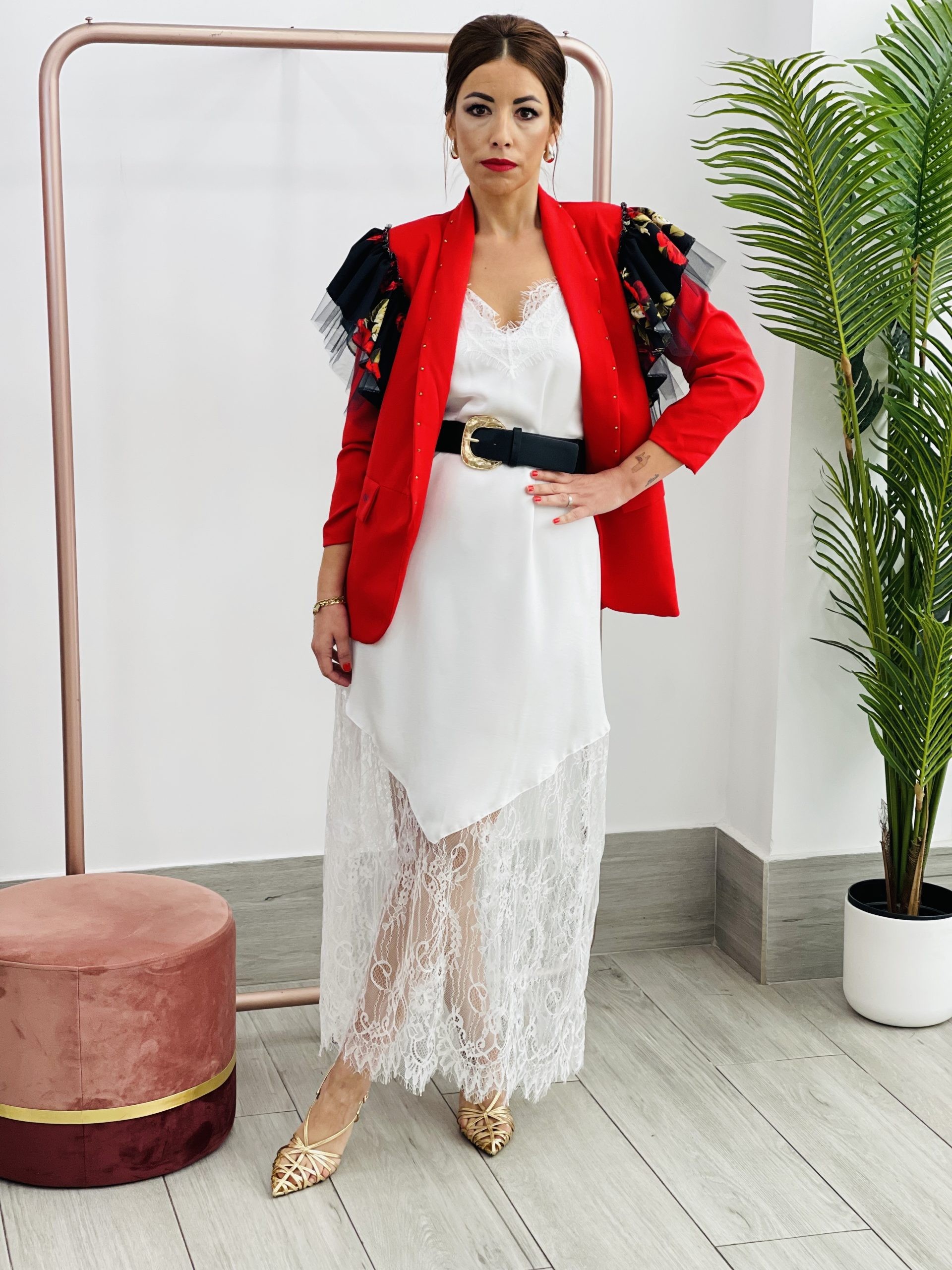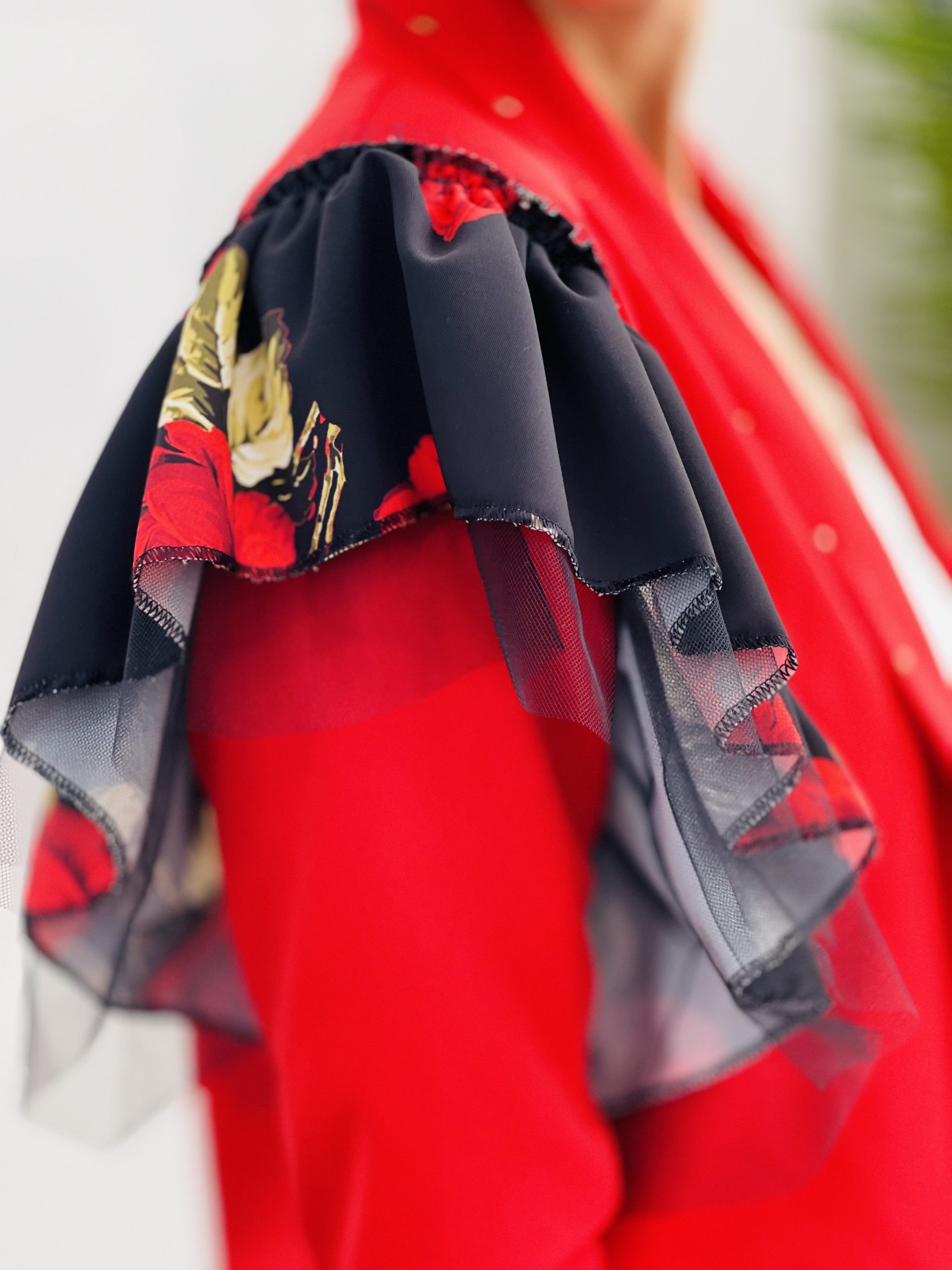 Blazer PASION flores roja. Forro interior y hombreras. Lleva volantes de tul y tela en estampado de rosas rojas.