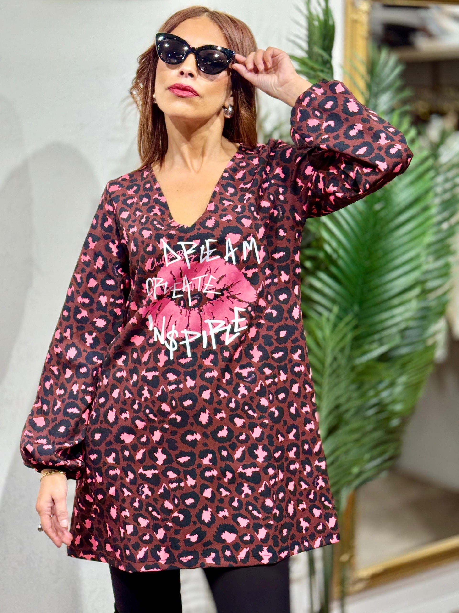 Vestido Dream Print Burdeos. Escote pico y corte evasé. Lleva Manga abullonada y bolsillos.