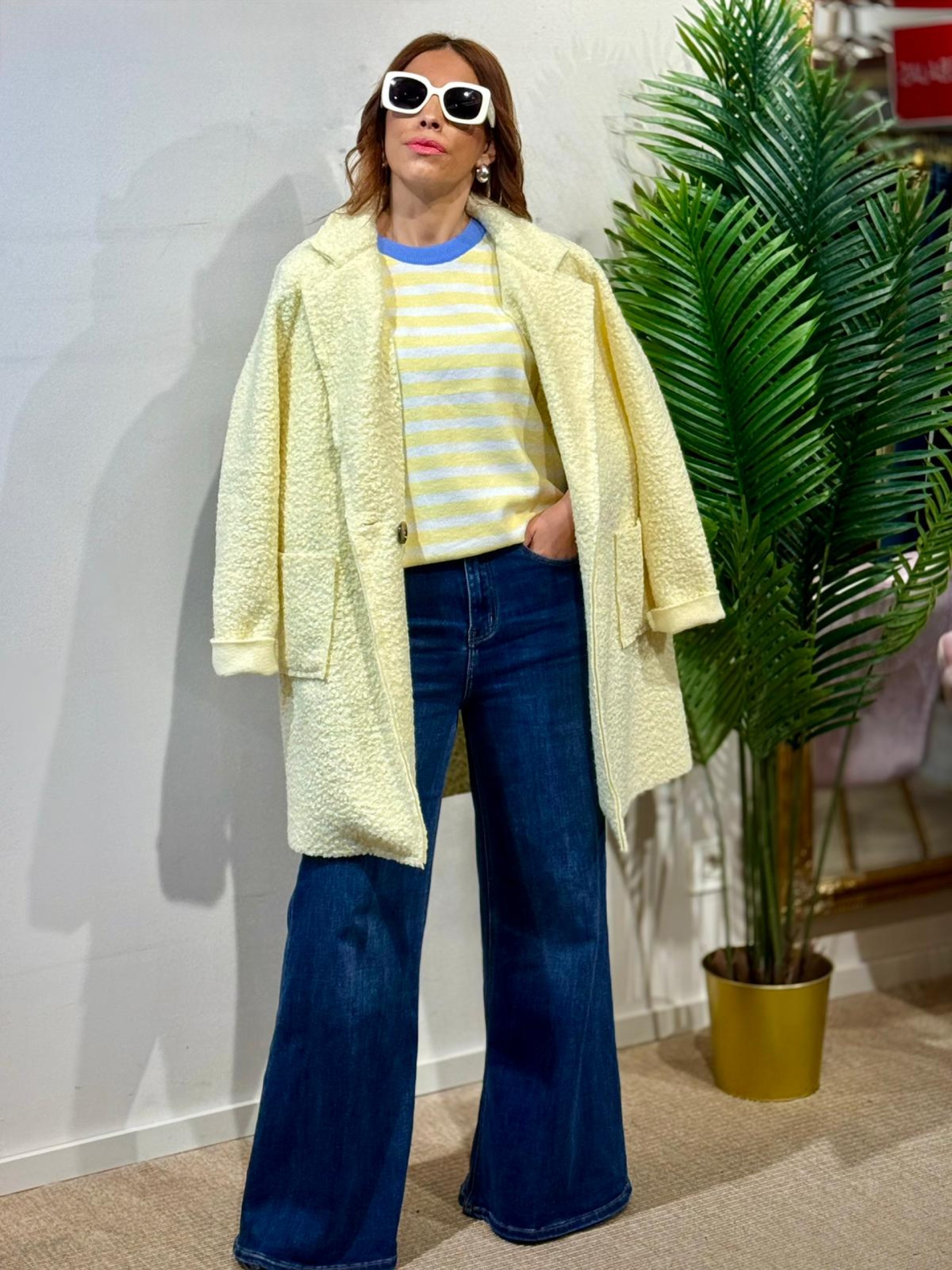 Abrigo rizado amarillo. Corte over-size y recto. Incluye solapas, bolsillos y botonadura central.