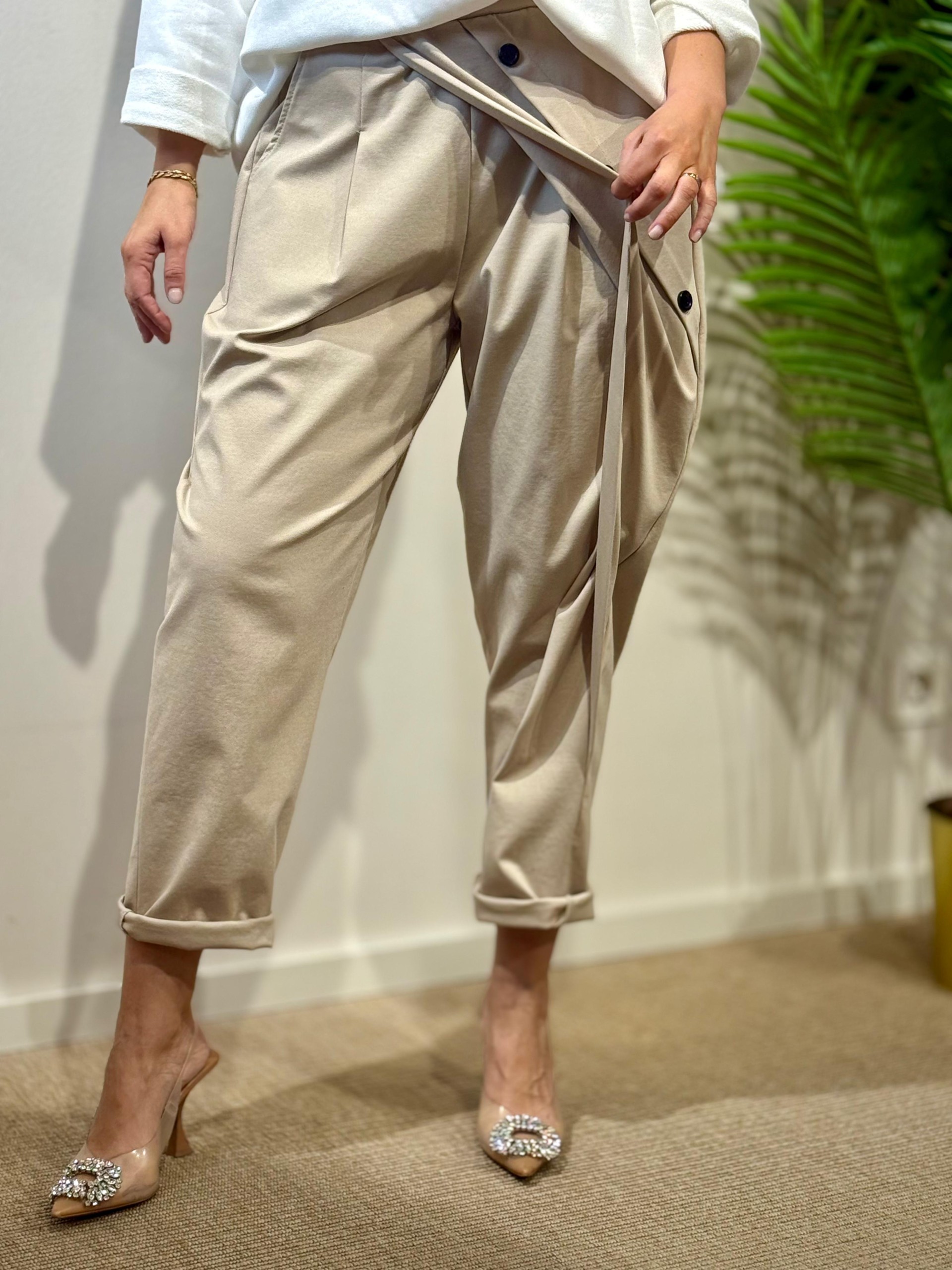 Pantalón Baggie Botones Beige. Engomado en cintura y Lleva Bolsillos laterales.