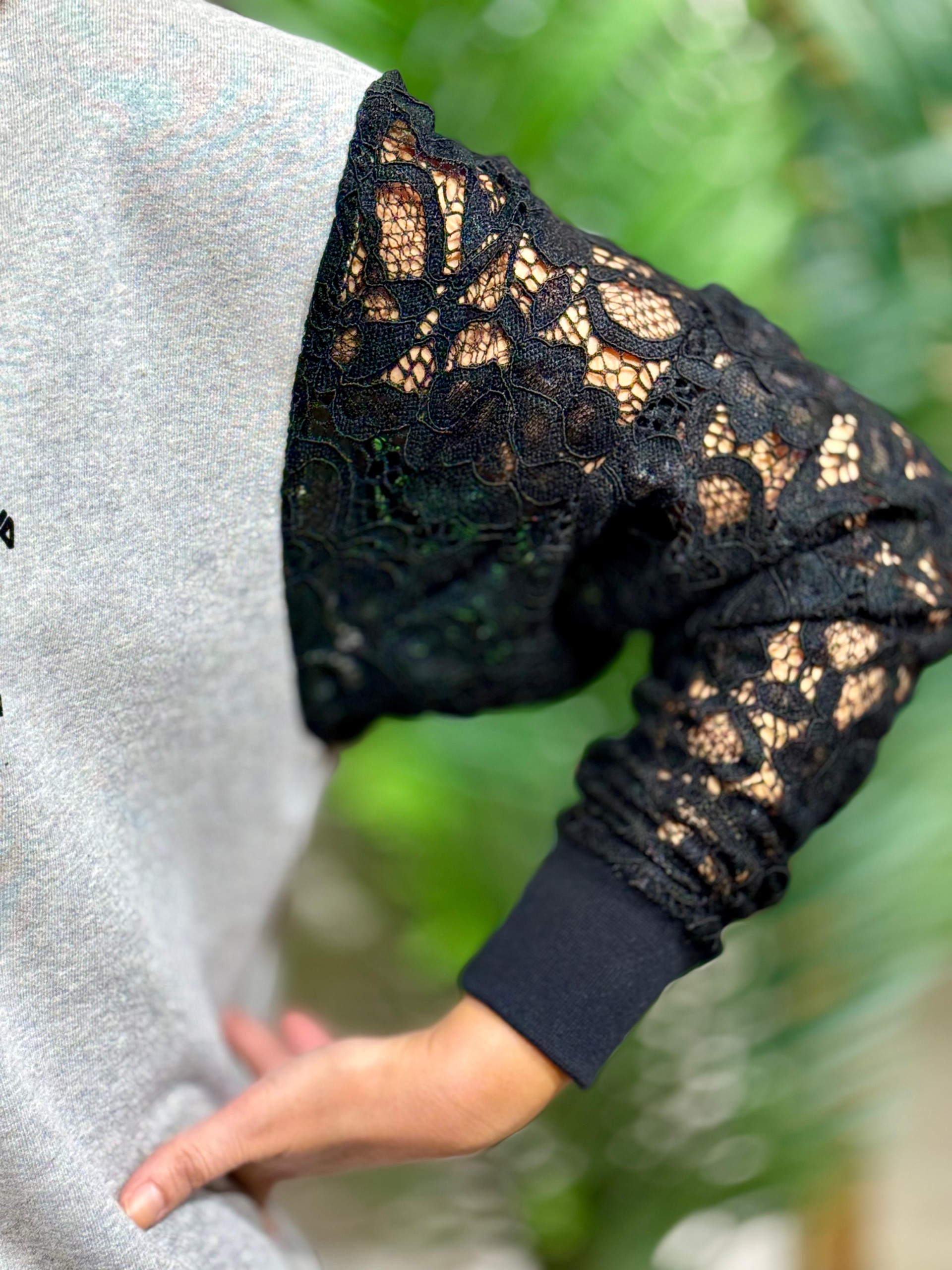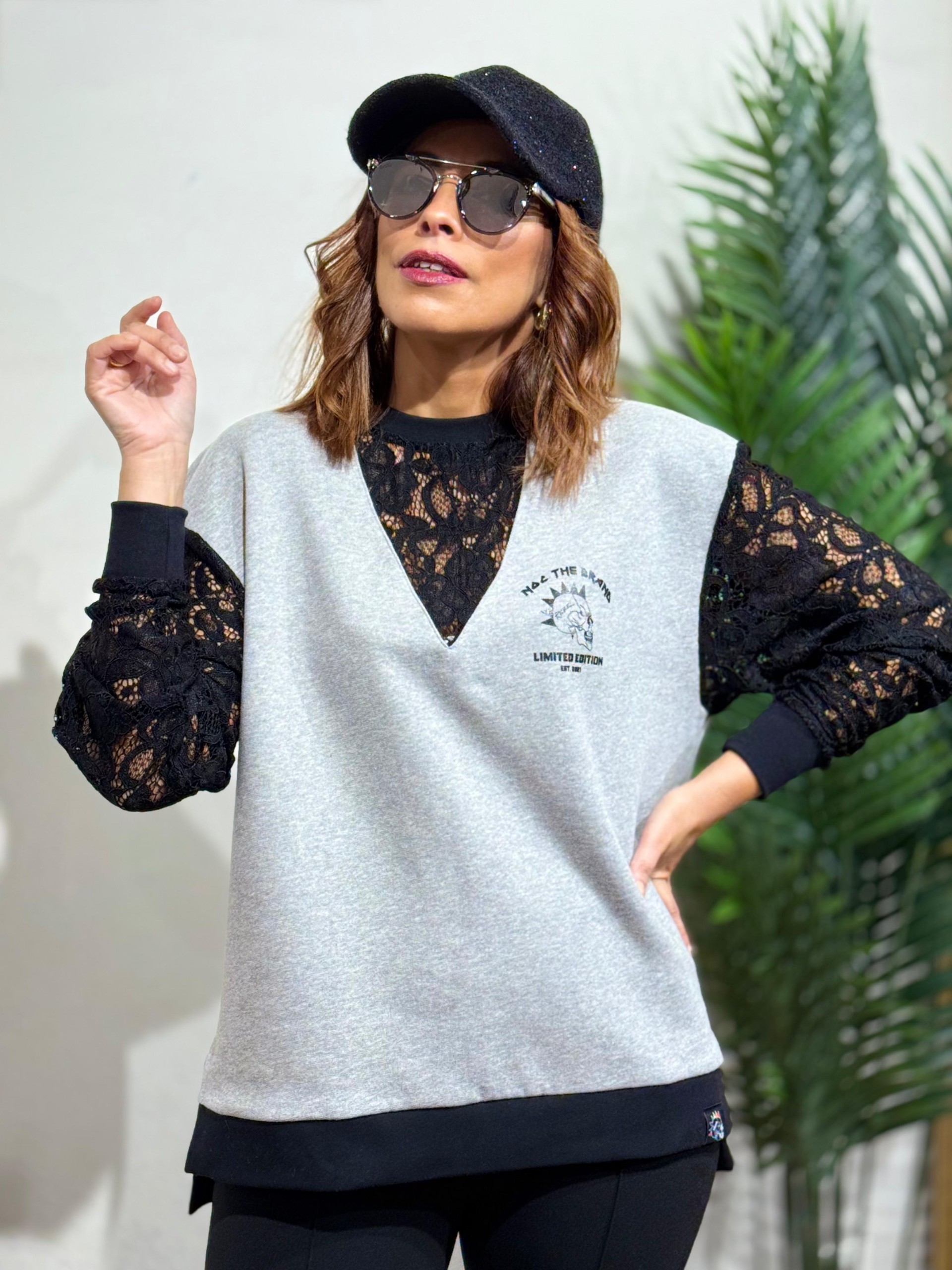 Sudadera over encaje gris. Tejido de álgodon y escote pico y mangas con encaje de alta calidad.