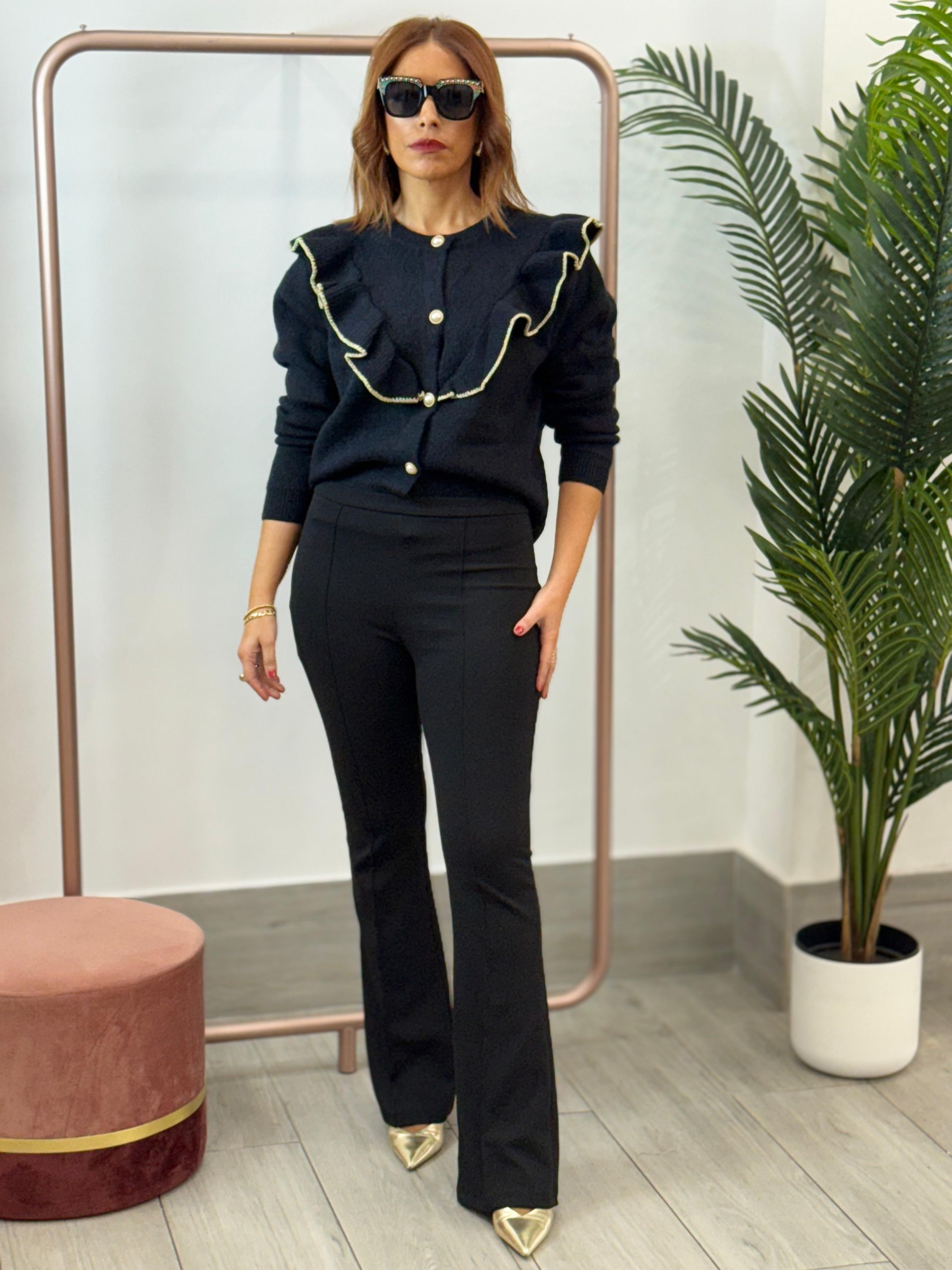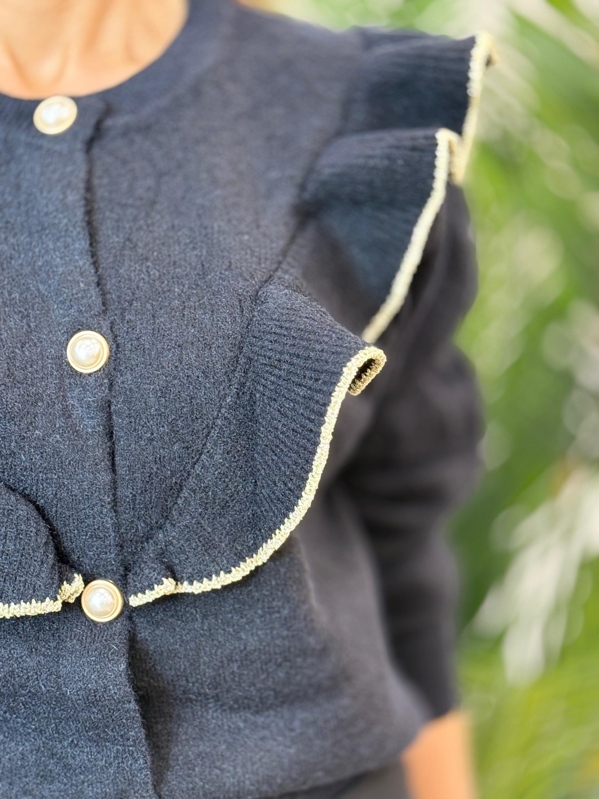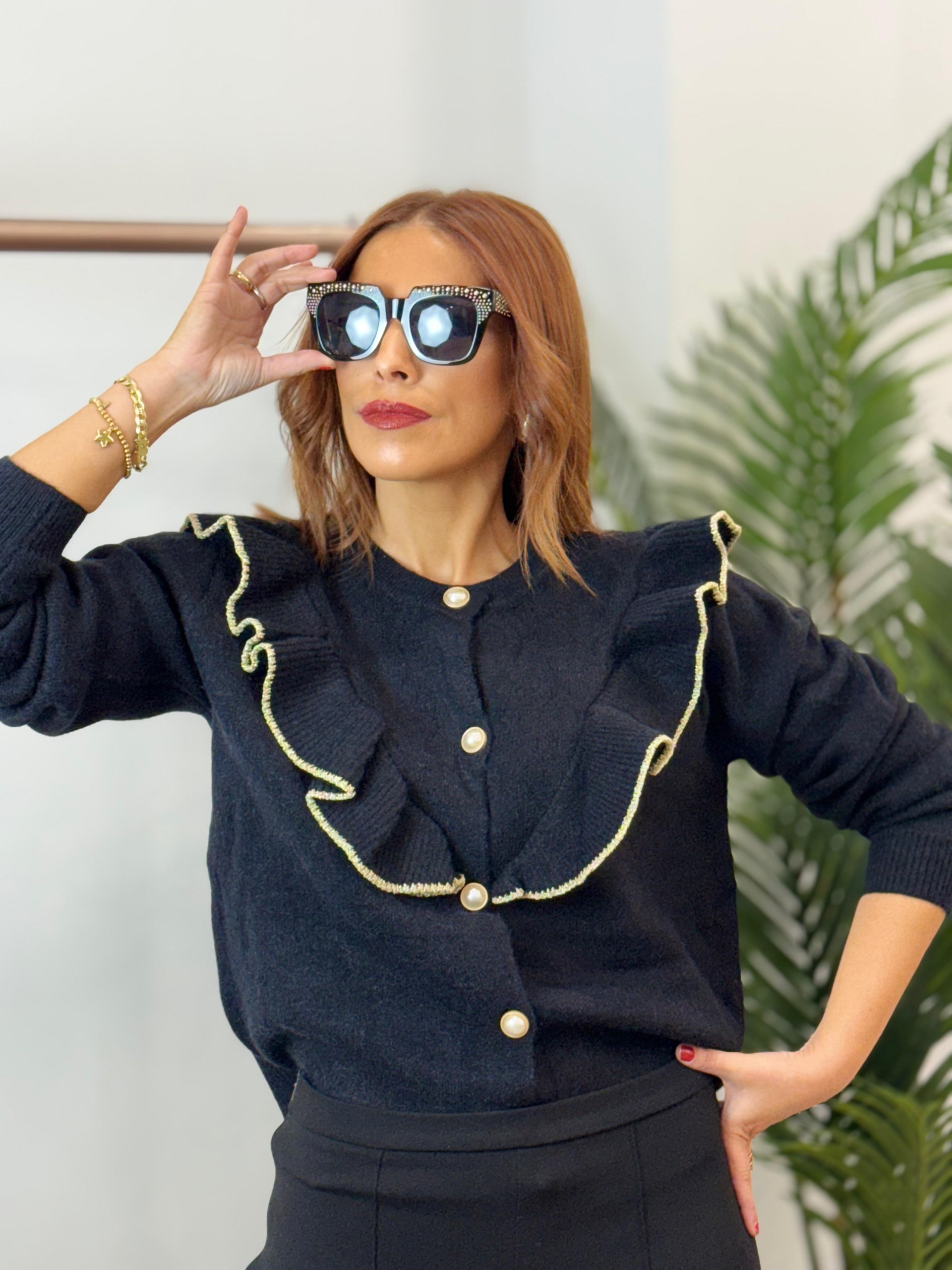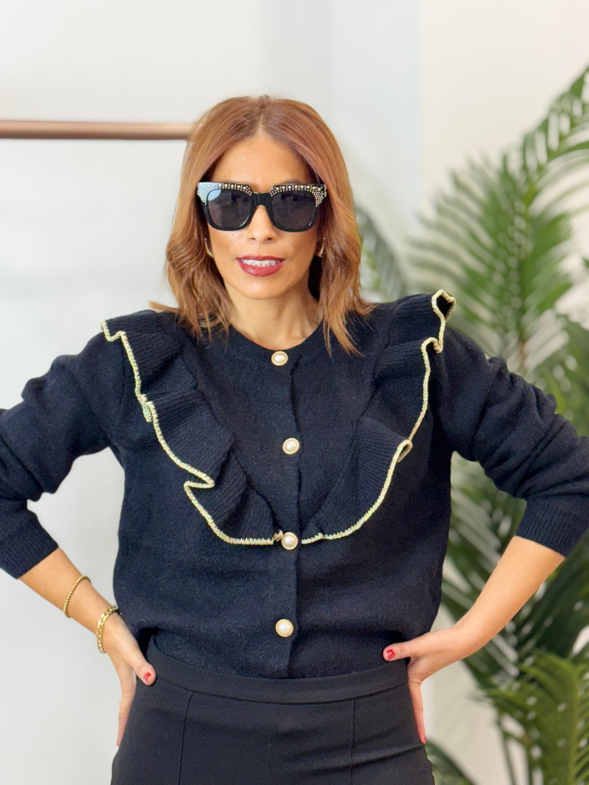 Chaqueta punto volantes negra. Incluye botones de perlas y ribete en glitter.