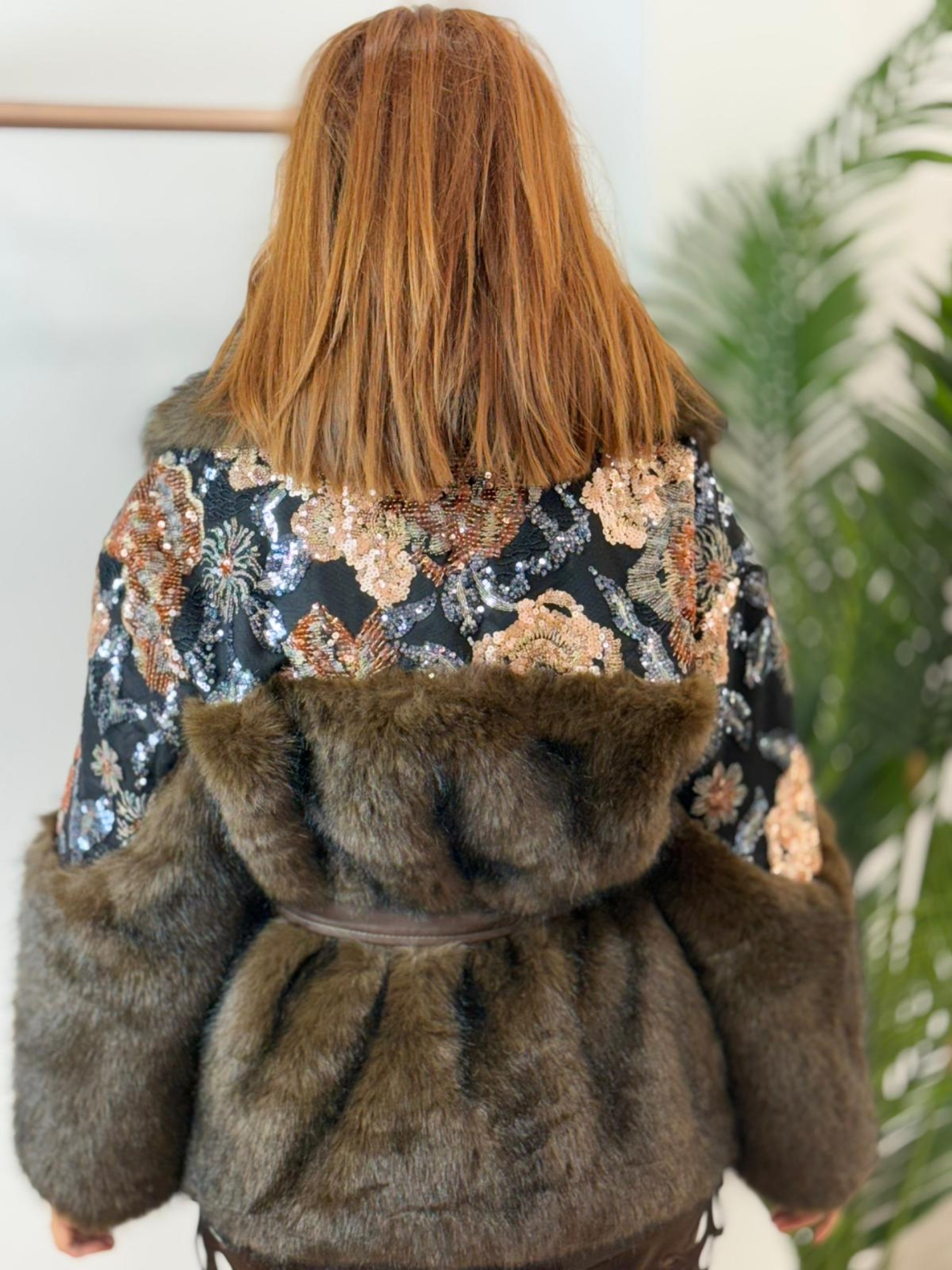 Chaquetón pelo y lentejuelas choco. Incluye cinturón de Polipiel y bolsillos laterales. Forro interior y estampado de flores en lentejuelas de colores.