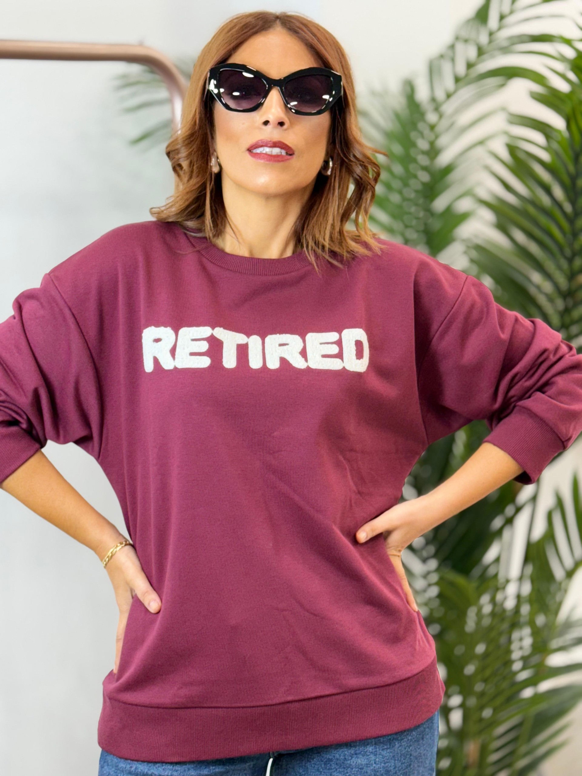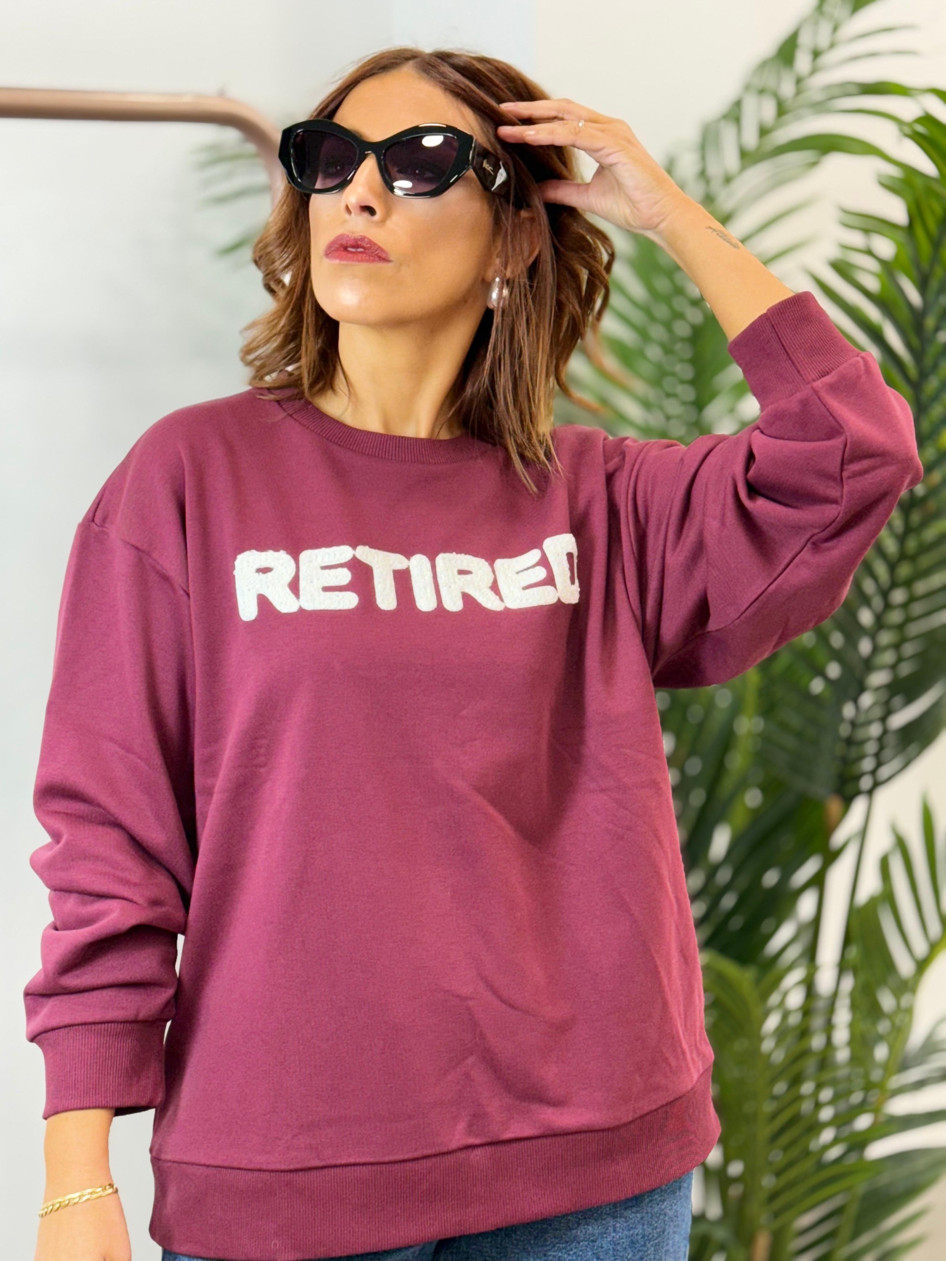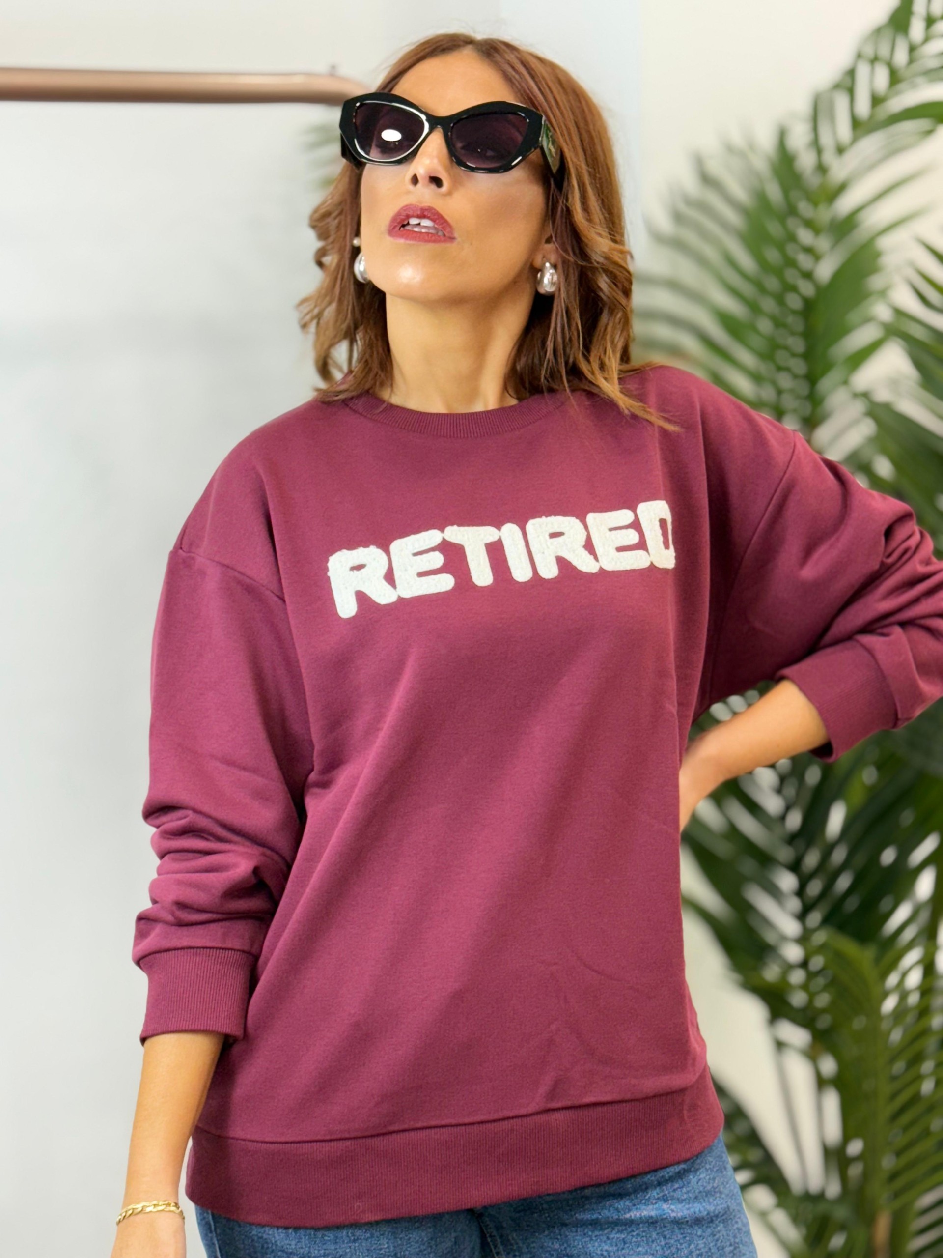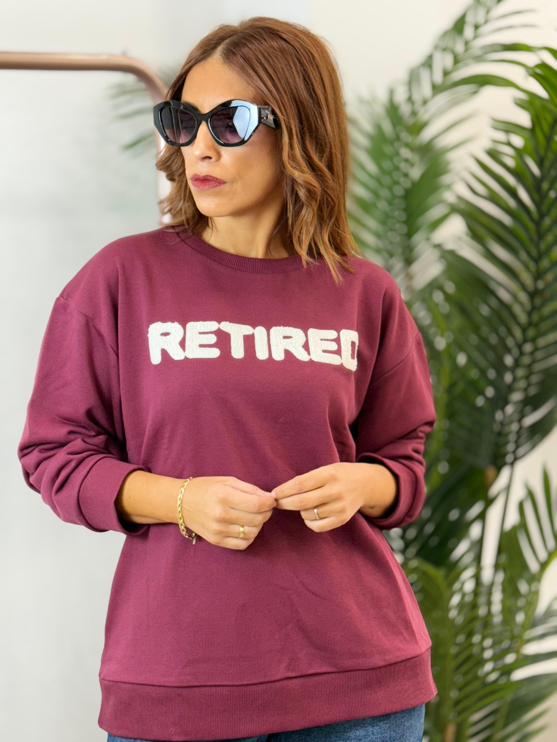 Sudadera RETIRED Burdeos. Lleva bolsillos y mensaje bordado en blanco. Cuello redondo y bajo y puños.