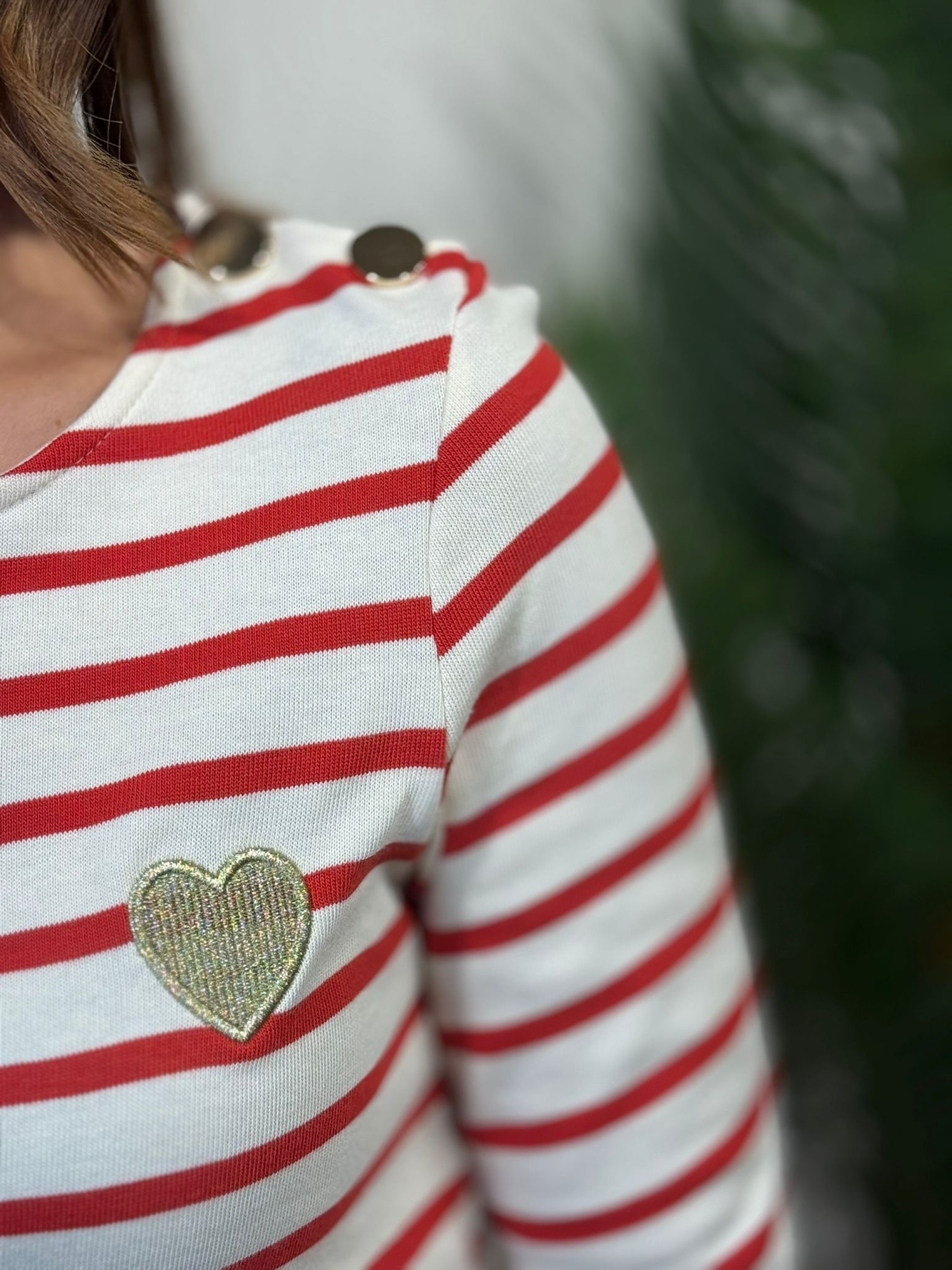 Camiseta Rayas Roja Corazon. Manga larga y tejido de algodón de alta calidad. Corazón bordado dorado en lateral.