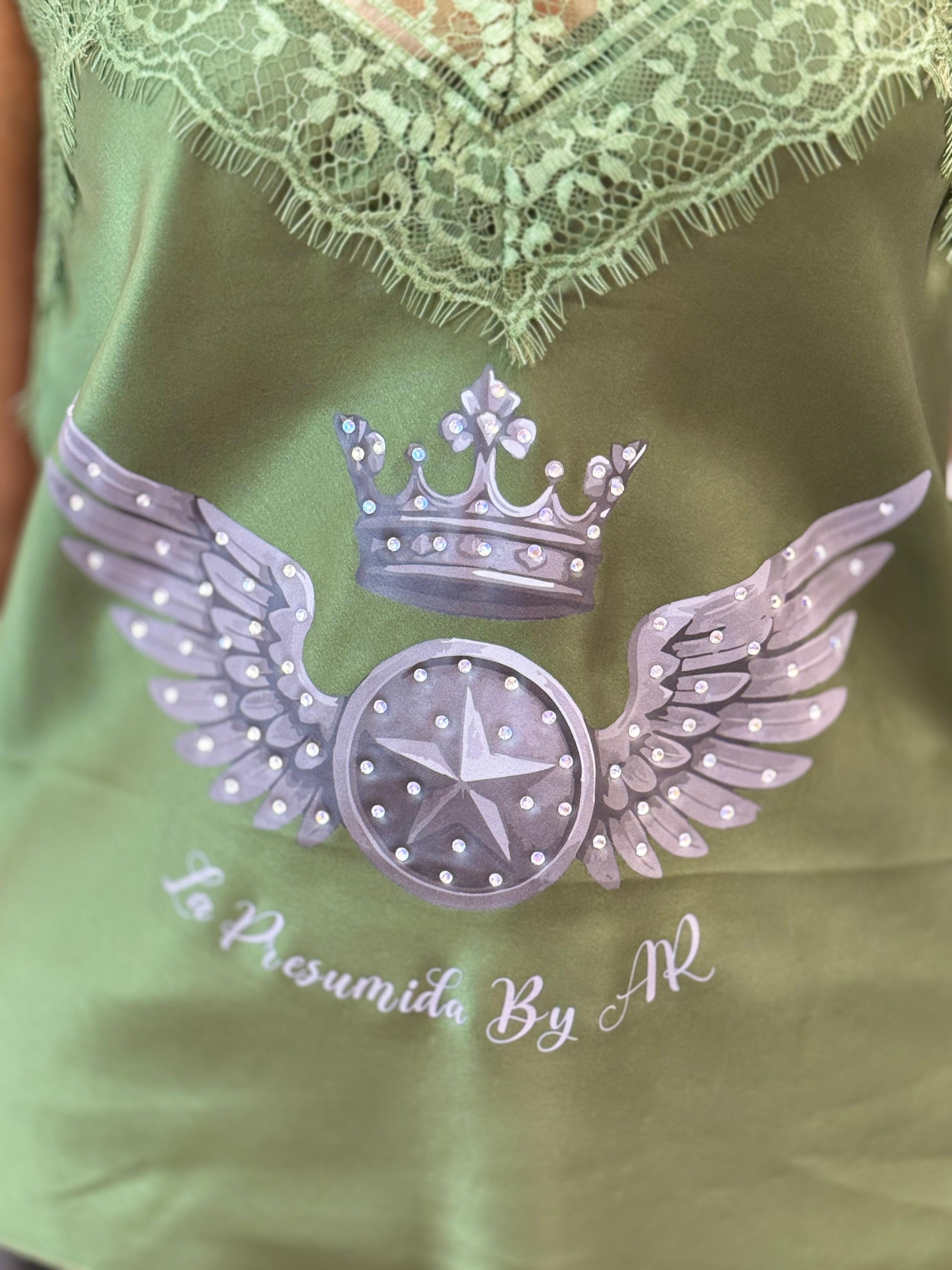 Top lencero diseño LP militar. Tirantes ajustables y encaje en el pecho. Estampación en gris plateado con strass.