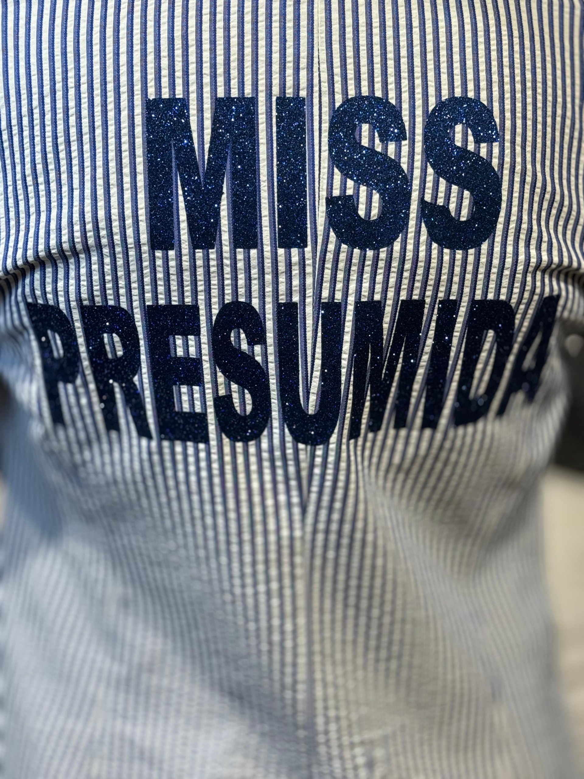 Blazer MISS PRESUMIDA rayas azul y blanca. Contiene hombreras y botones central. Estampación en glitter azul en espalda. Frontal con parches en strass.