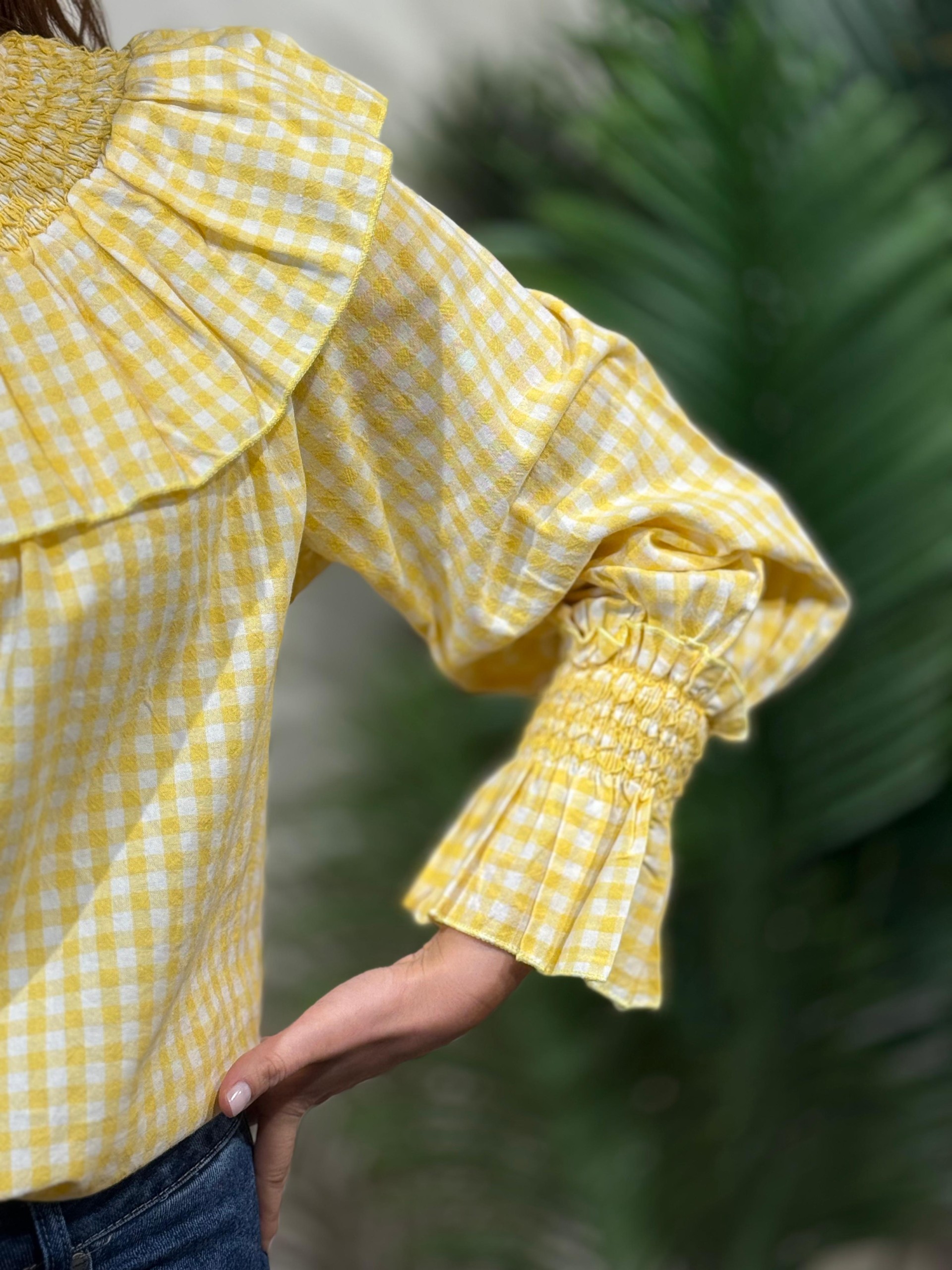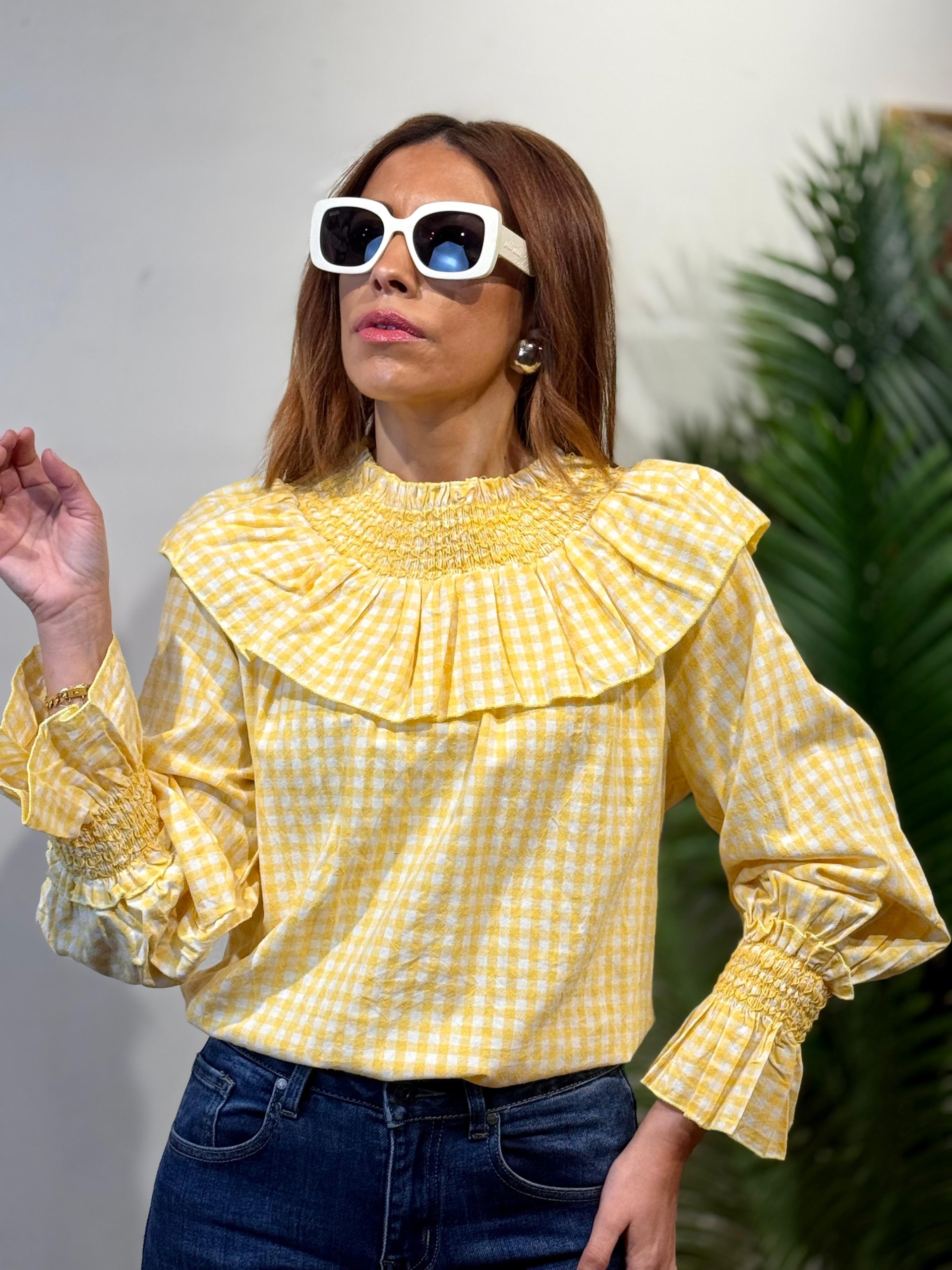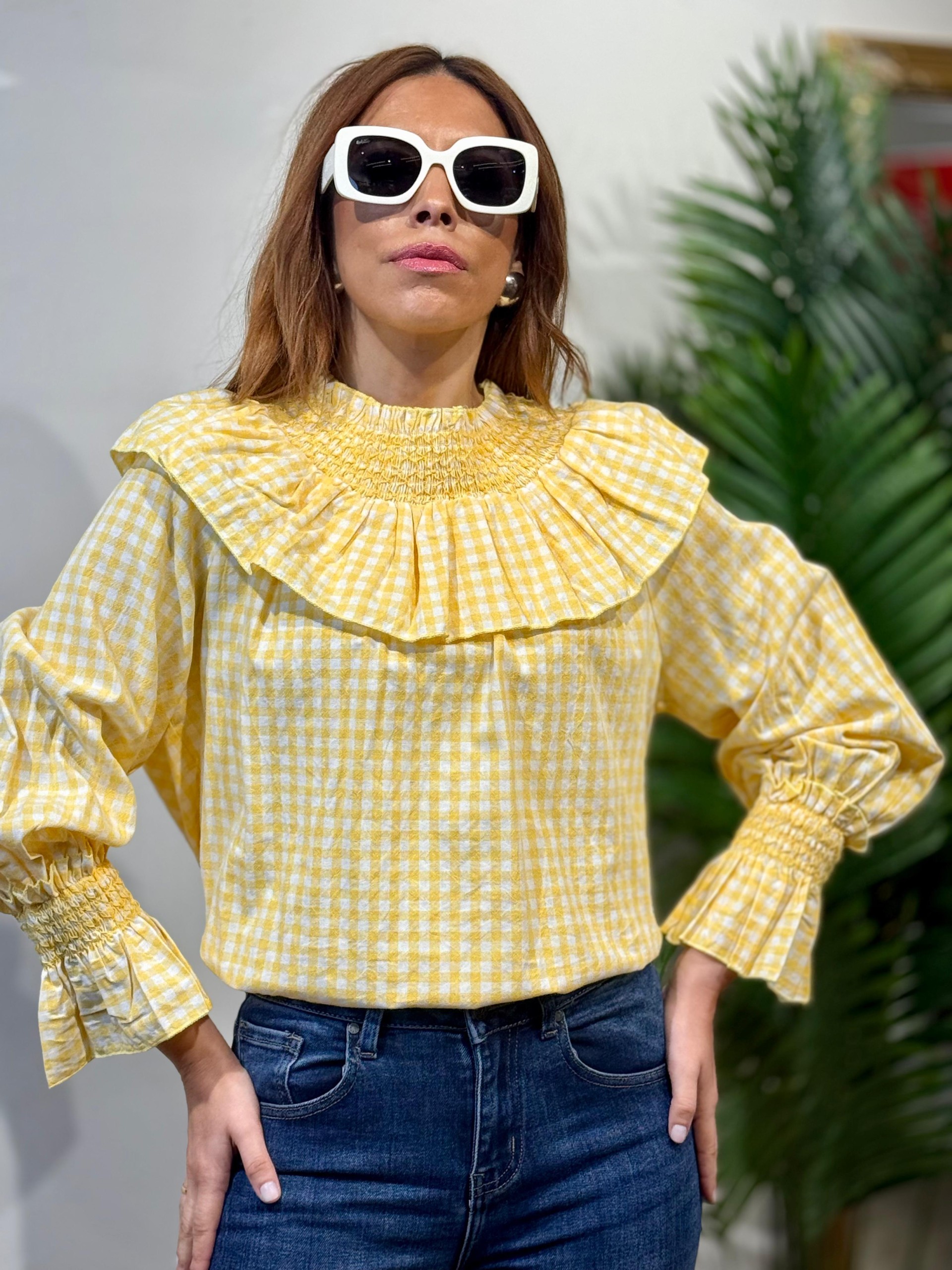 Blusa volantes vichy amarillo y blanco. Nido de abeja en cuello y puños.