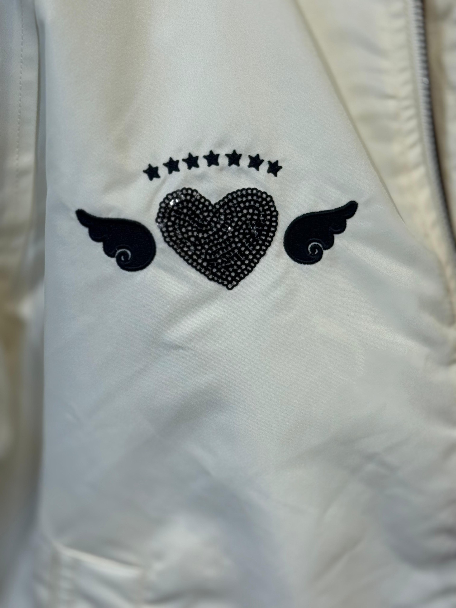 Bomber “Poder Femenino” Crema. Chaqueta Acolchada con detalles bordados y lentejuelas. Cremallera central y bolsillos. Aberturas laterales con cremalleras. Incluye bolsillos.
