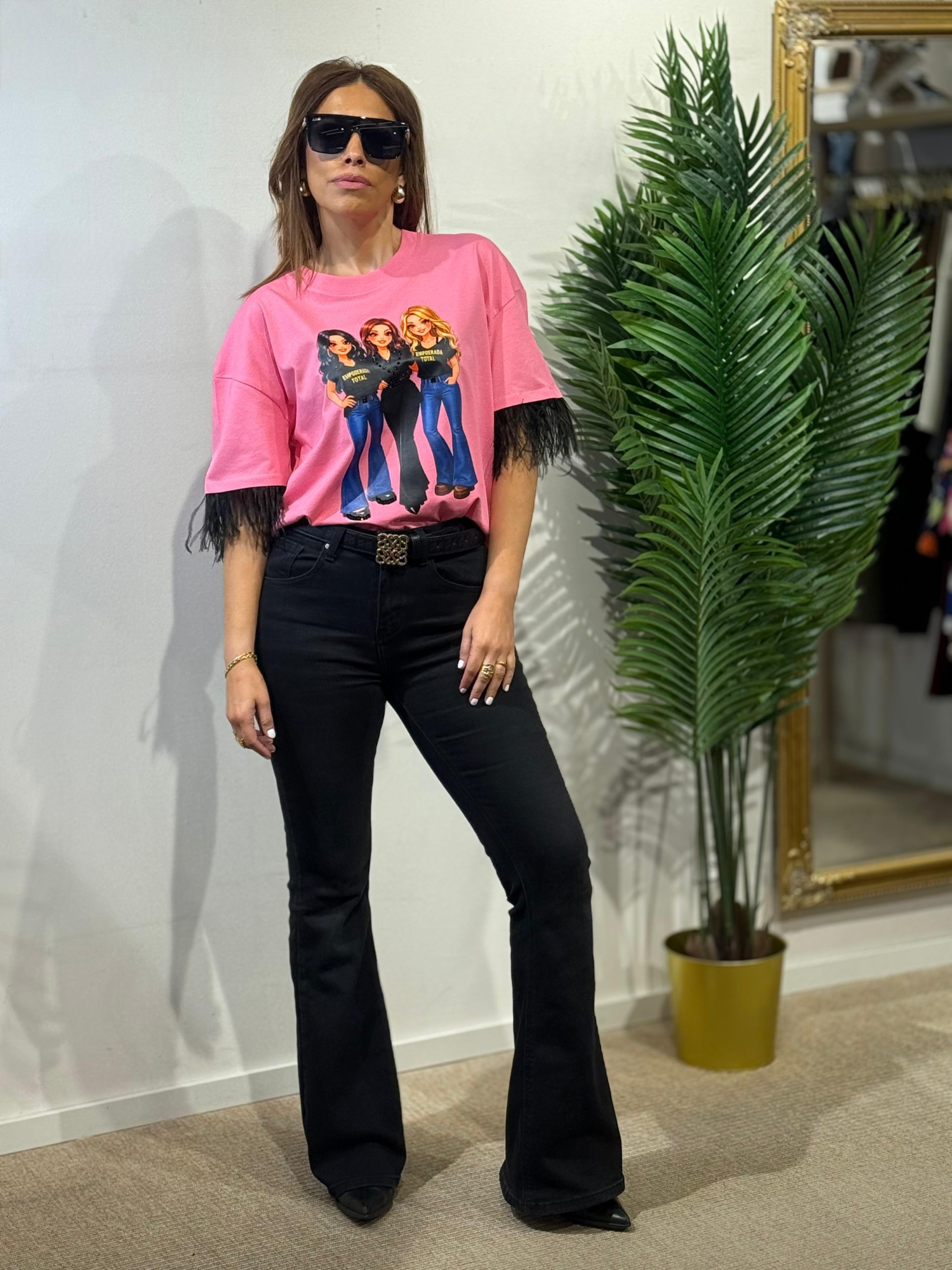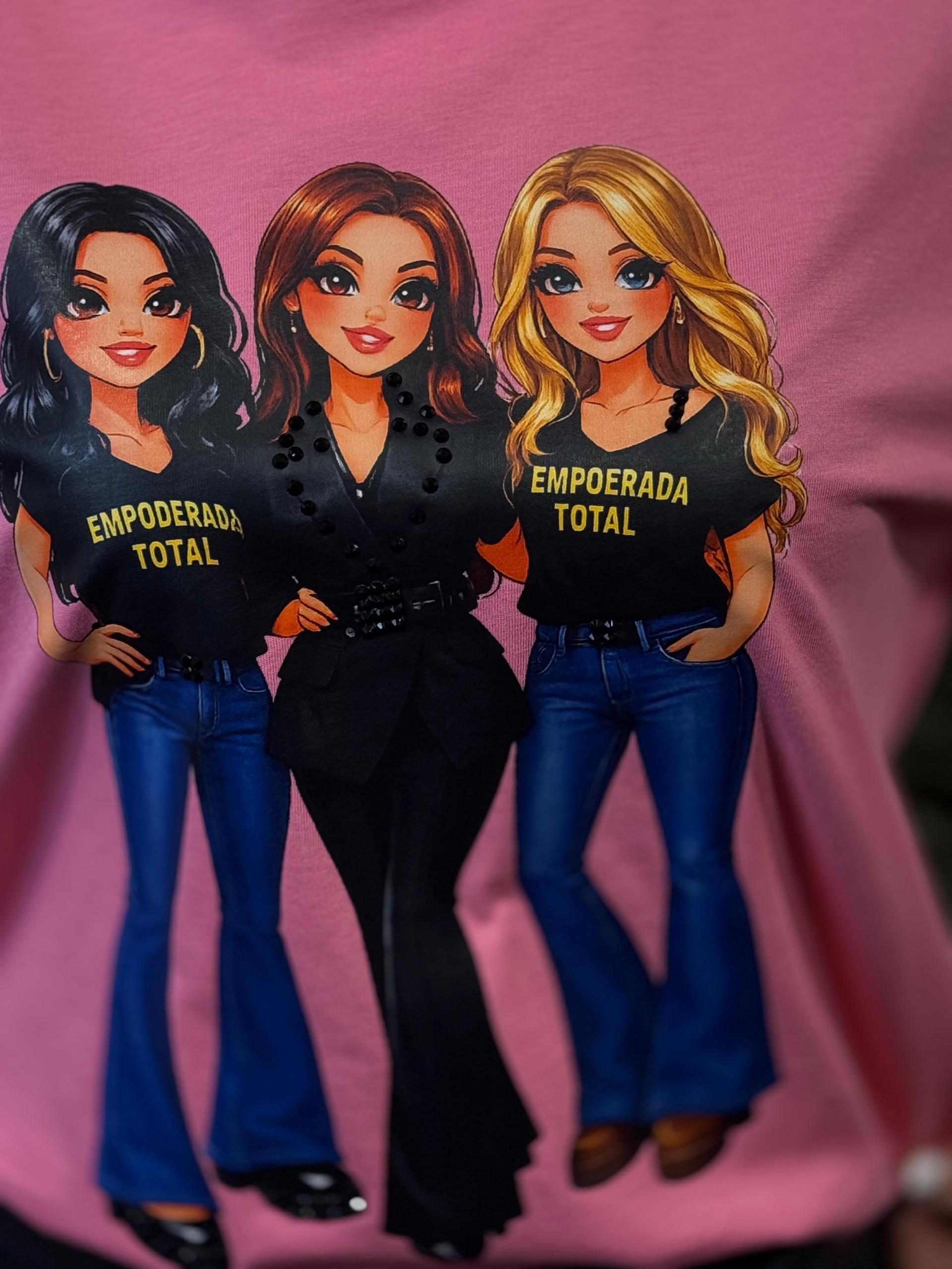 Camiseta Presumidas y Empoderadas by LP Rosa. Estampación central Equipo Presumido con strass y plumas negras en mangas. Corte oversize.