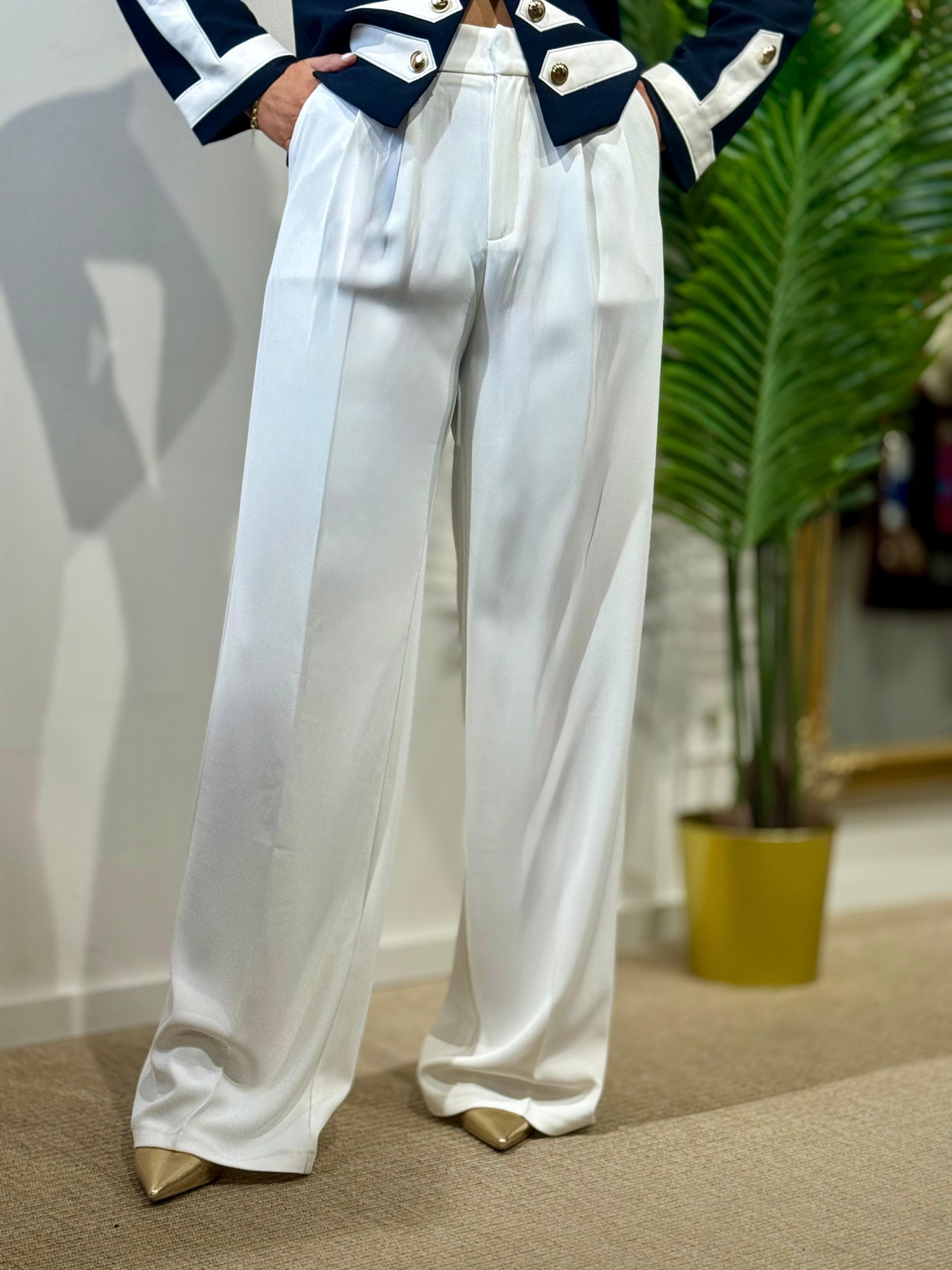 Pantalón Pinzas Ancho Blancolleva pinzas y bolsillos laterales. Incluye trabillas para cinturón.