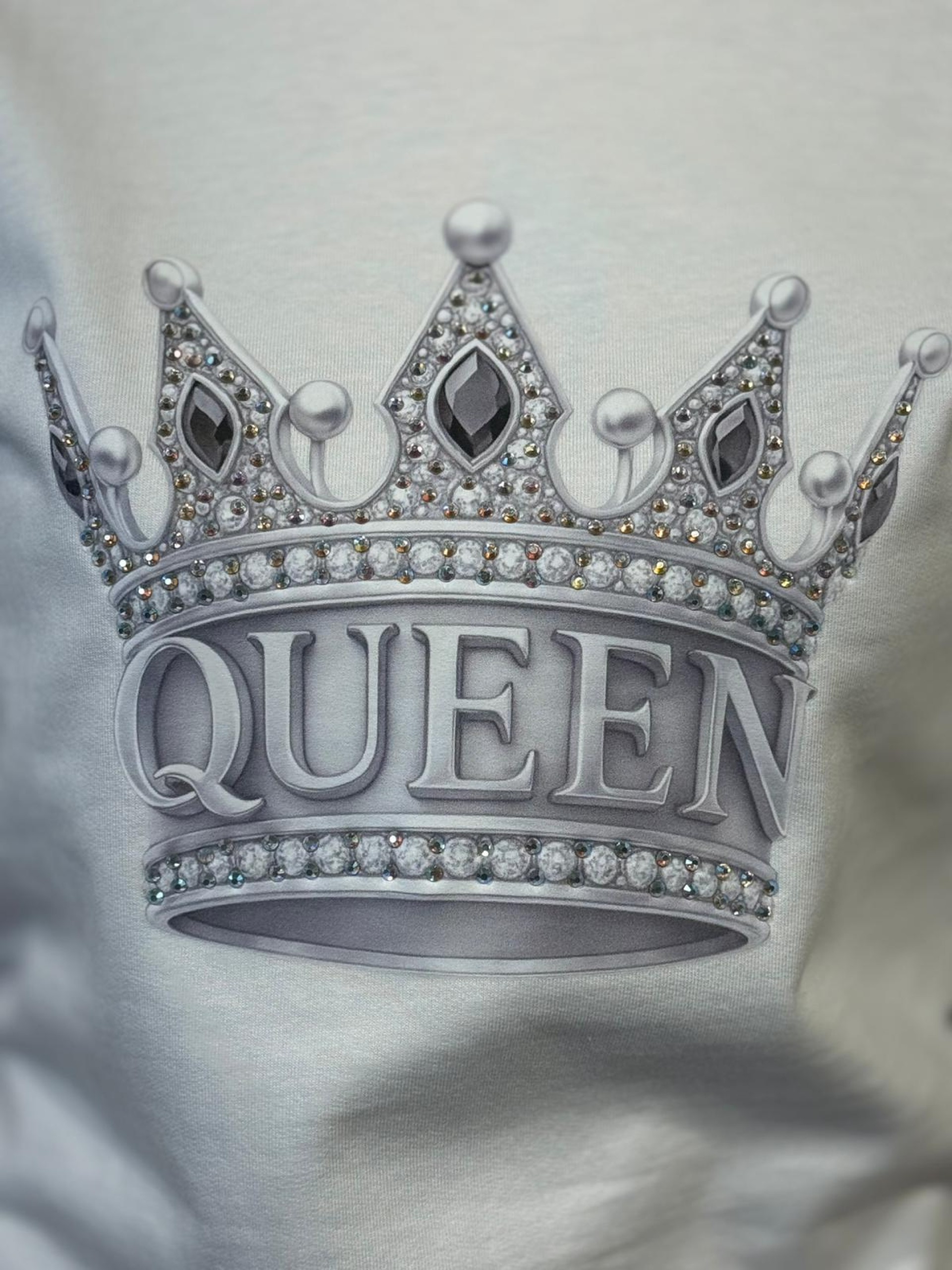 Sudadera Joya QUEEN Blanca. Incluye pedrería incrustada corona. Hombros con volantes en tul blanco.