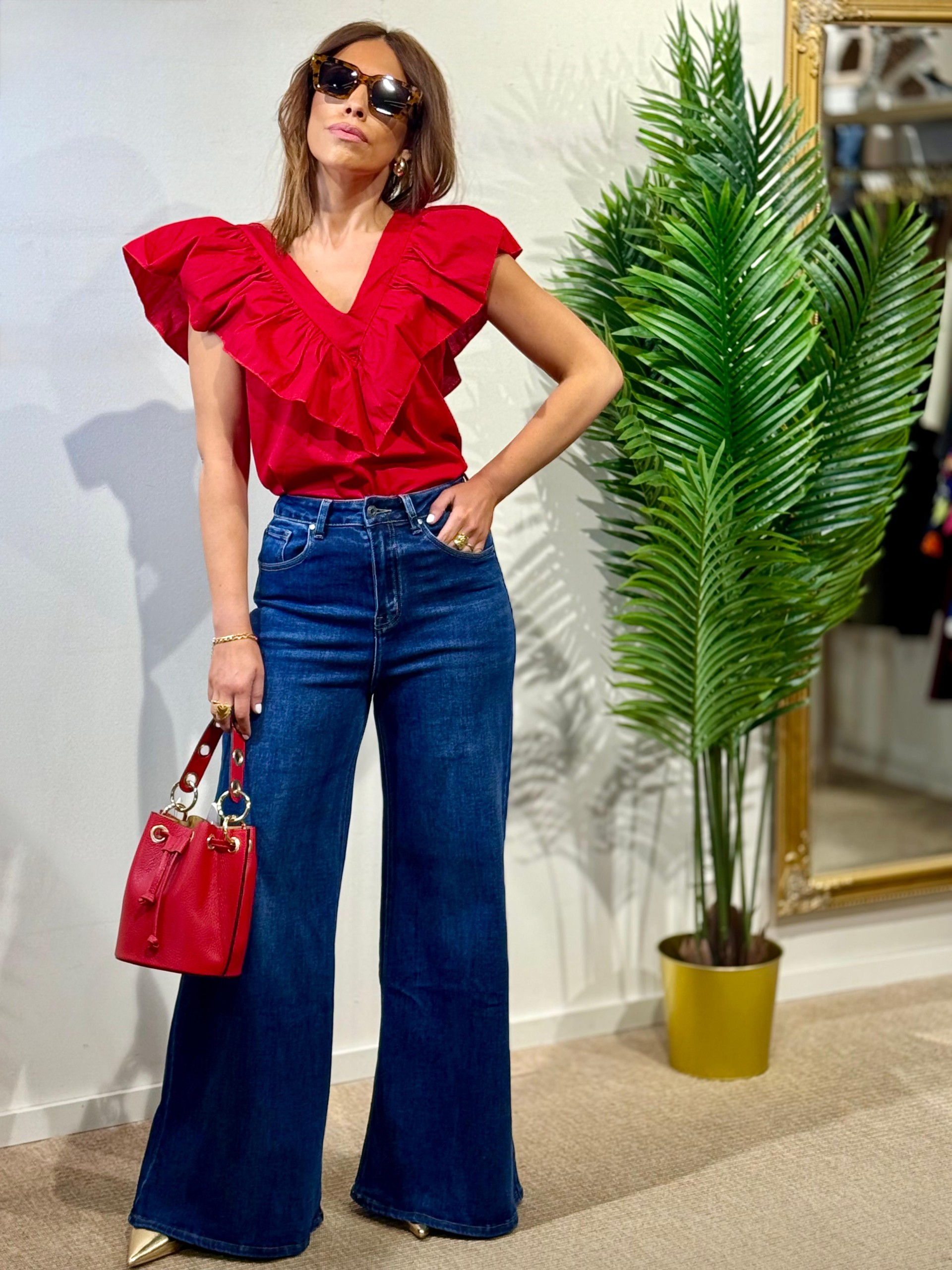 Top escote en Pico y Volantes en hombros en color Rojo. Corte recto y tejido de algodón.