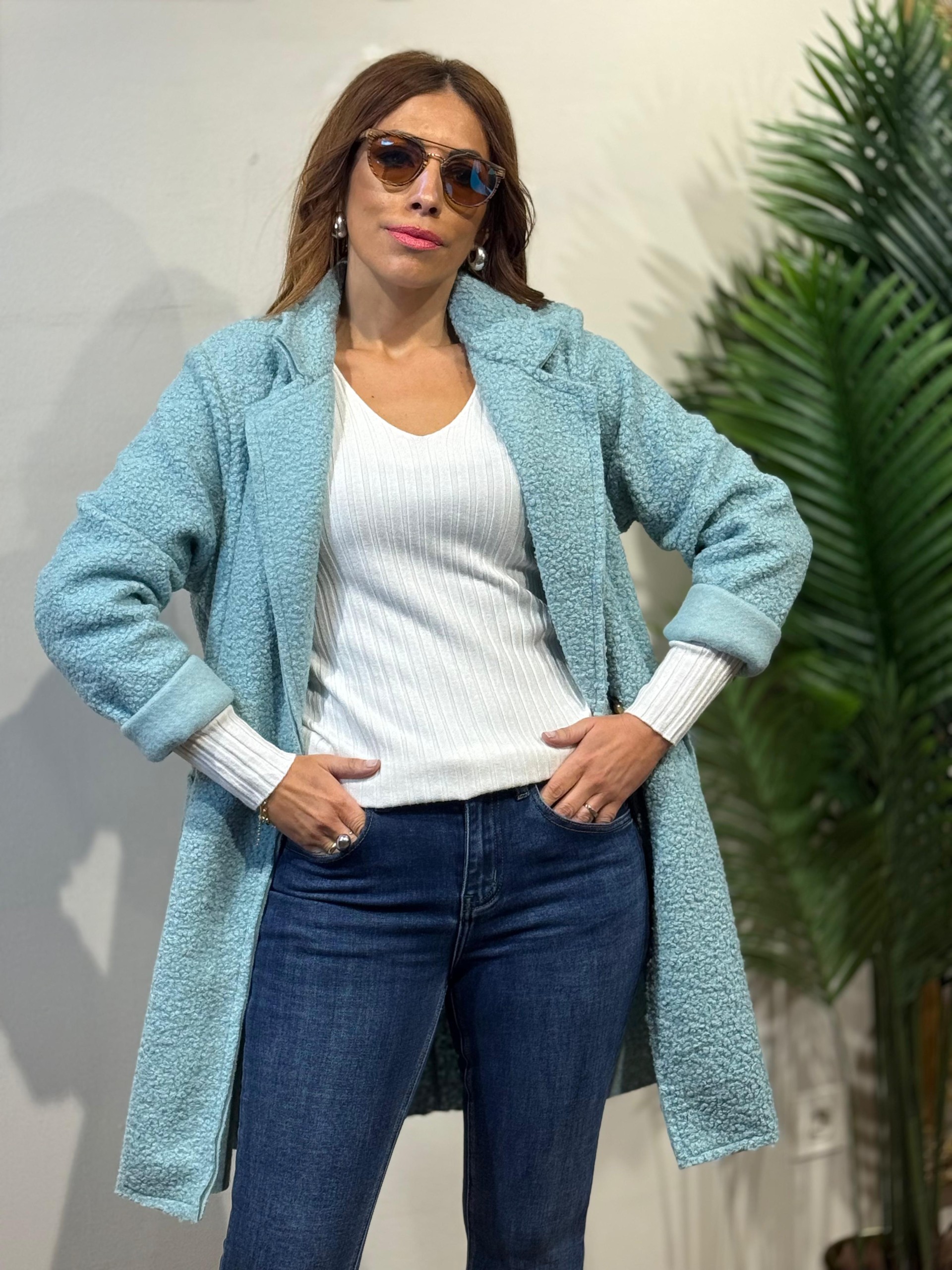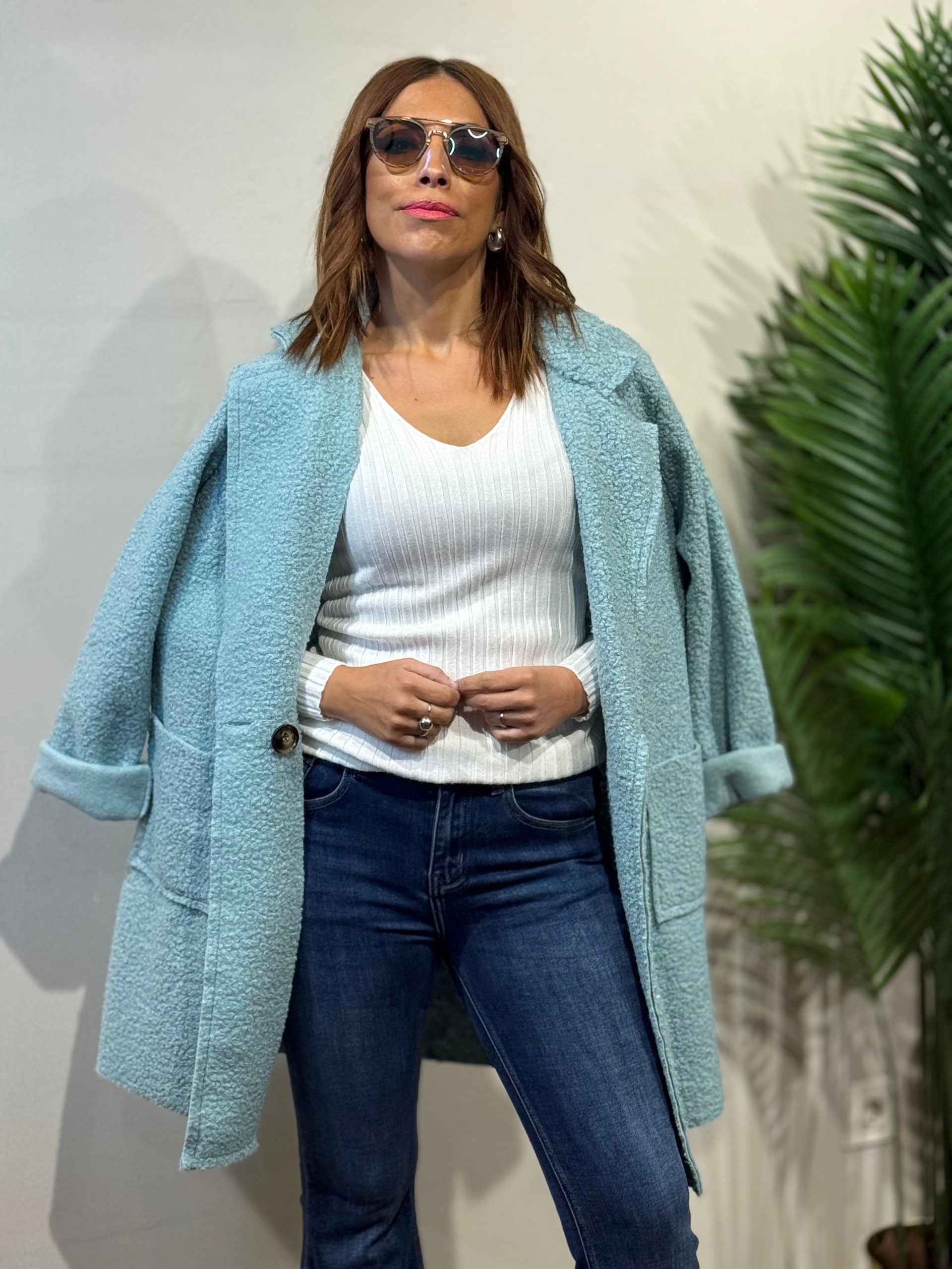 Abrigo rizado verde. Corte over-size y recto. Incluye solapas, bolsillos y botonadura central.