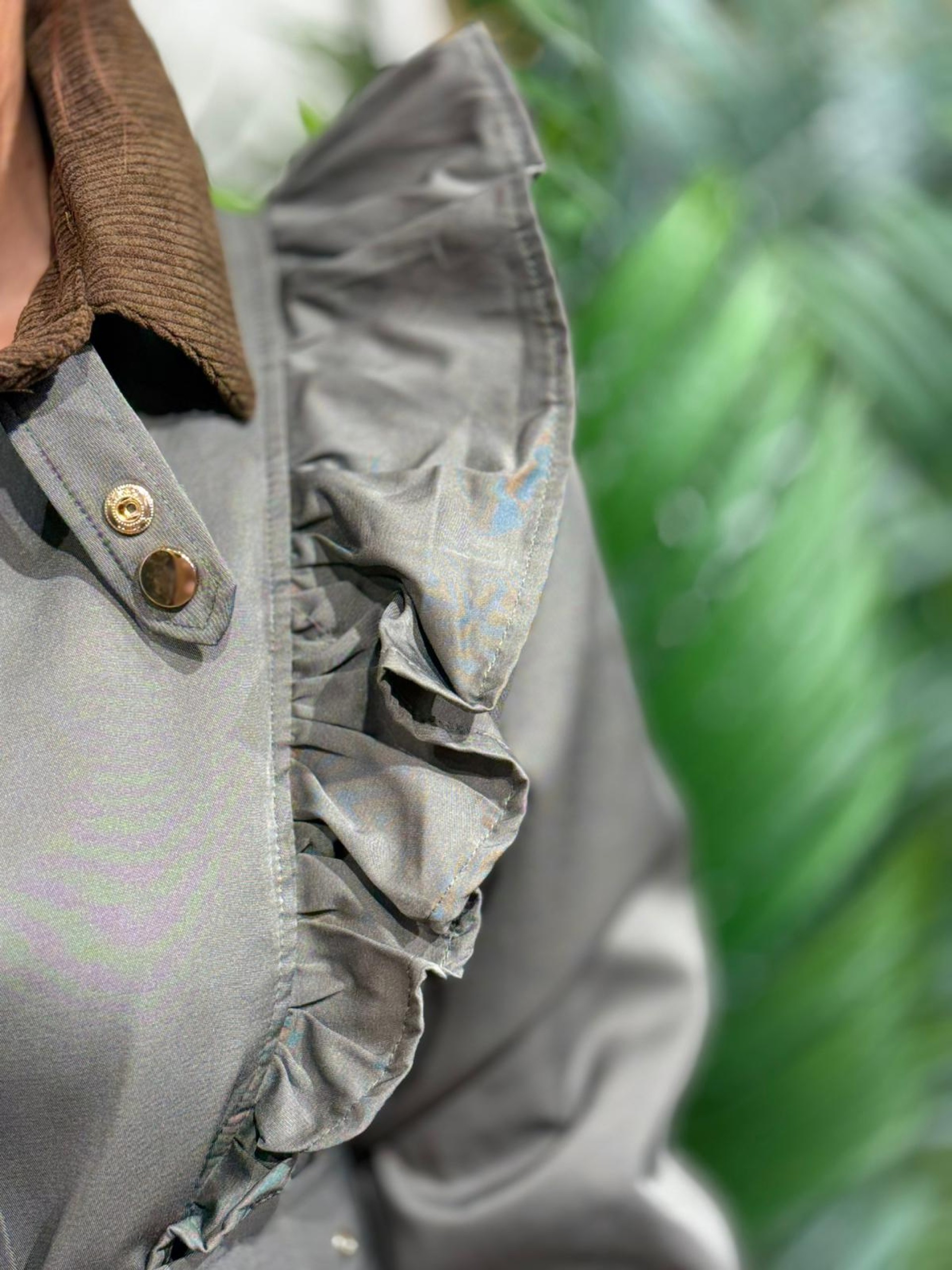 Barbour volantes verde. Tiene botonadura central y bolsillos con detalles dorados. Solapas y puños en micropana choco. Lleva cinturón.