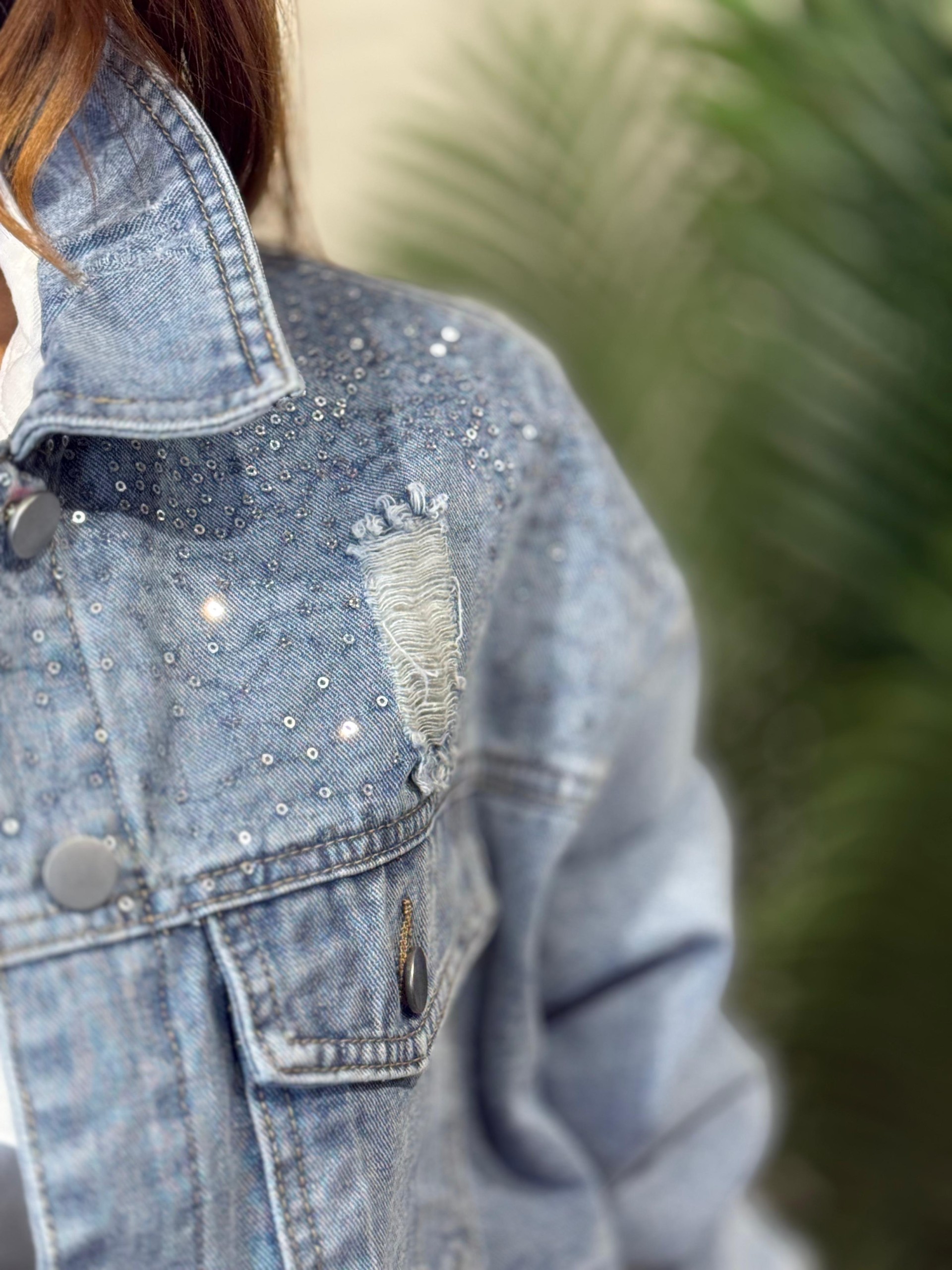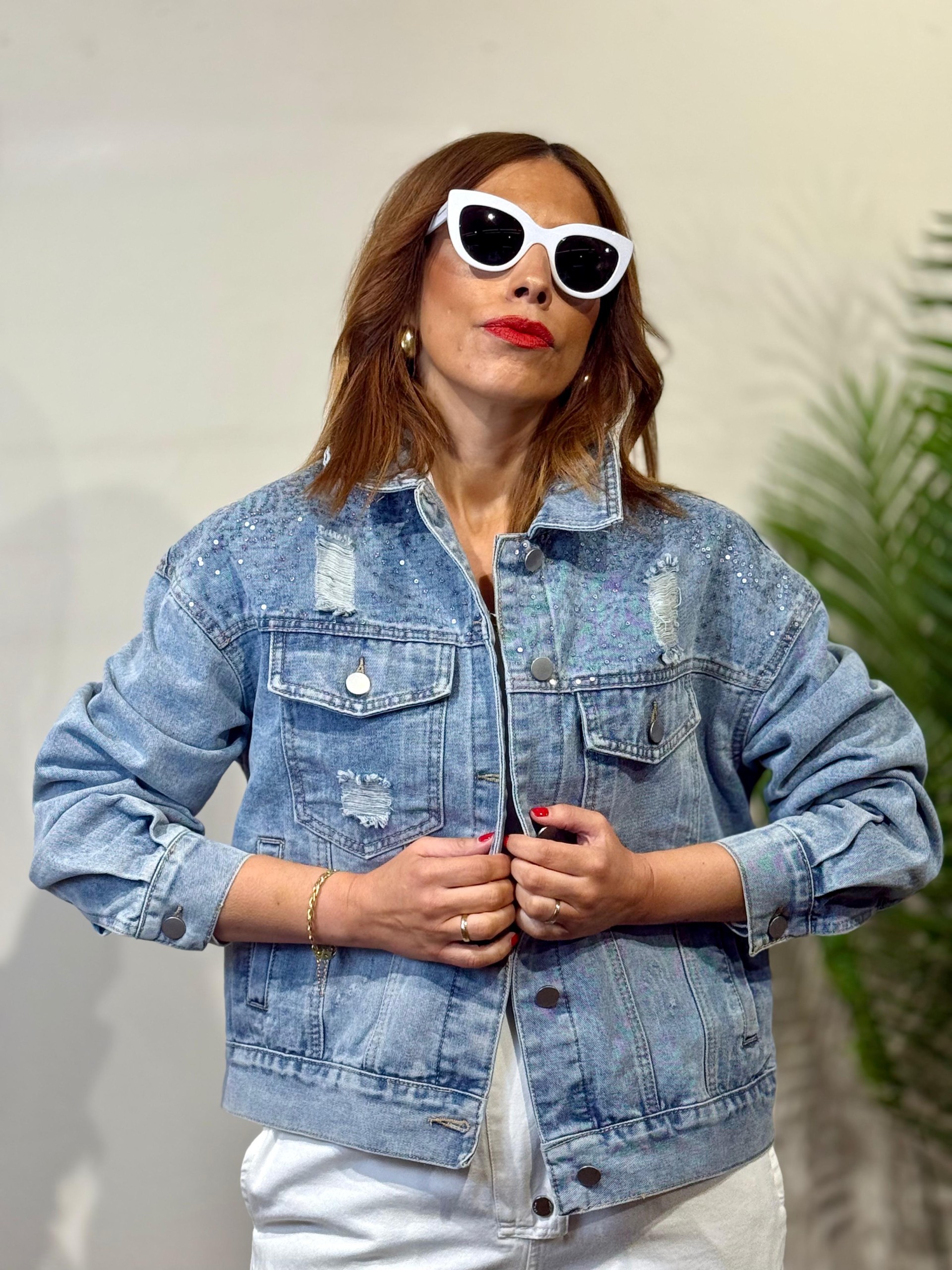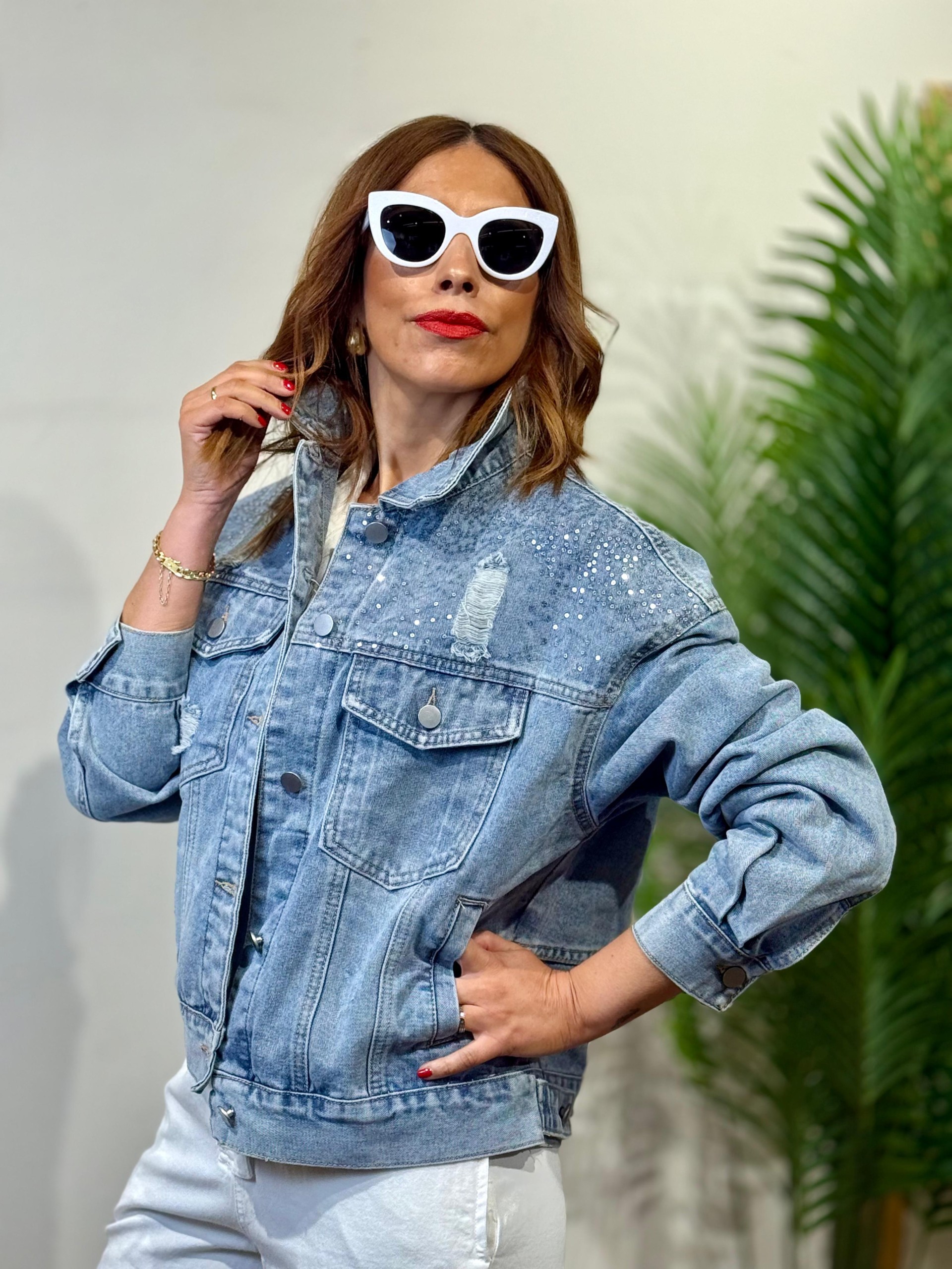 Cazadora Denim Strass. Lleva bolsillos frontales y laterales. Combina detalles rotos y efecto desgastado.