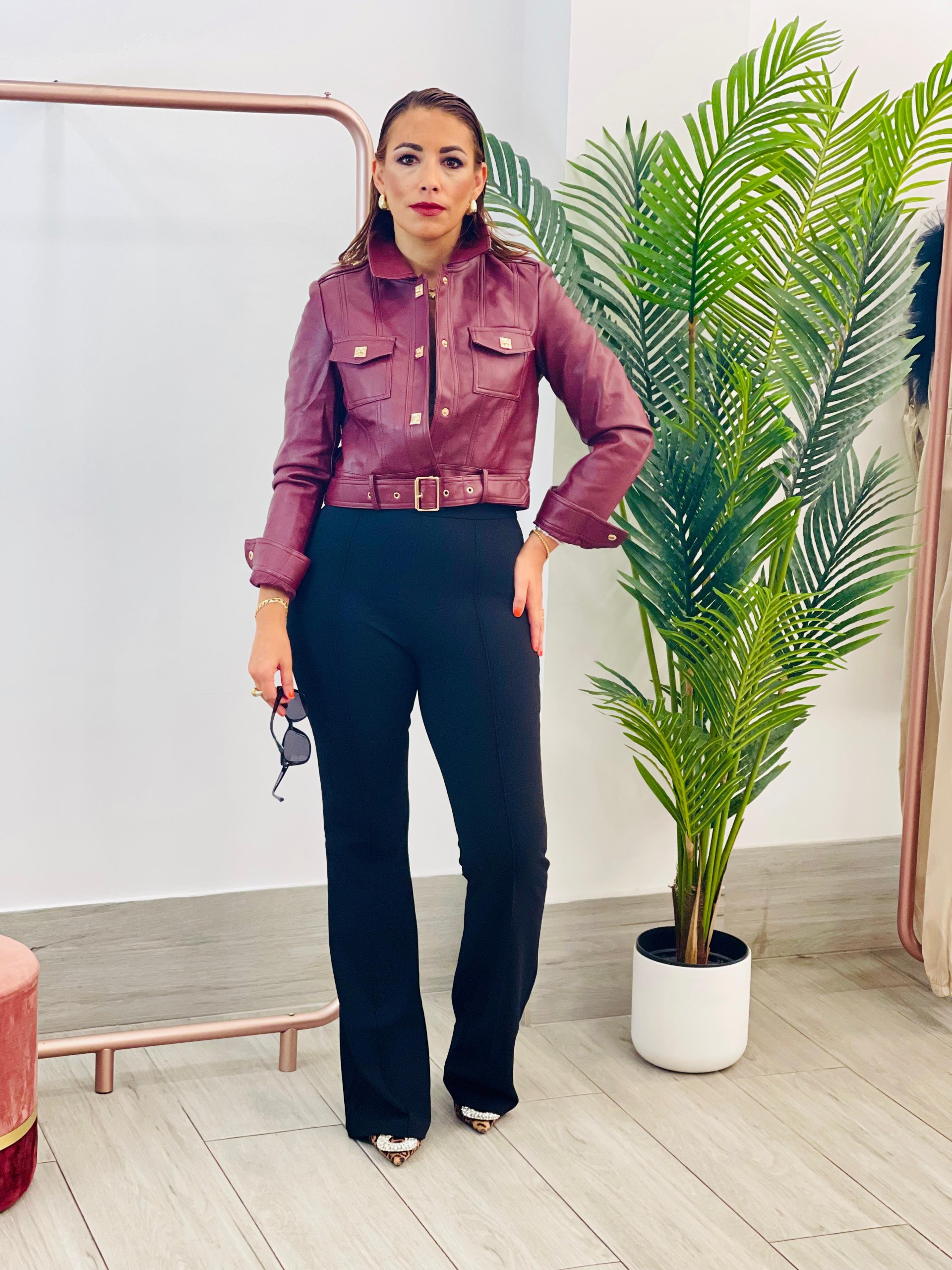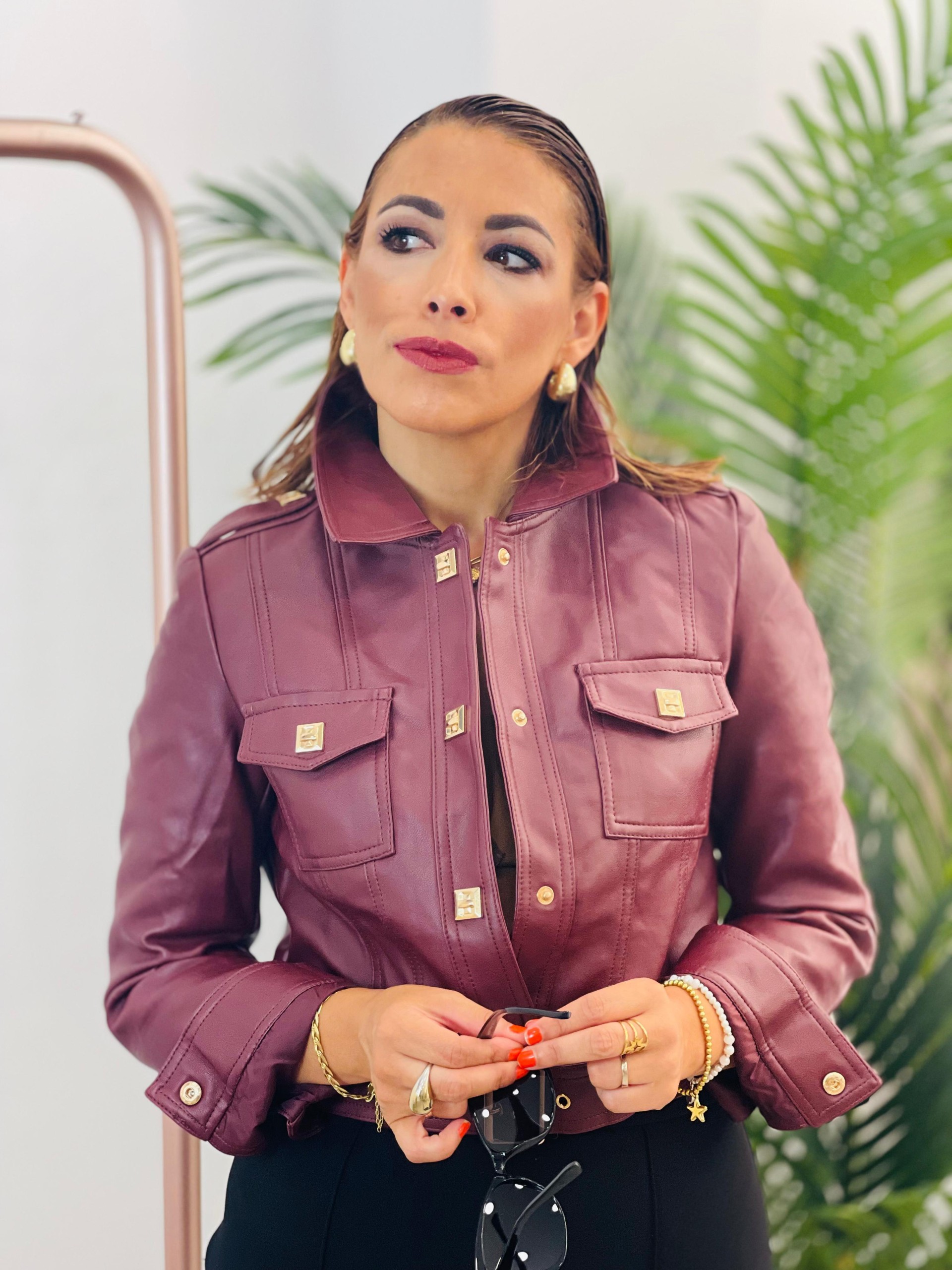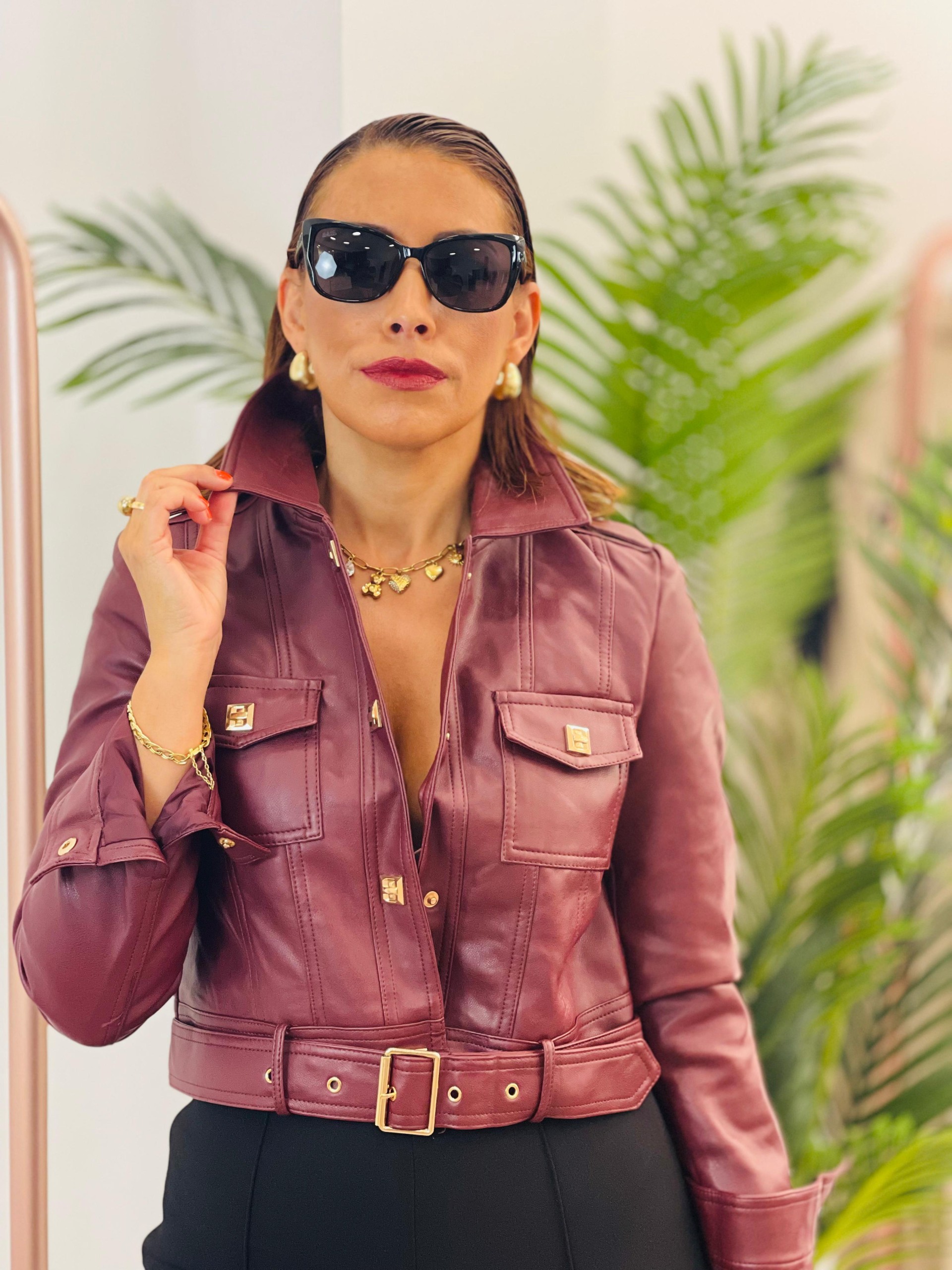 Cazadora torera ecopiel granate. Lleva solapas y Cinturón ajustable. Bolsillos plastines y detalles dorados