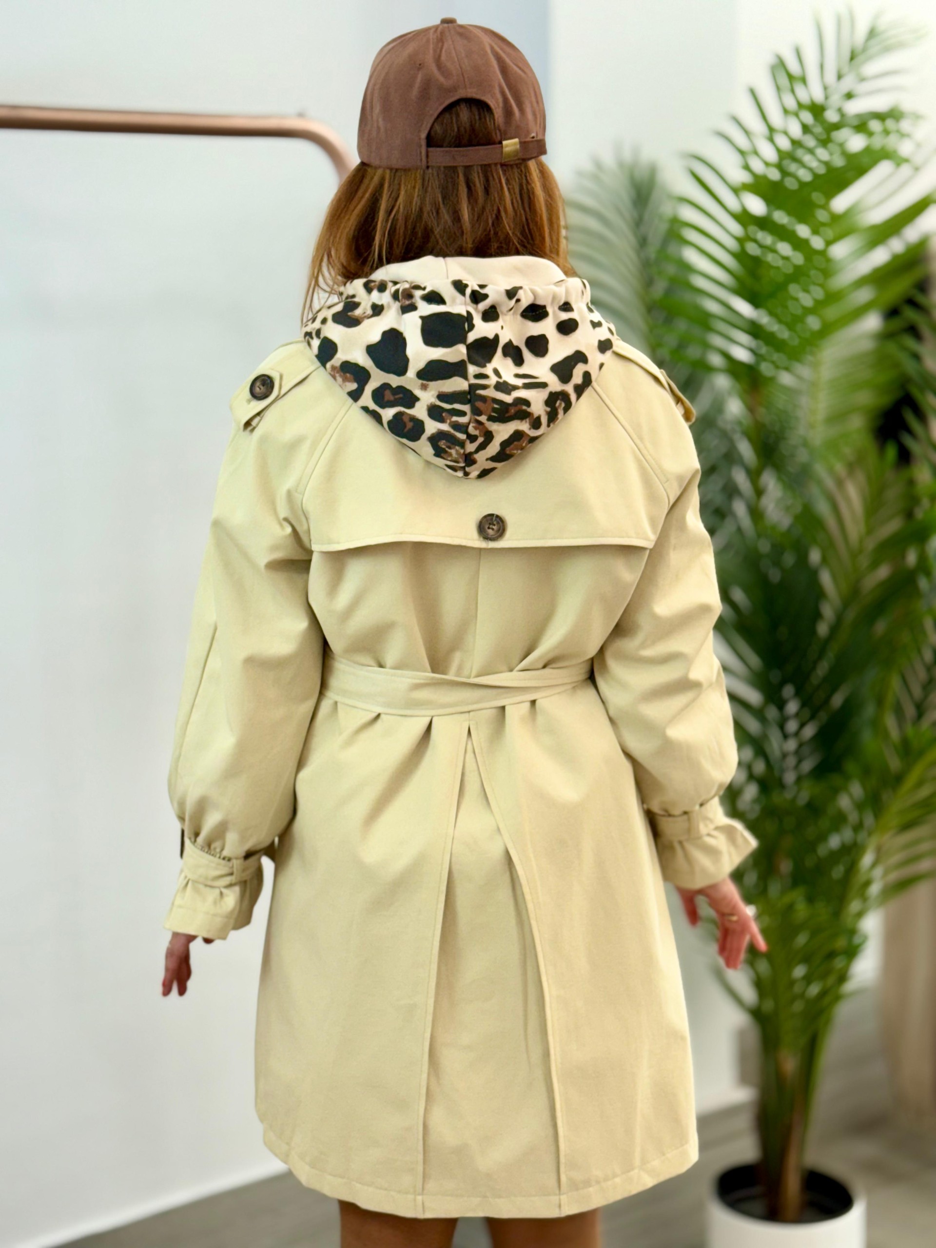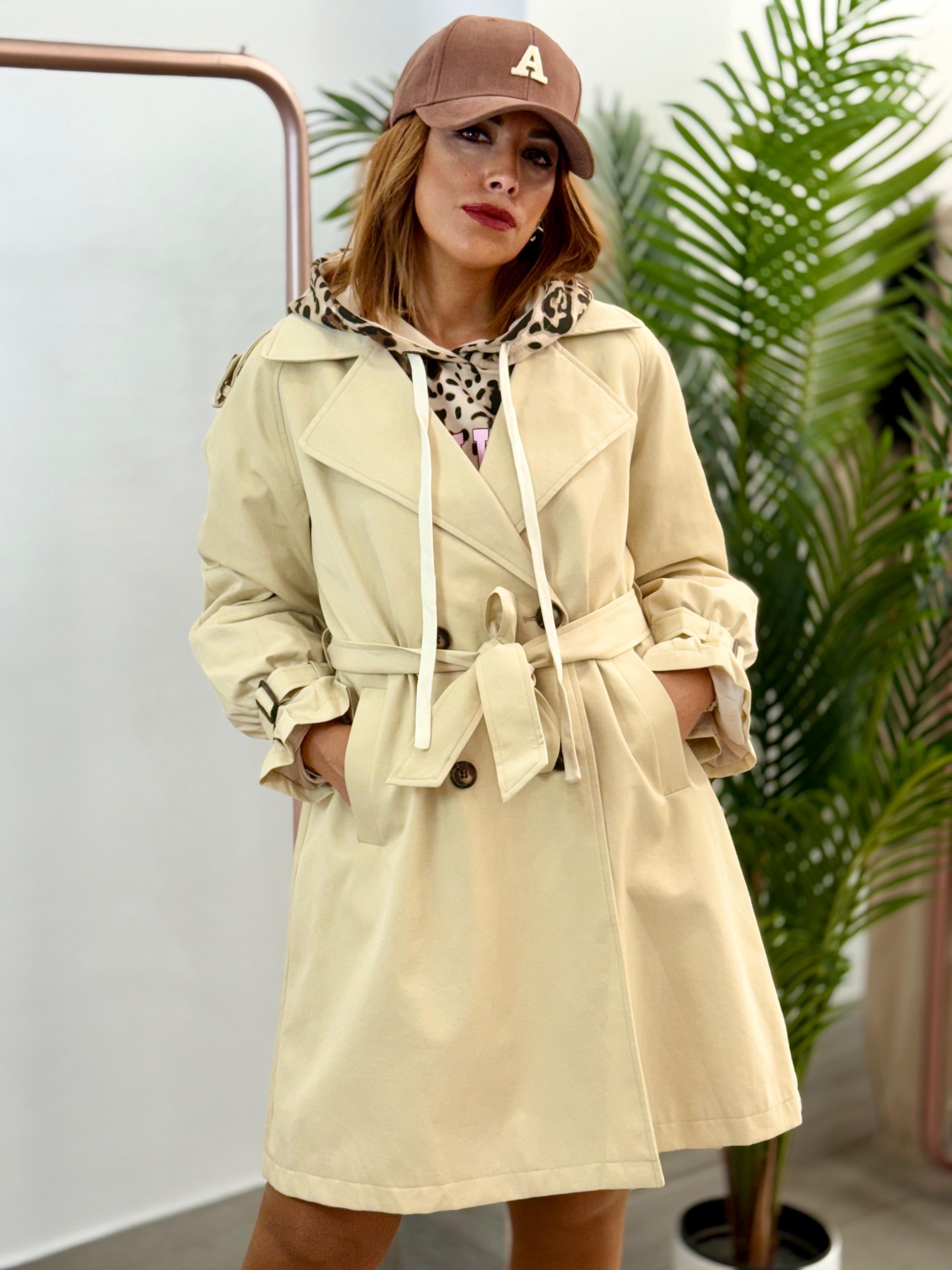 Trench abullonada beige. Lleva solapas con Doble botonadura y manga abullonada. Forro interior y tejido satinado.