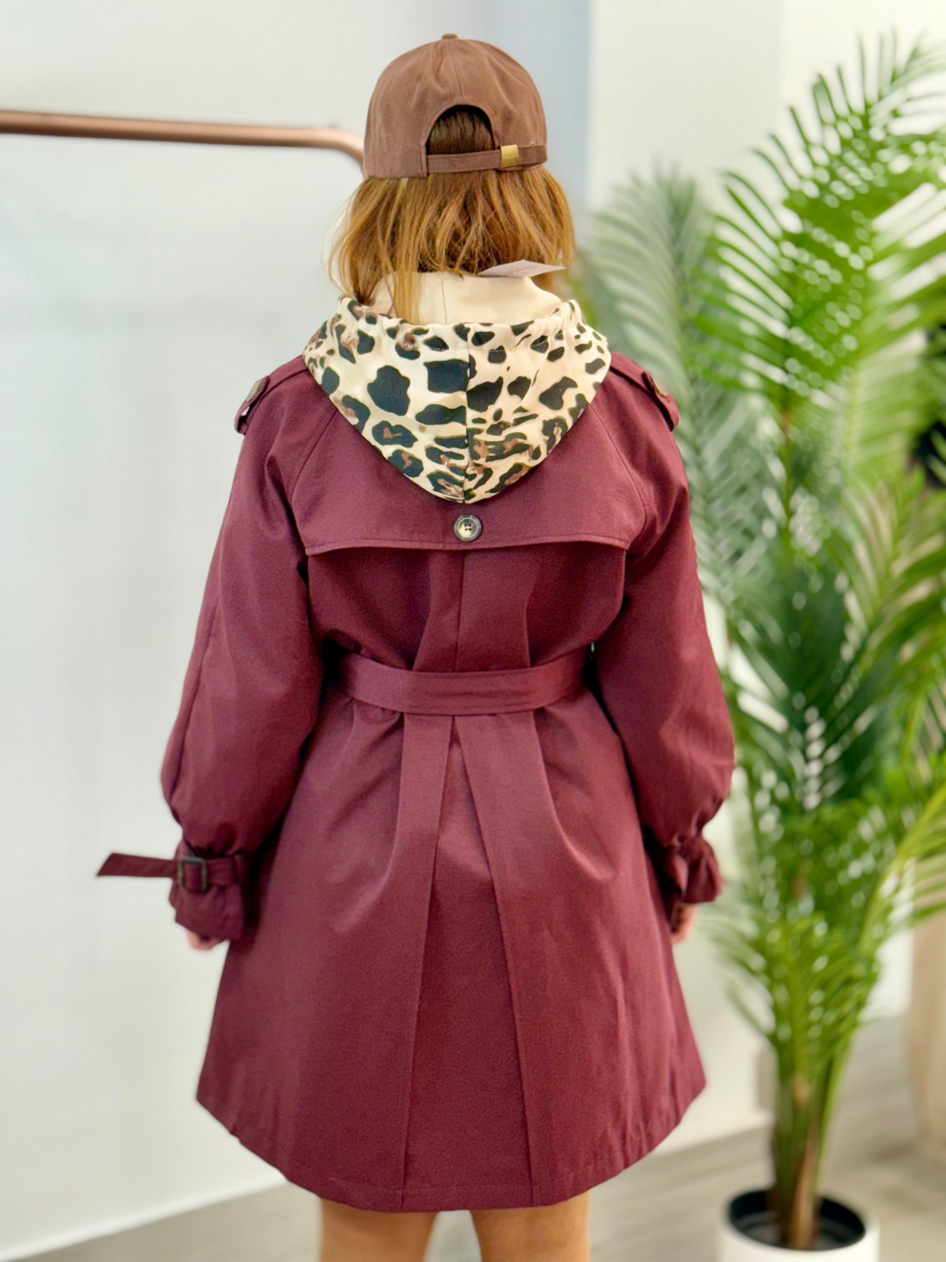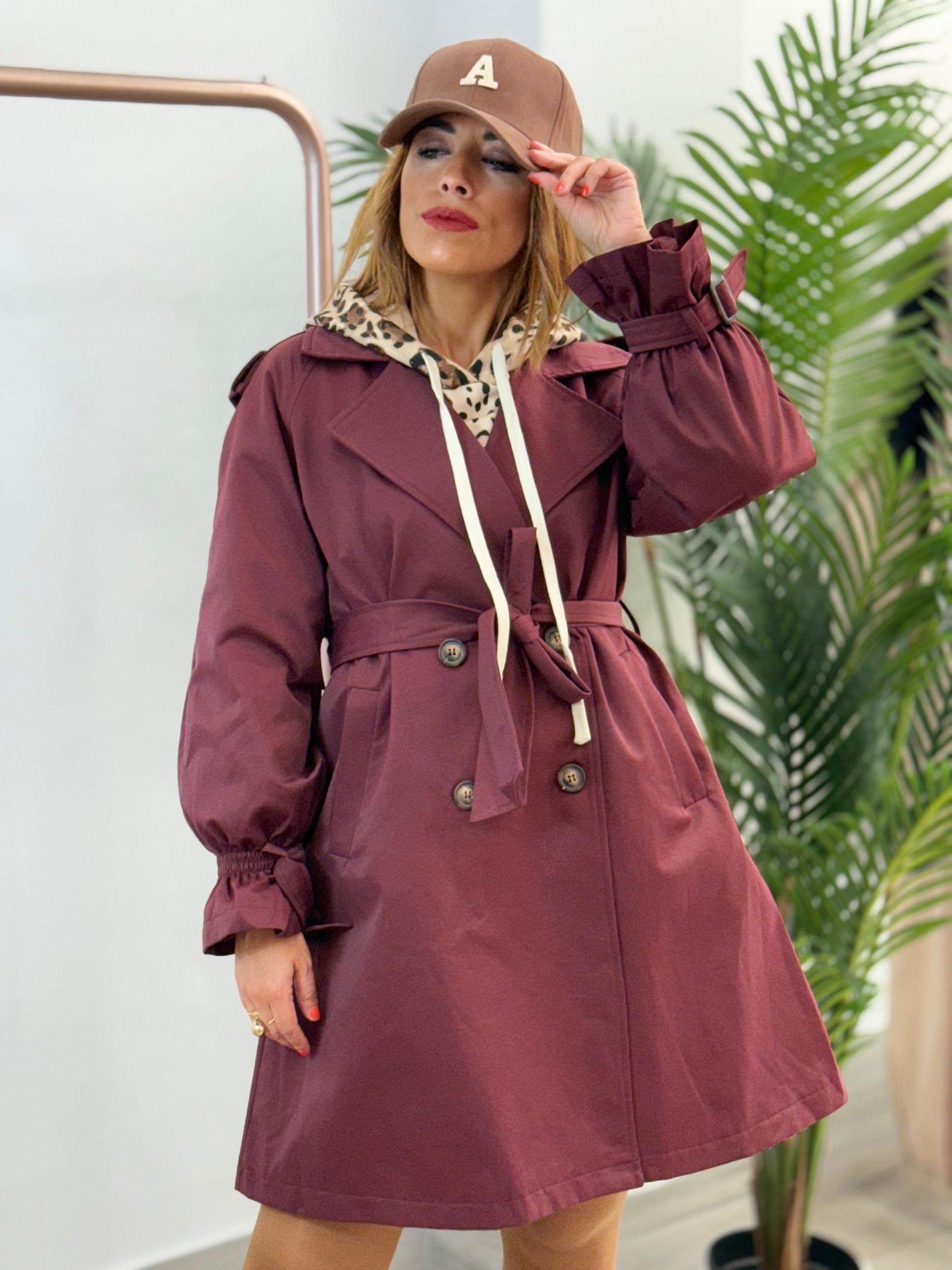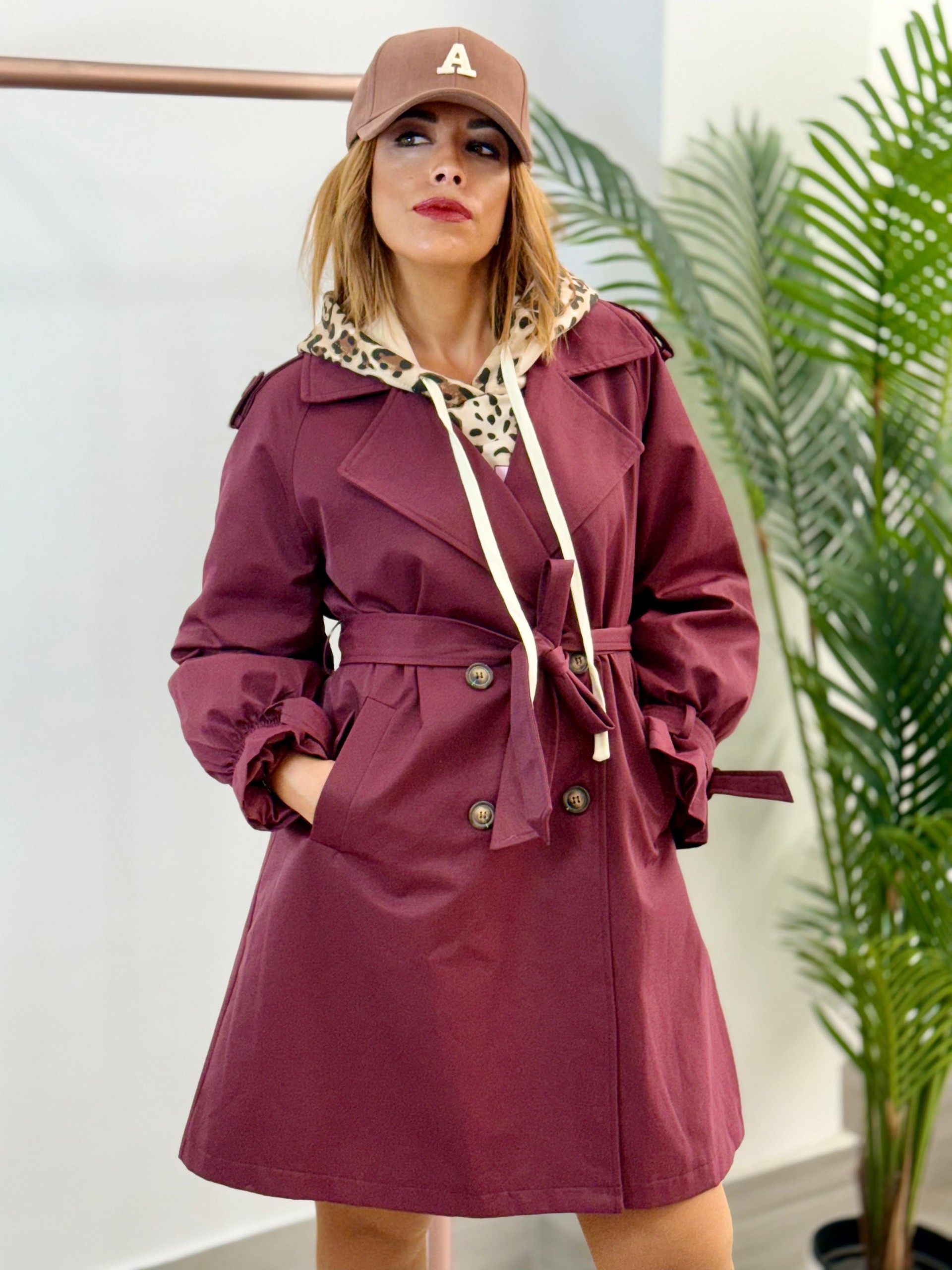 Trench abullonada granate. Lleva solapas con Doble botonadura y manga abullonada. Forro interior y tejido satinado