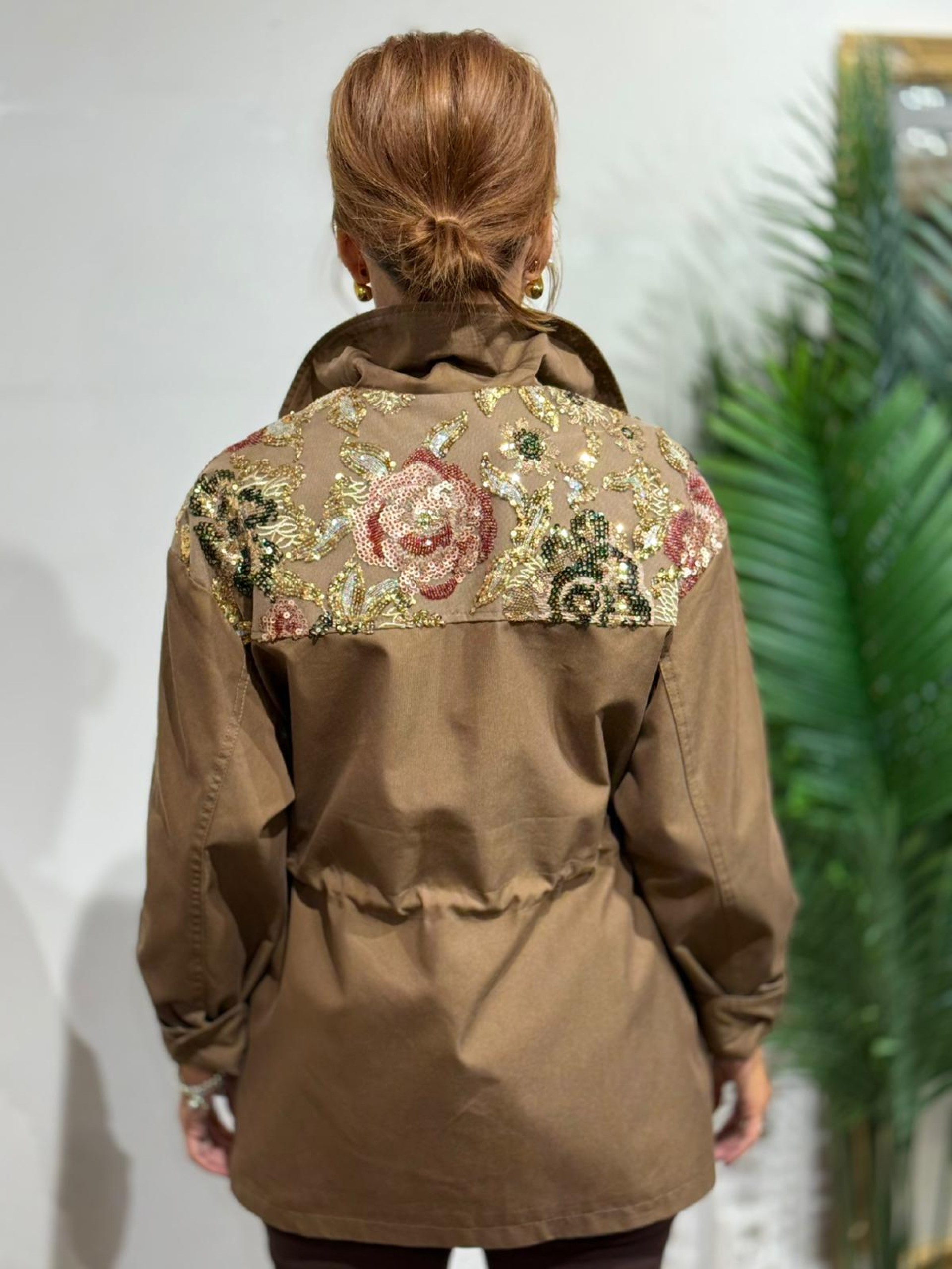 Sahariana oversize lentejuelas Camel. Botonadura central y cordón interior ajustable en cintura. Contiene bolsillos y dibujo de flores en lentejuelas de varios colores.
