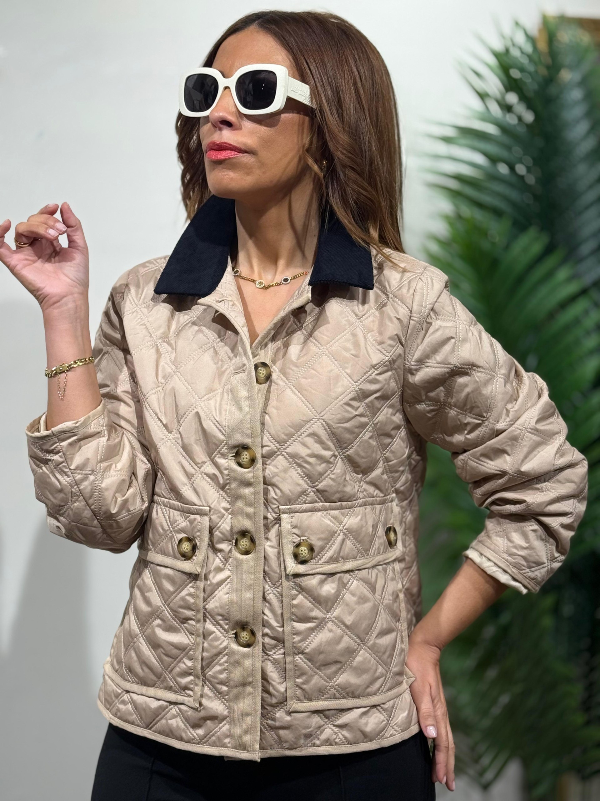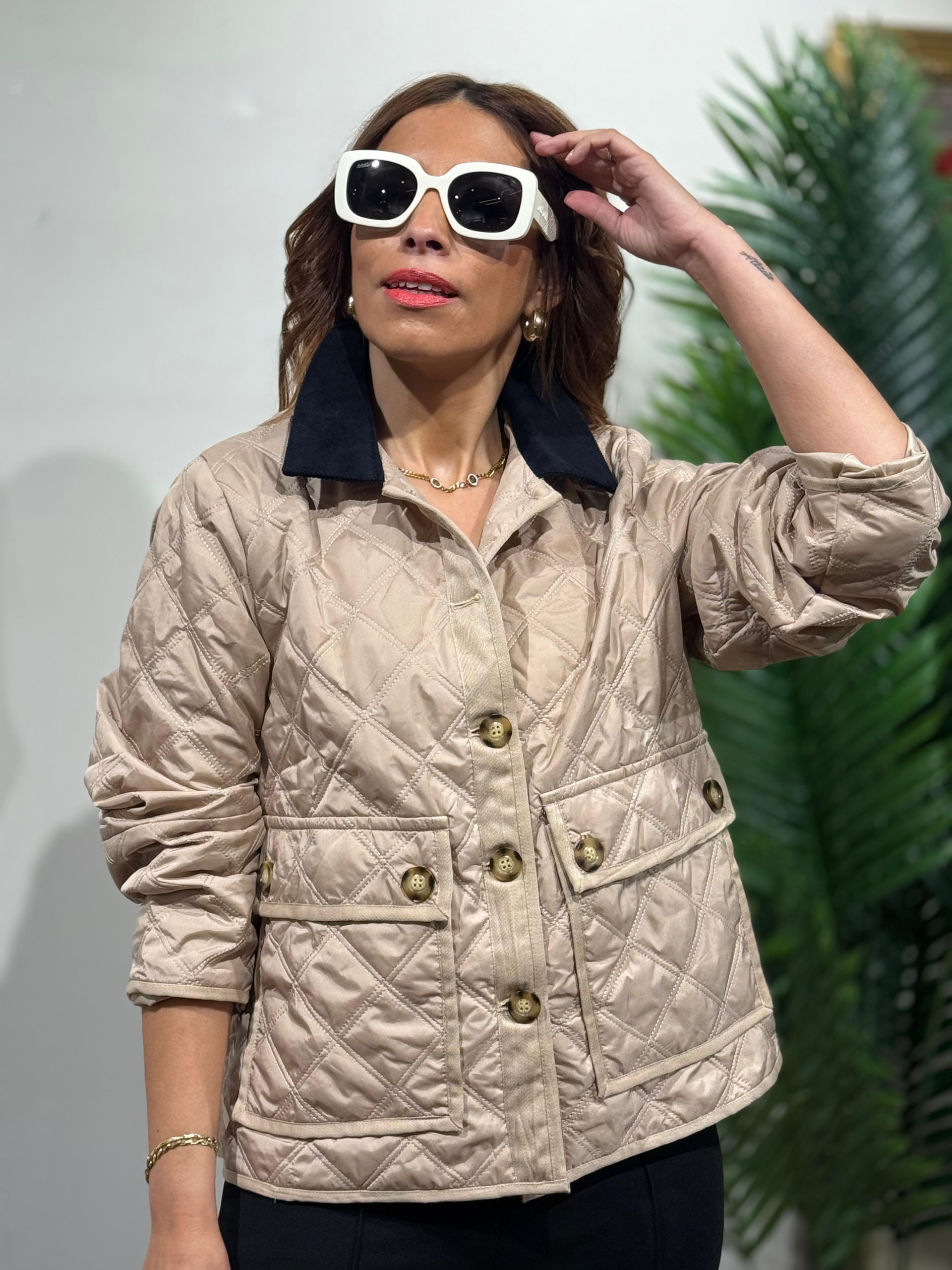Chaqueta jasky semi acolchada beige. Incluye bolsillos y botonadura central. Corte recto y cuello con micro pana en azul marino.