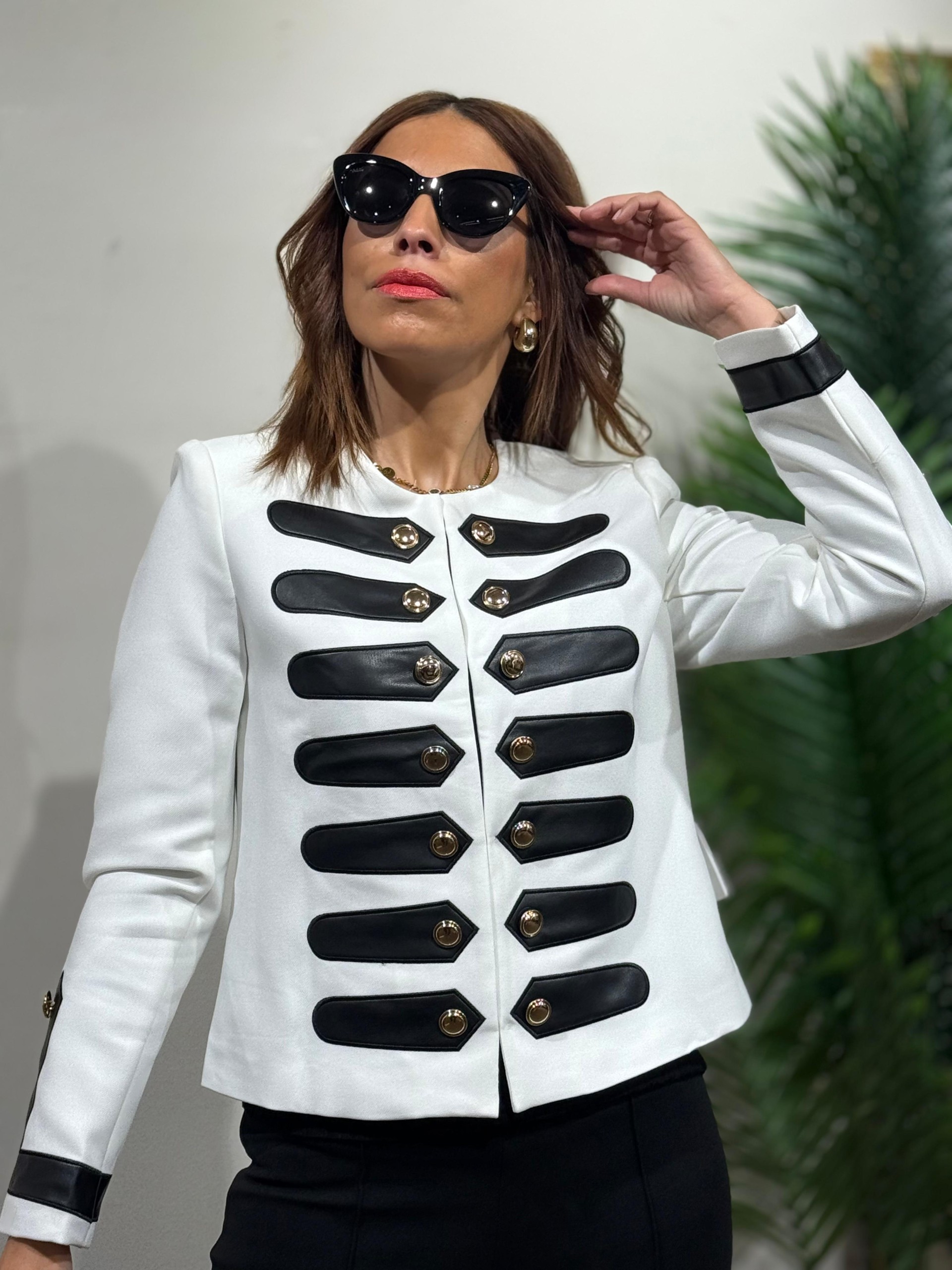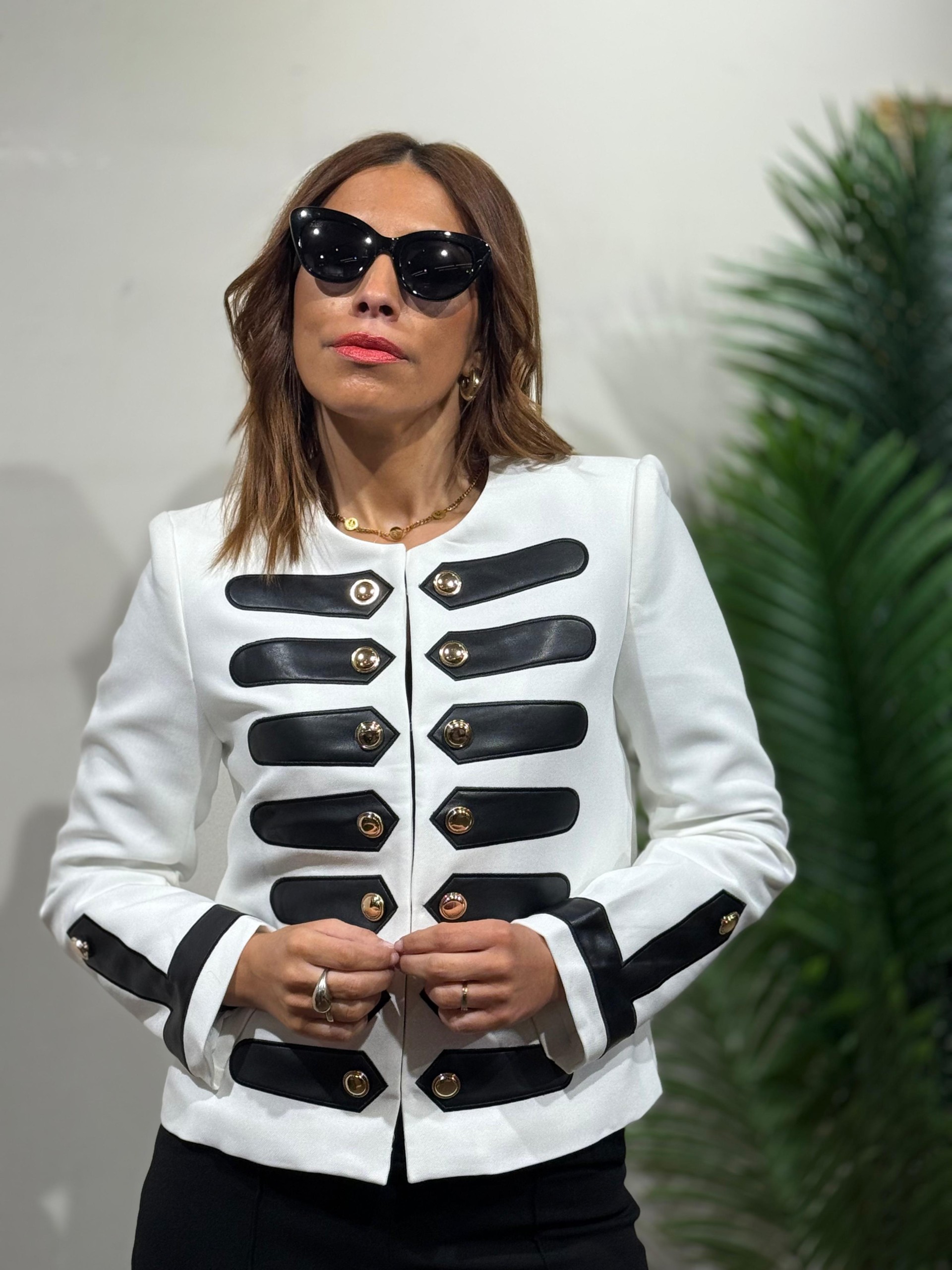 Chaqueta militar blanca con detalles en Polipiel negro. Botonadura central con enganches internos. Contiene hombreras.
