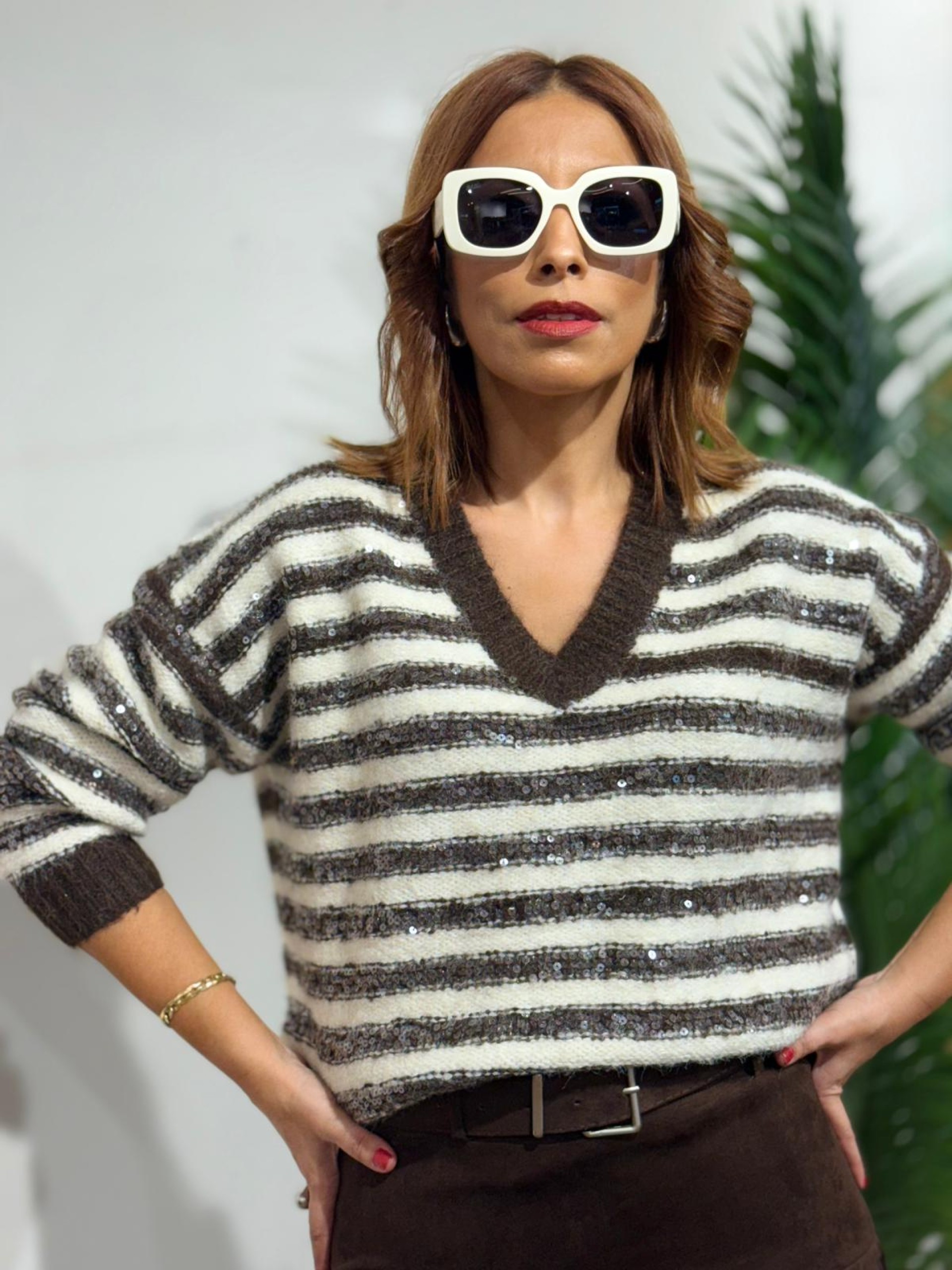 Jersey rayas lentejuelas choco. Cuello pico y rayas choco y blanco.