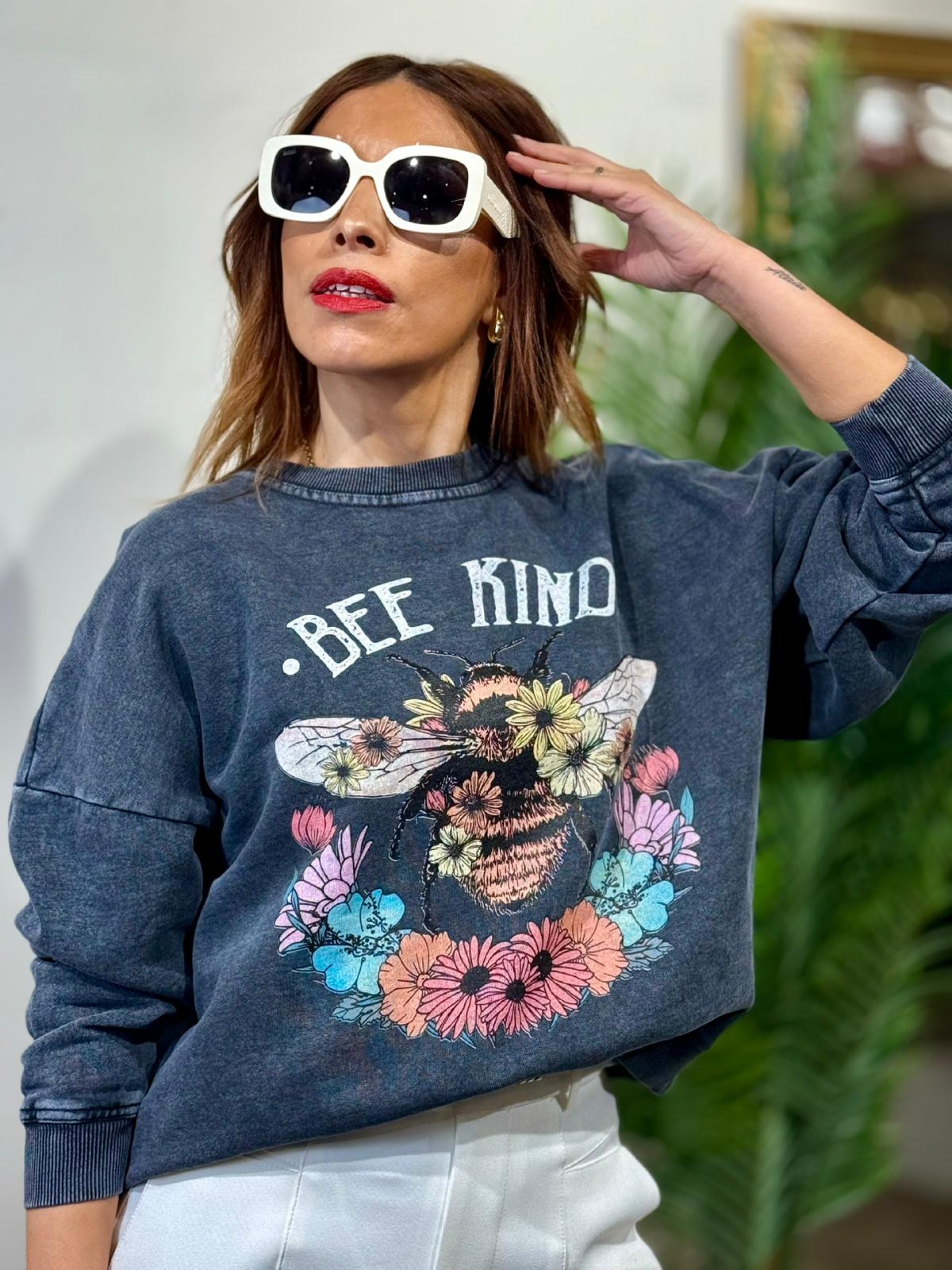 Sudadera BEE gris efecto desgastado. Corte oversize. Engomada en puños y bajo.