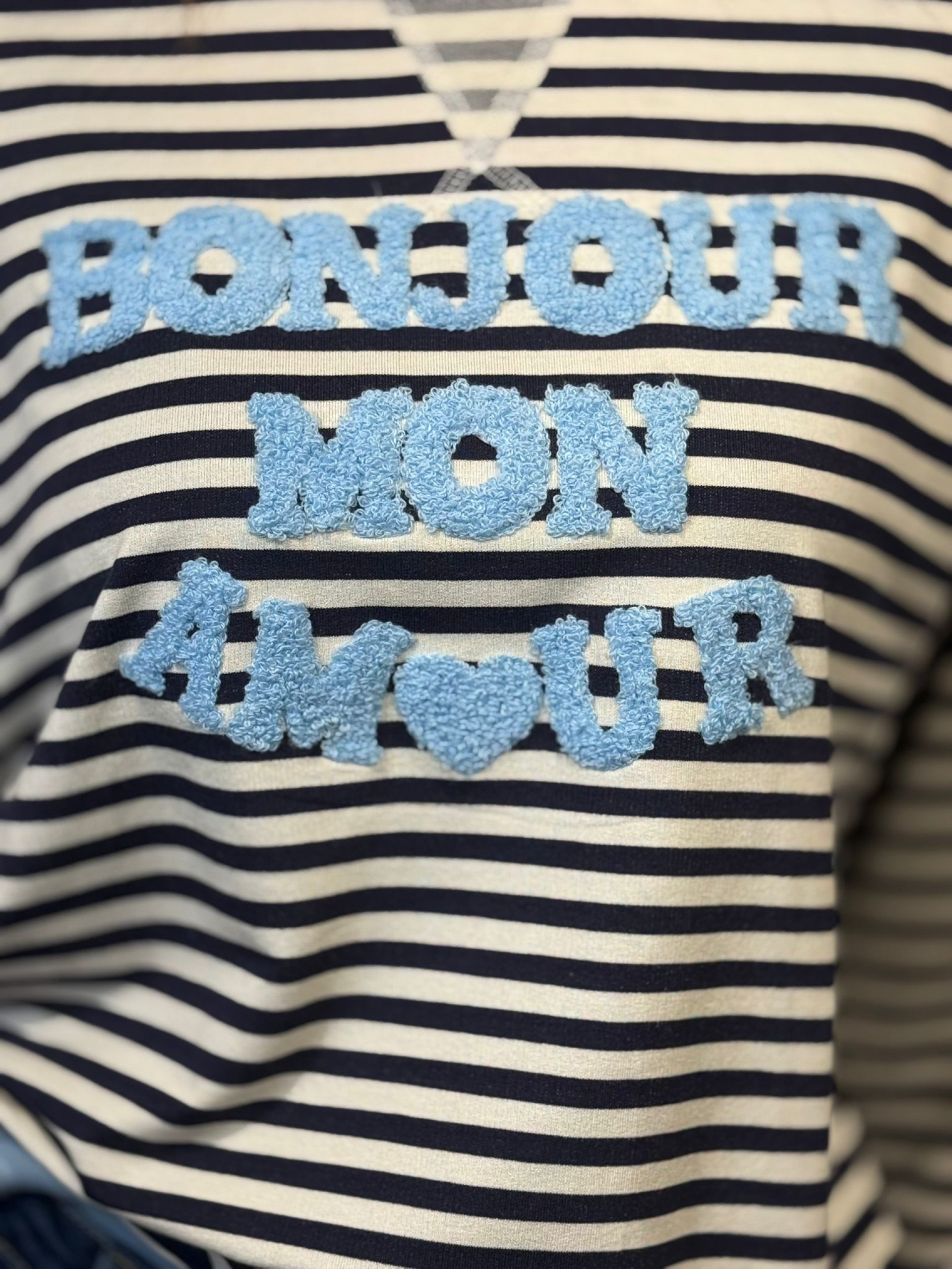 Sudadera BONJOUR bordado rayas marino y blanco. Corte oversize. Cuello, puños y bajo engomados en azul cielo.
