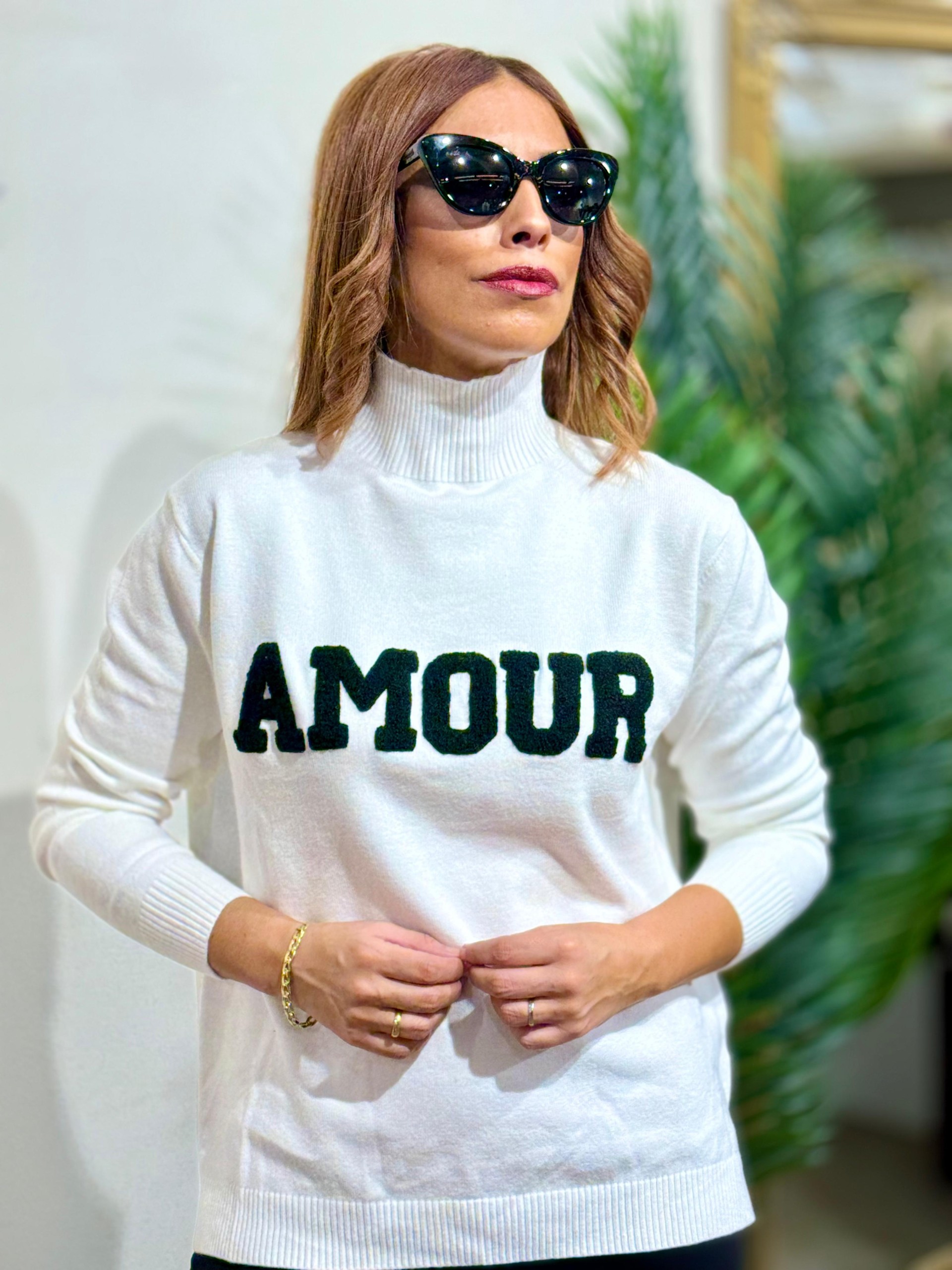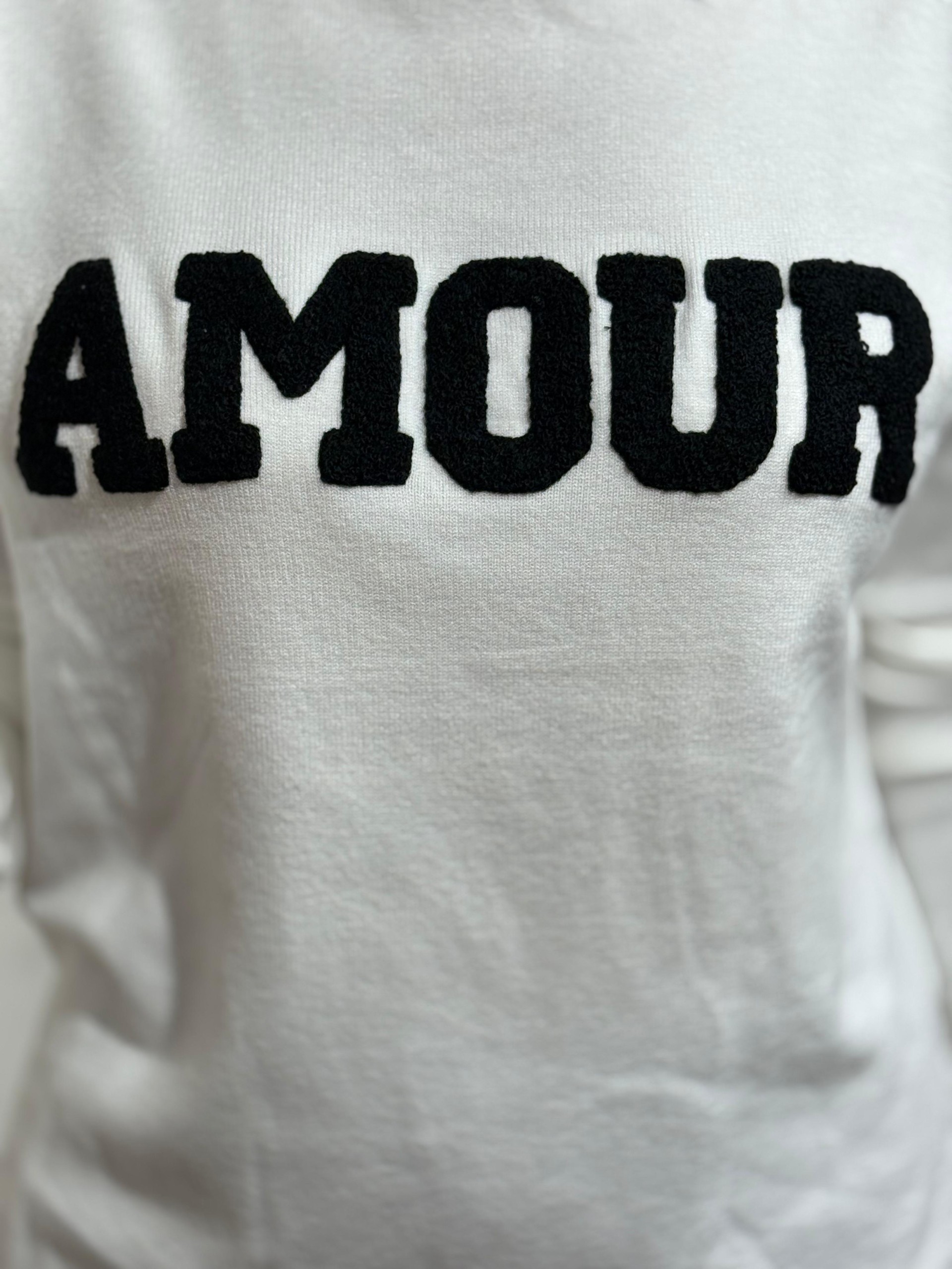 Jersey AMOUR largo blanco. Cuello perkins y más largo por delante que por detrás. Mensaje AMOUR bordado en negro.