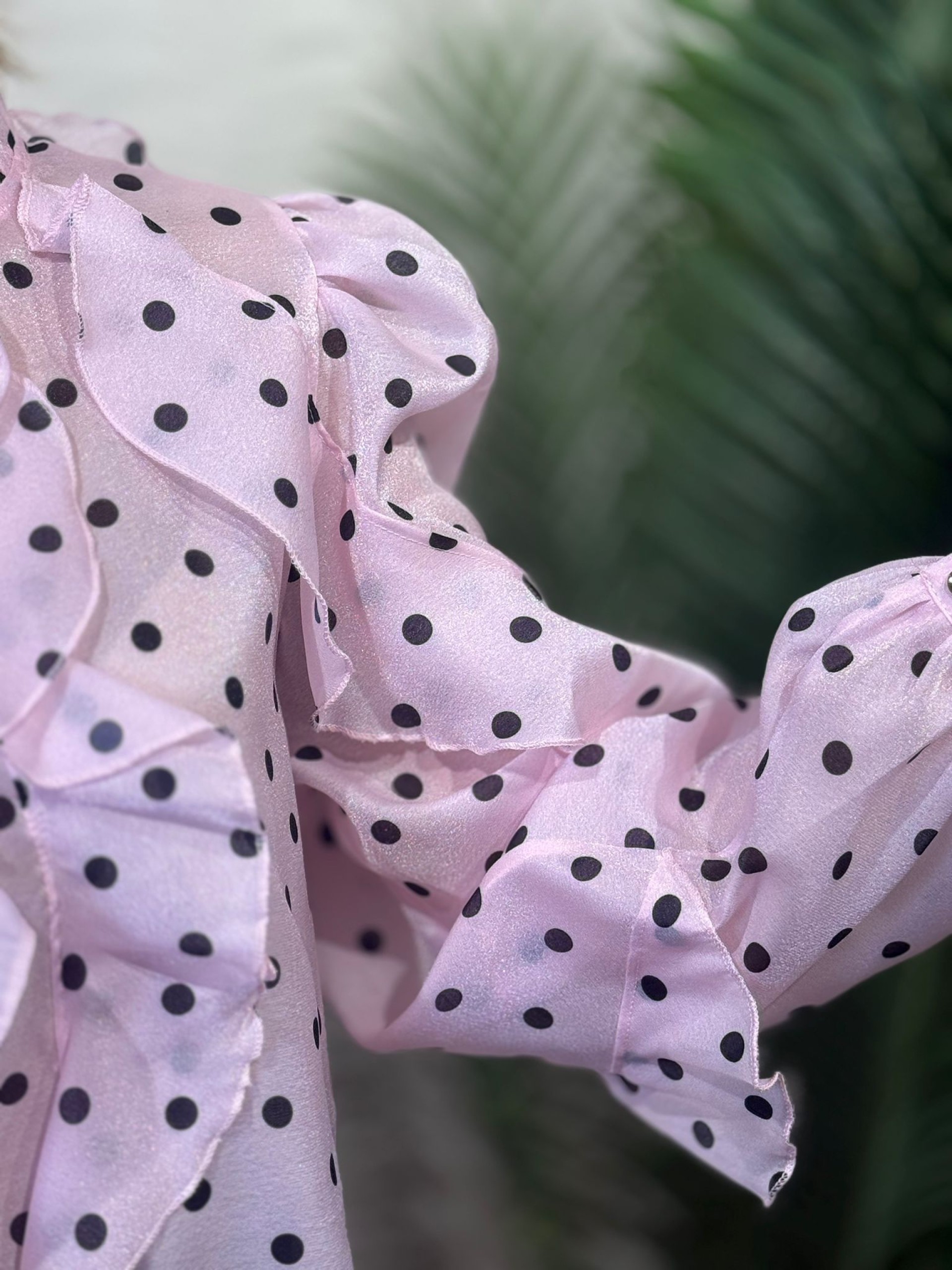 Blusa Rosetón Rosa con Lunares Negros. Lleva Manga farol y detalle de volantes.