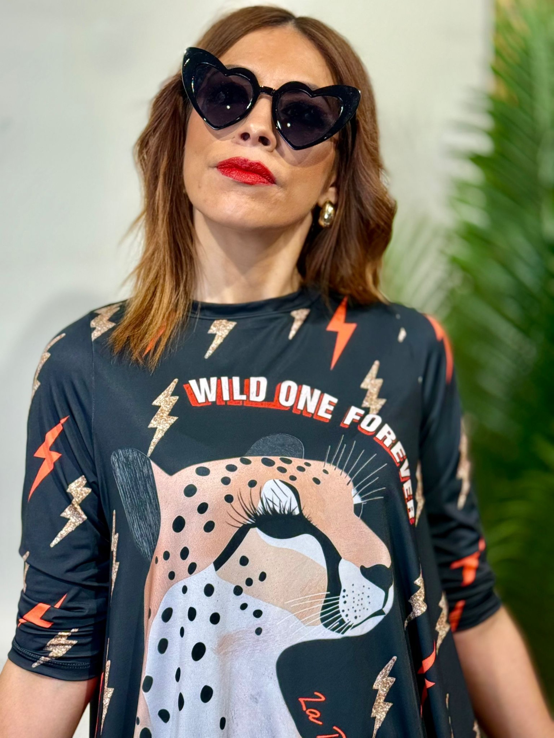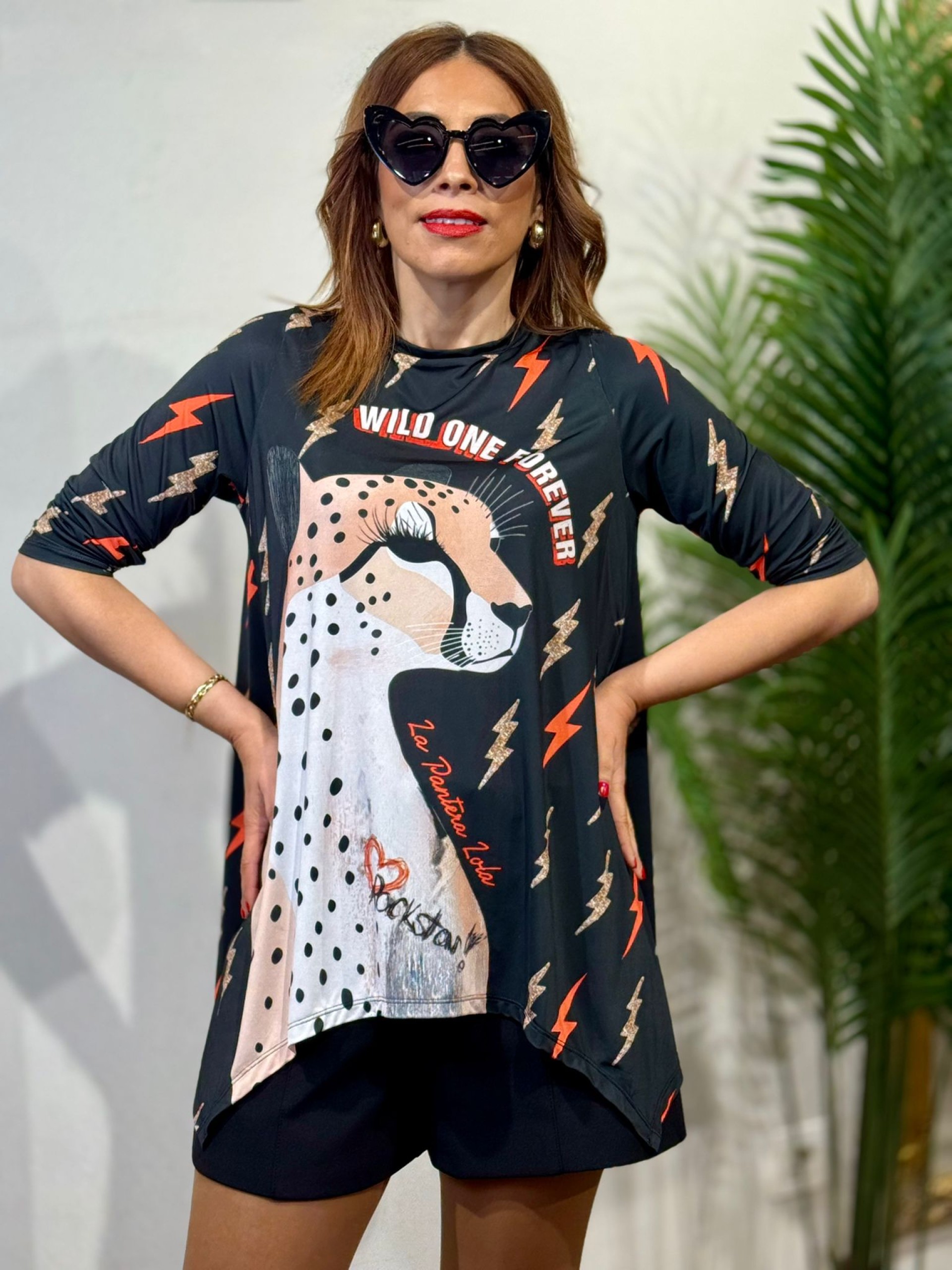 Camiseta Asimétrica Wild Print Negra. Combina estampación de rayos en rojo y glitter dorado. Manga francesa y cuello redondo.