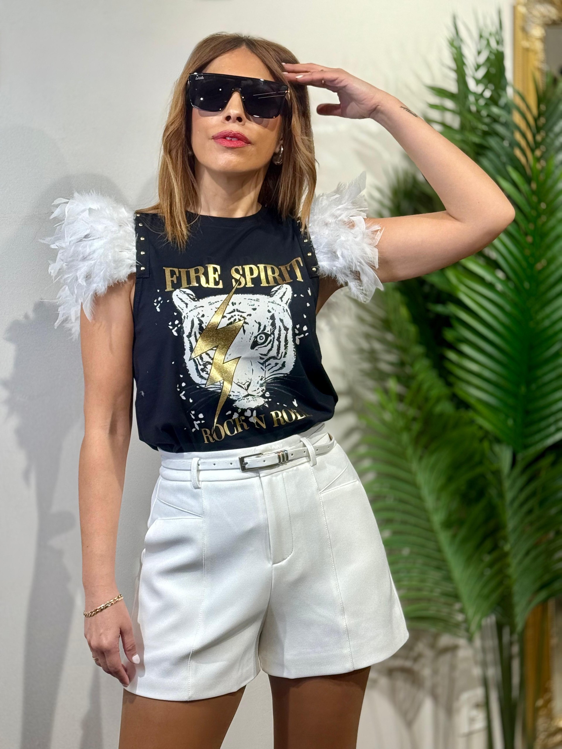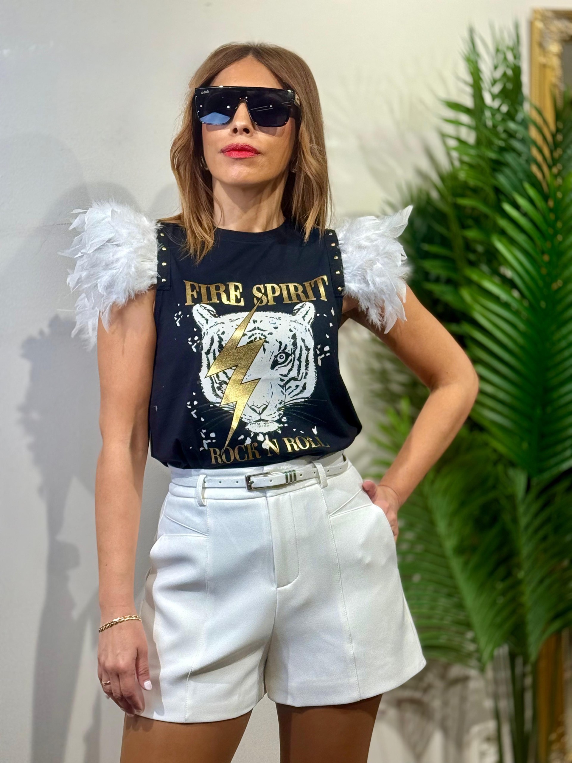 Camiseta FIRE SPIRIT negra plumas blancas. Corte evasé y bajo irregular: más larga en la parte trasera. Lleva tachas en hombros y estampación central en metalizado dorado.