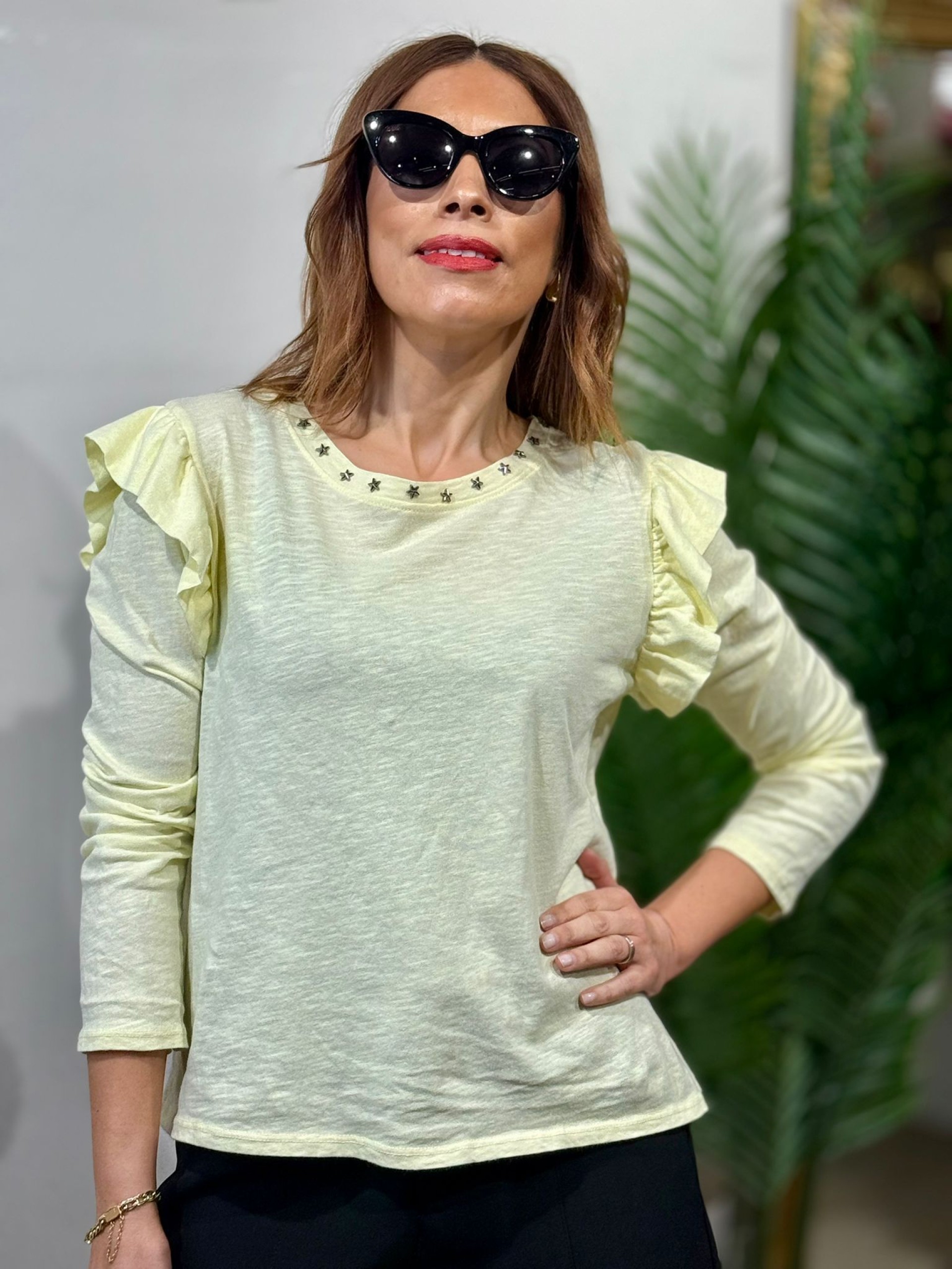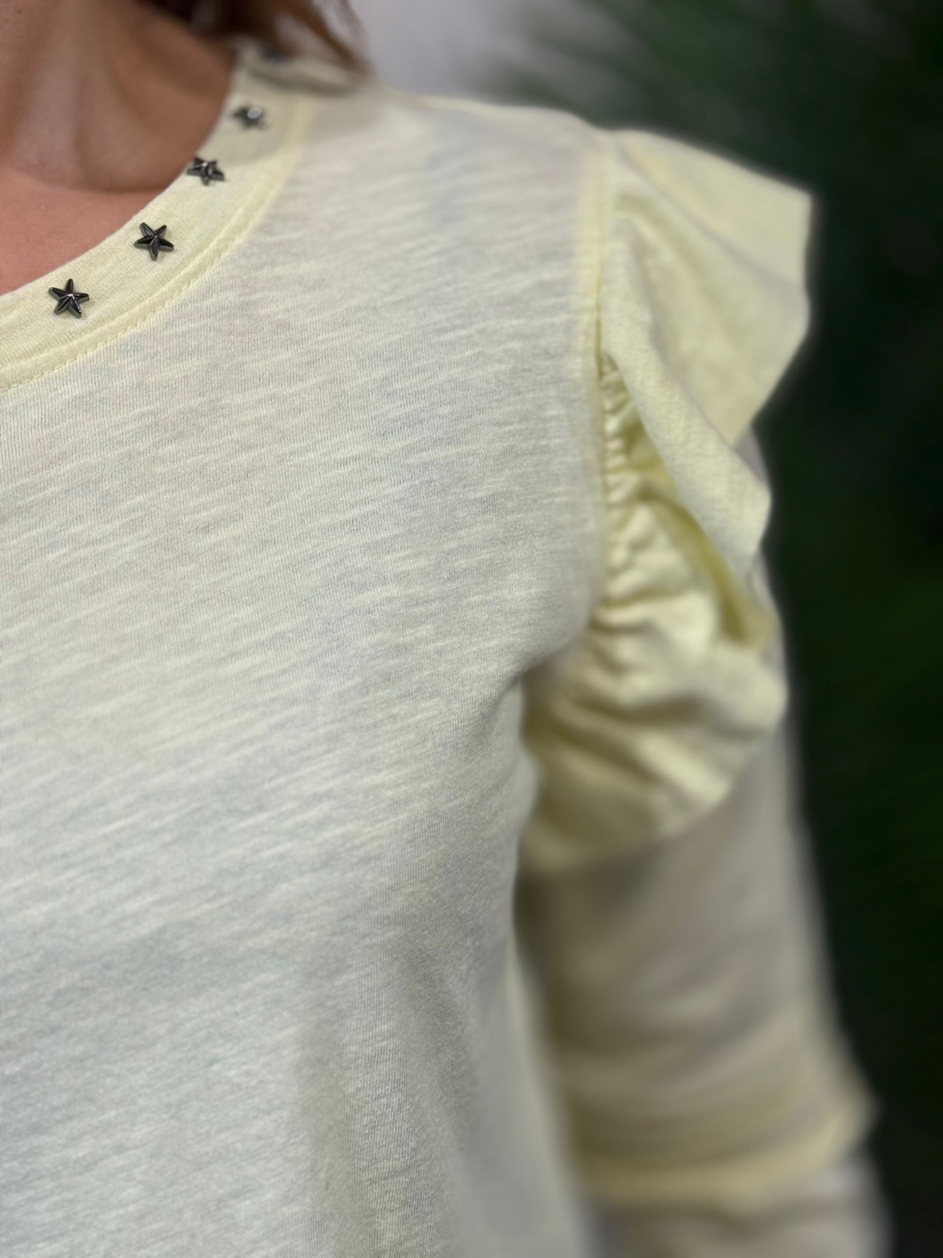 Camiseta tachas volantes amarilla. Algodón en Manga larga. Incluye Tachas en forma de estrella plateadas.