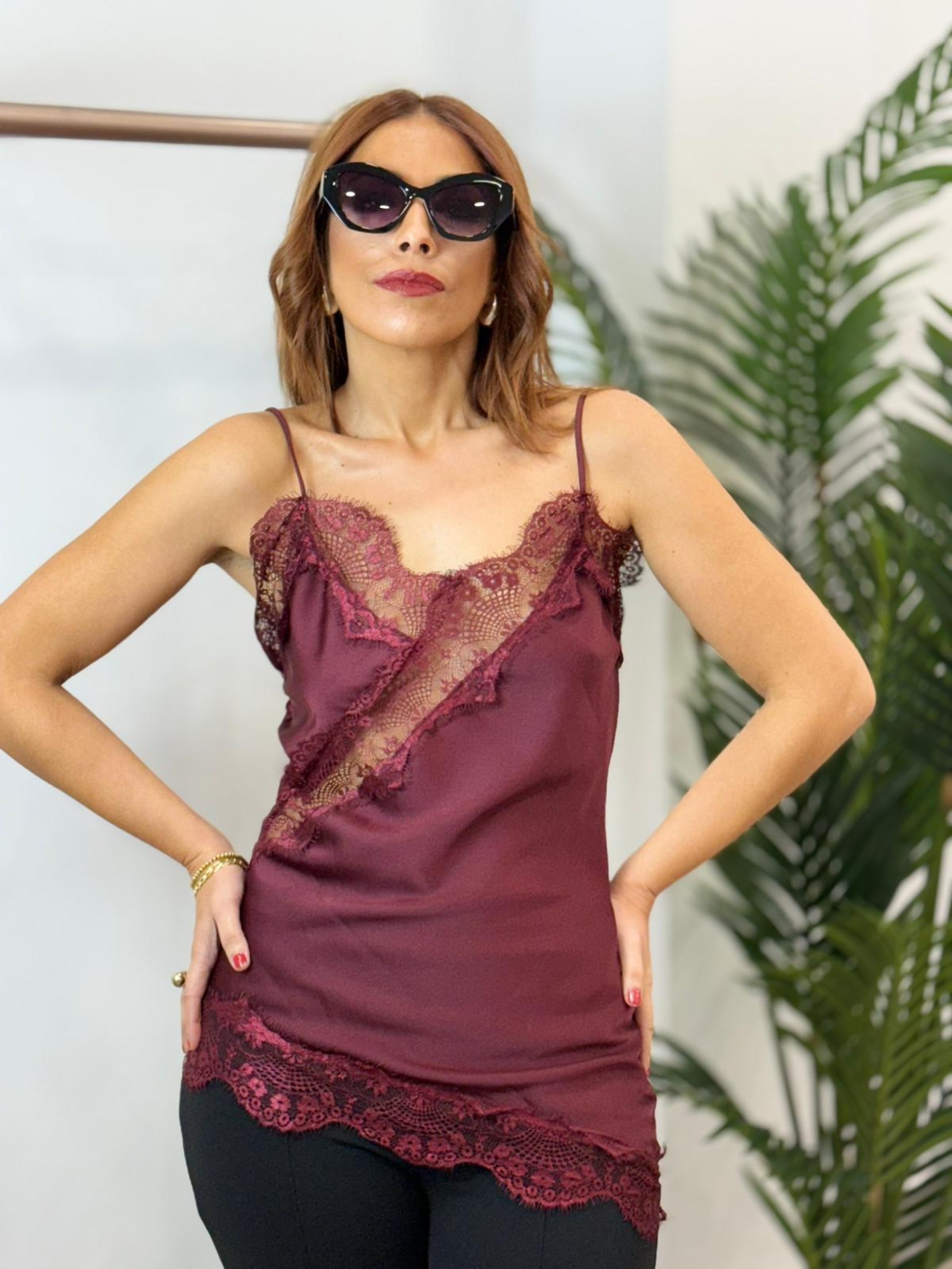 Lencera asimétrica encaje burdeos . Tejido de satén.