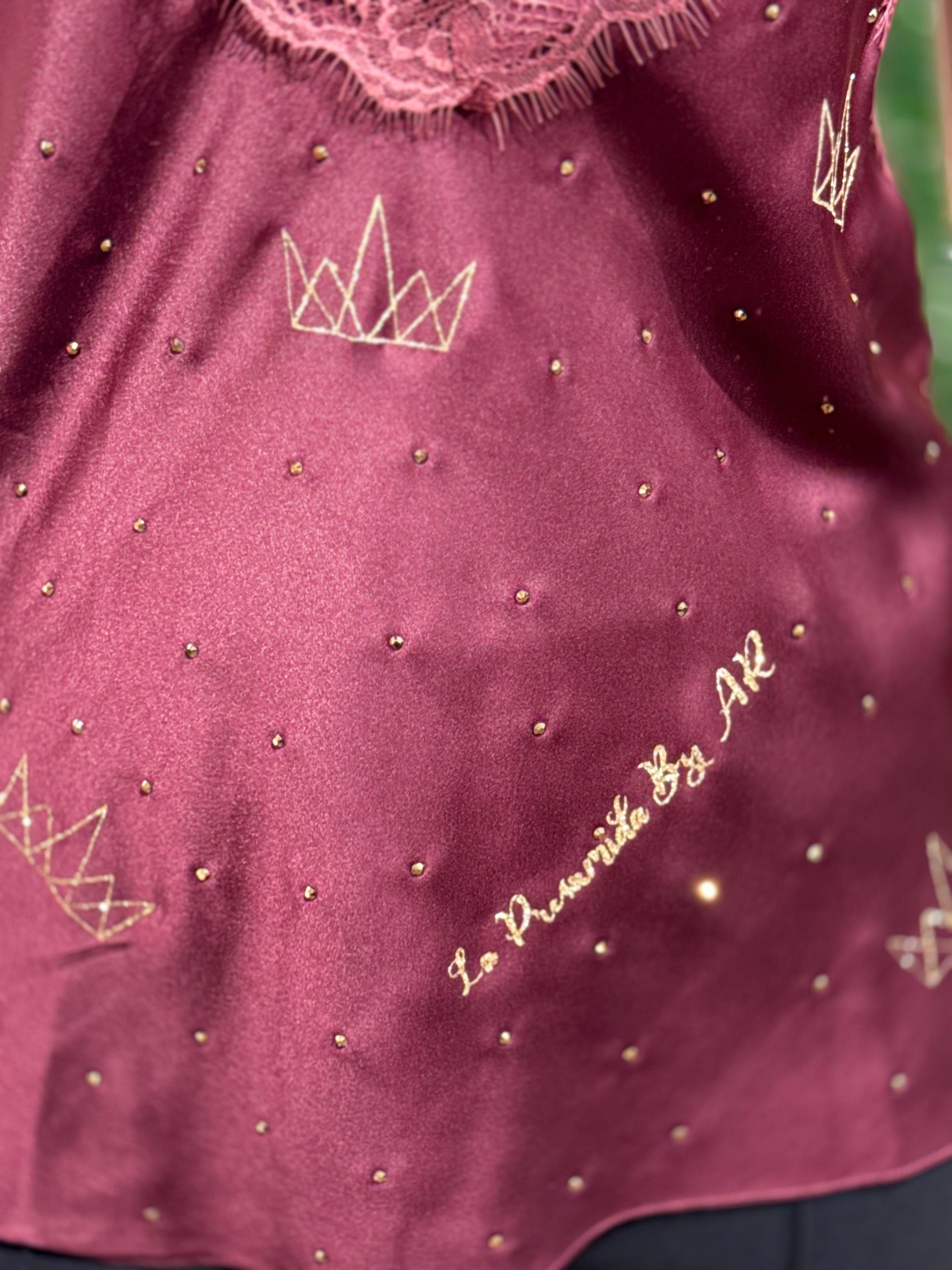 Top lencero diseño LP Granate. Tirantes ajudtsble y encaje en el pecho . Strass y logo en glitter dorado.